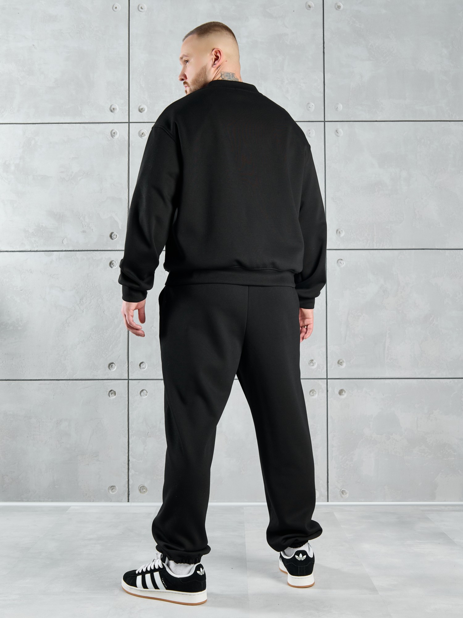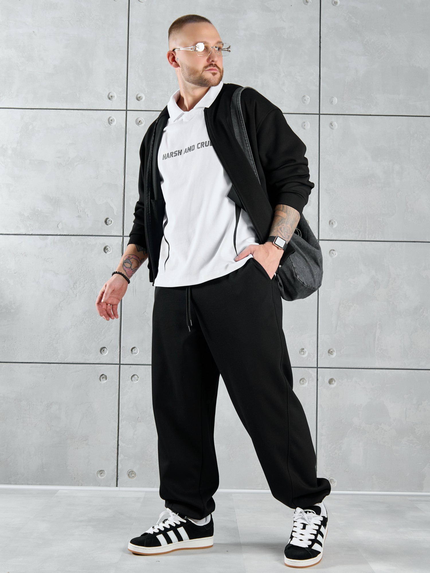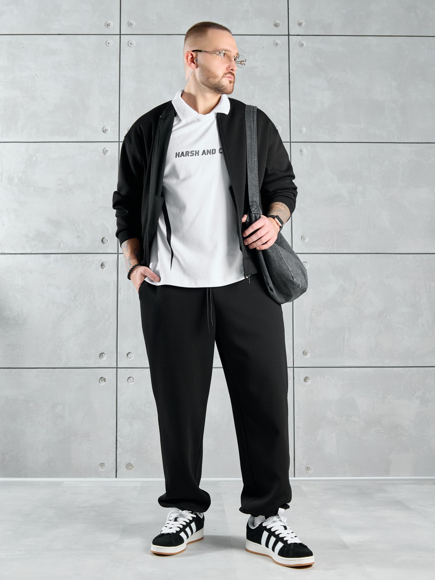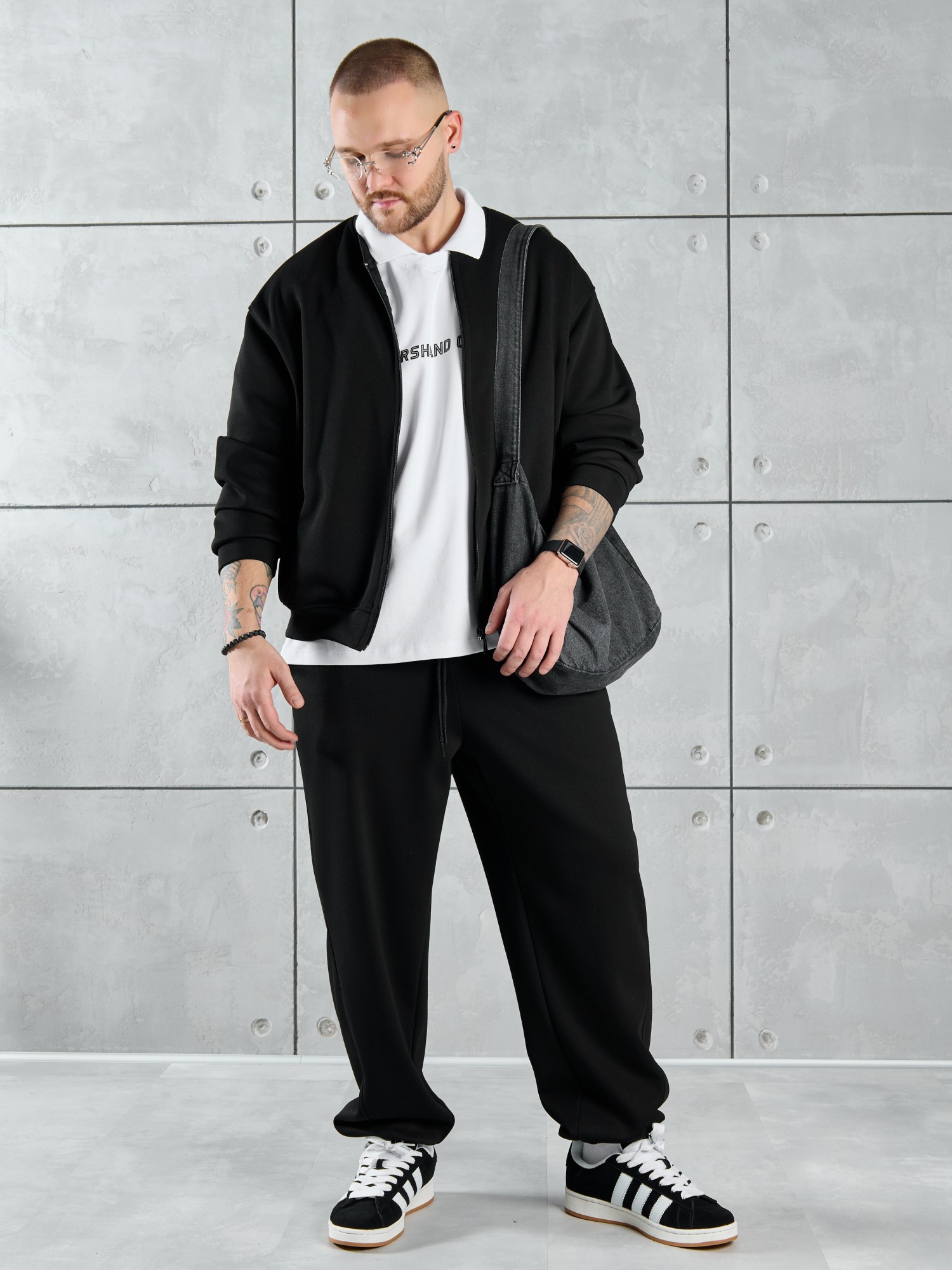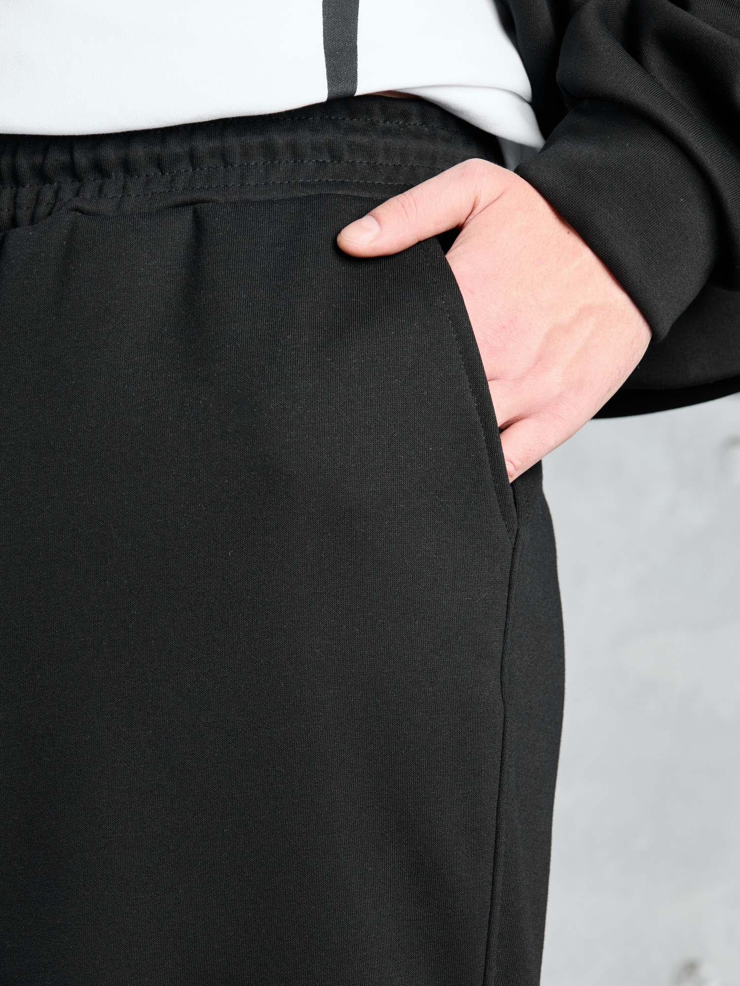 Костюм мужской из трикотажного полотна "лининг", состоящий из бомбера и брюк. Бомбер - с длинными втачными рукавами с притачными манжетами, прорезными карманами с листочками на полочках, центральной бортовой застежкой на тесьму "молния", втачным воротником-стойкой с закругленными концами и притачным поясом по низу. По шву притачивания пояса и проймам настрочены отделочные строчки. Брюки - свободного покроя, со смещенными к центрам передних половин боковыми швами, карманами в боковых швах и притачным поясом с эластичной тесьмой внутри. Нижние срезы обработаны подгибкой с эластичной тесьмой. Для регулирования степени прилегания изделия по талии предусмотрен шнурок, вставленный через две обметанные петли в центре пояса спереди.