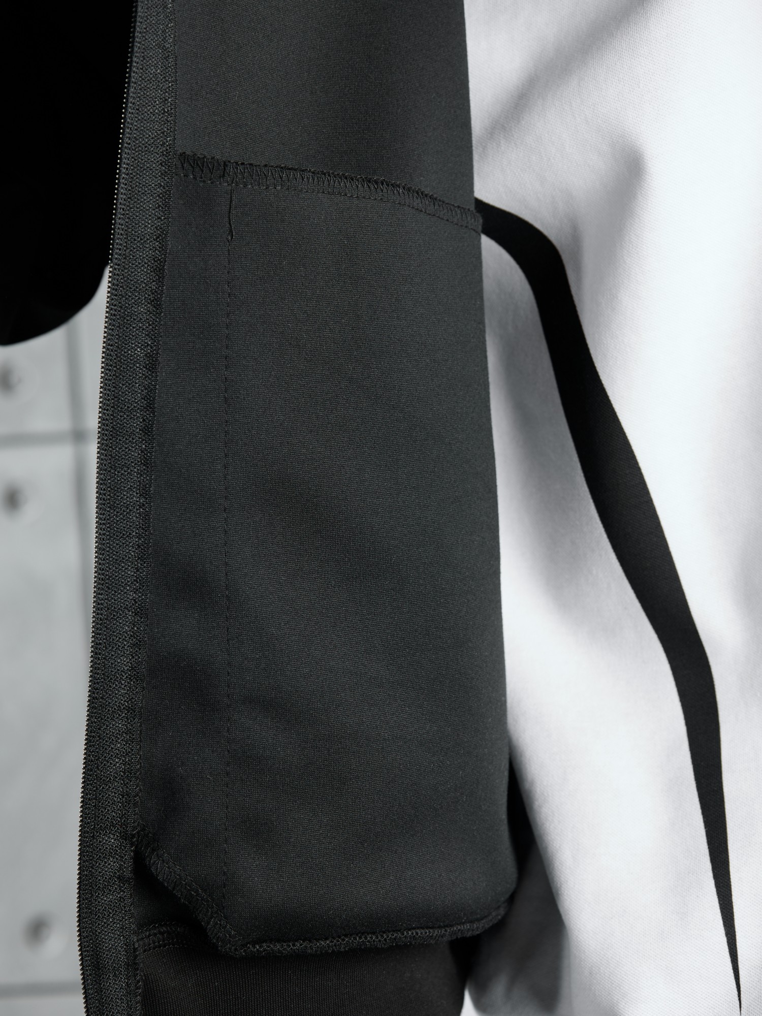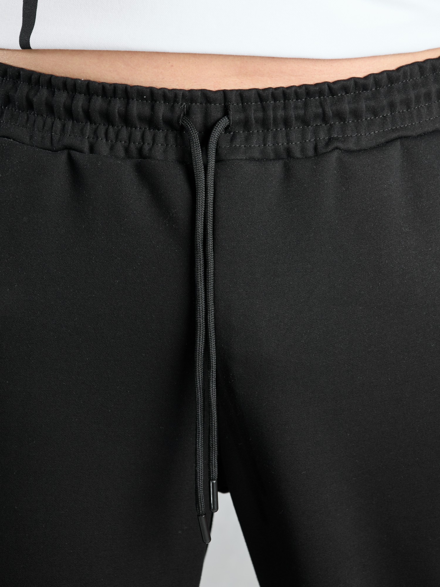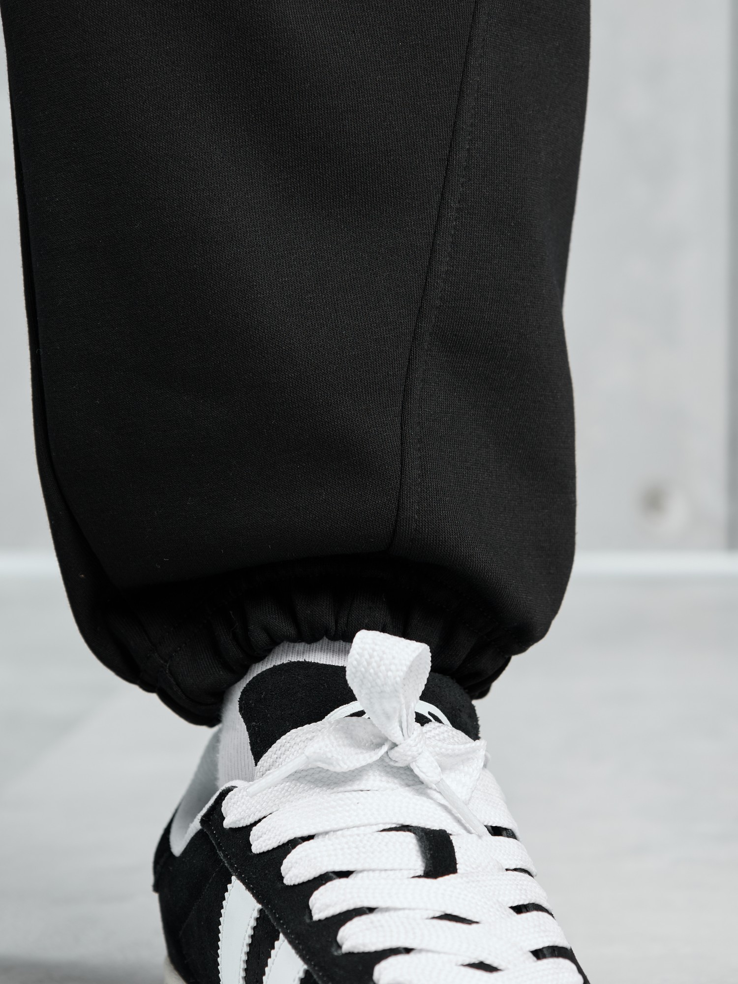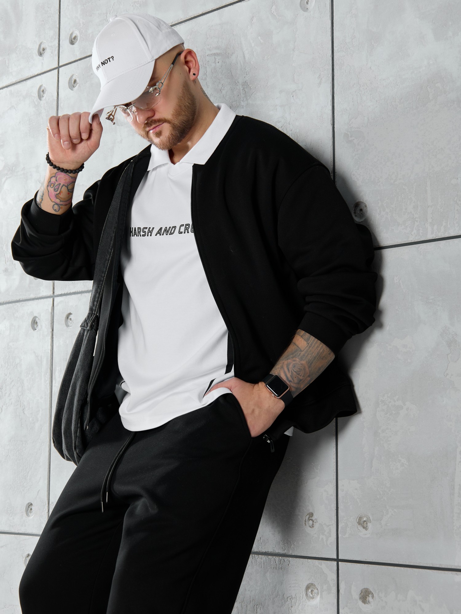 Костюм мужской из трикотажного полотна "лининг", состоящий из бомбера и брюк. Бомбер - с длинными втачными рукавами с притачными манжетами, прорезными карманами с листочками на полочках, центральной бортовой застежкой на тесьму "молния", втачным воротником-стойкой с закругленными концами и притачным поясом по низу. По шву притачивания пояса и проймам настрочены отделочные строчки. Брюки - свободного покроя, со смещенными к центрам передних половин боковыми швами, карманами в боковых швах и притачным поясом с эластичной тесьмой внутри. Нижние срезы обработаны подгибкой с эластичной тесьмой. Для регулирования степени прилегания изделия по талии предусмотрен шнурок, вставленный через две обметанные петли в центре пояса спереди.