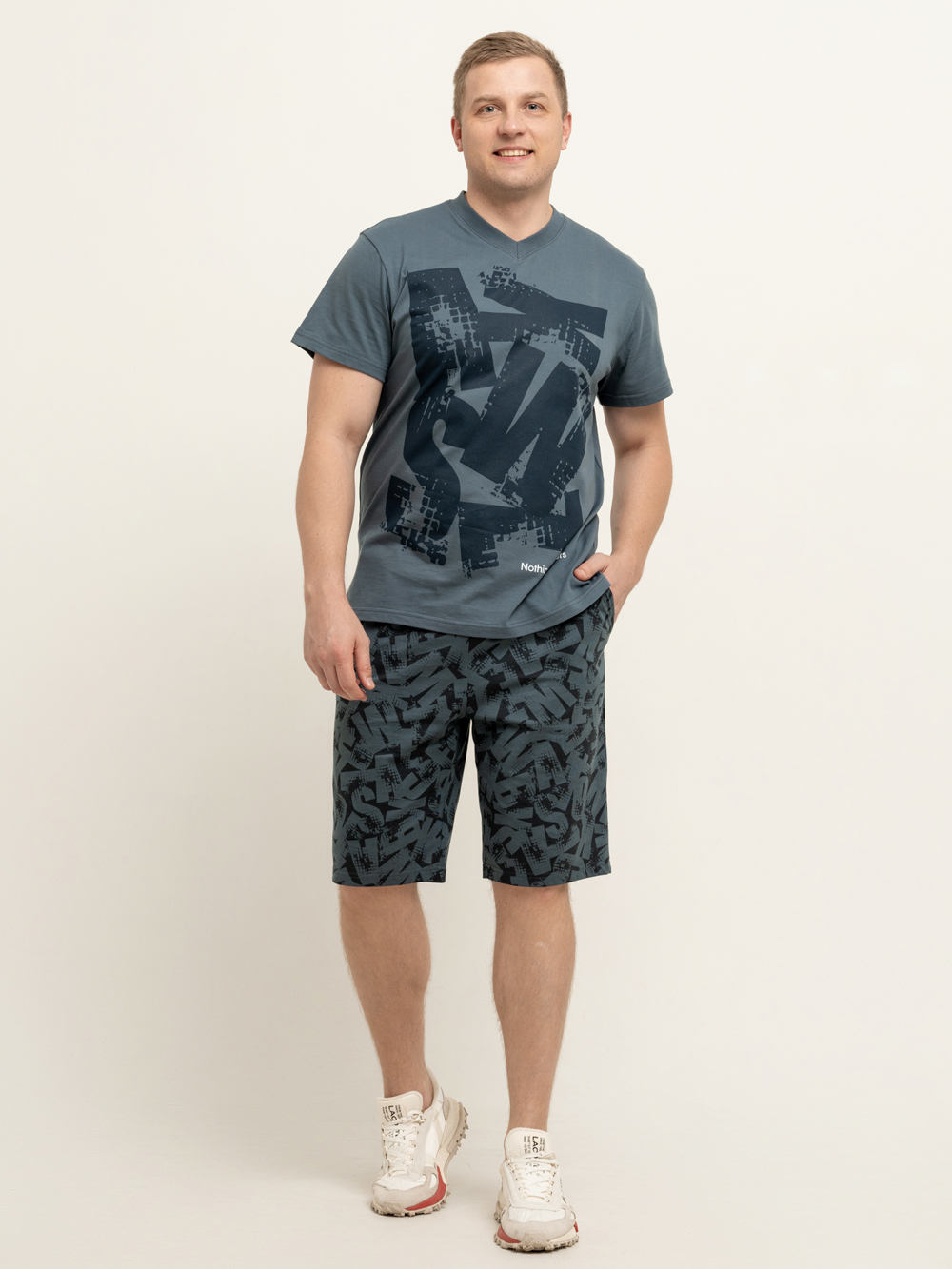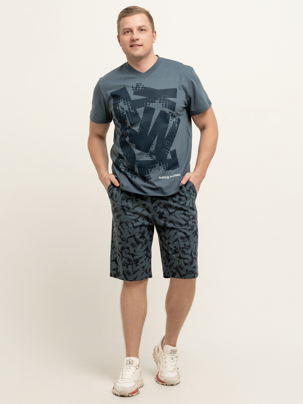 Мужской трикотажный костюм с шортами невероятно удобен, практичен и оригинален. Модель в ярких тонах станет удачным выбором для каждодневного образа. Такие летние костюмы из 100% натурального хлопка отлично подходят для пляжного сезона и для домашнего времяпрепровождения. Трикотажный костюм состоит из футболки свободного кроя с коротким рукавом, эластичная V-образная горловина которой обрабатывается под обтачку, и шорт. Удлинённые шорты с удобными боковыми карманами будут практичны и комфортны в любое время года. Необычным исполнением данной модели является авторский принт. Такой мужской костюм отлично подойдет для дома и отдыха, а также в качестве мужской пижамы, ведь состав - 100% натуральный дышащий хлопок.