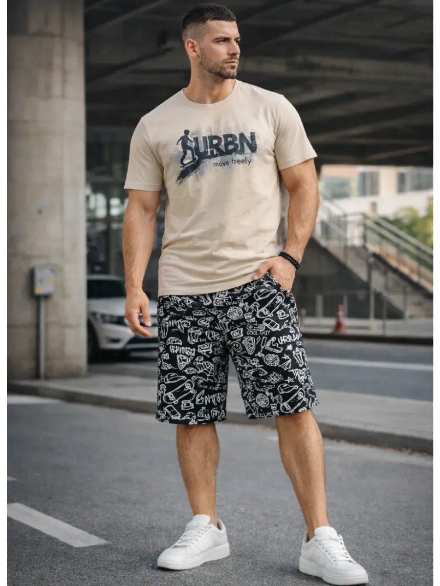 Мужской трикотажный костюм с шортами невероятно удобен, практичен и оригинален. Модель в ярких тонах станет удачным выбором для каждодневного образа. Такие летние костюмы из хлопкового трикотажа отлично подходят для пляжного сезона и для домашнего времяпрепровождения. Трикотажный костюм состоит из футболки с коротким рукавом и шорт. Удлинённые шорты с удобными боковыми карманами будут практичны и комфортны в любое время года. Необычным исполнением данной модели является авторский принт. Такой мужской костюм отлично подойдет для дома и отдыха, а также в качестве мужской пижамы.