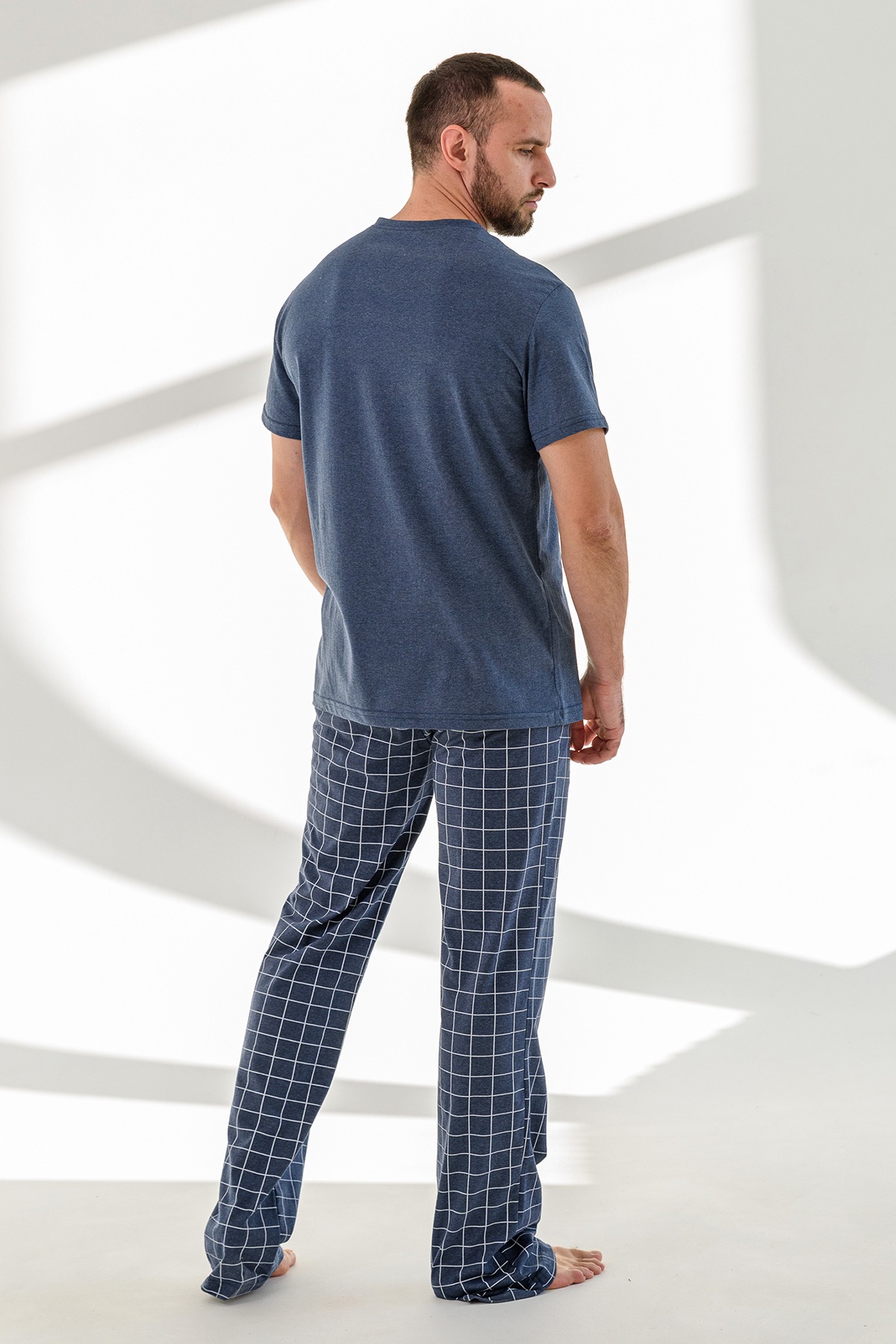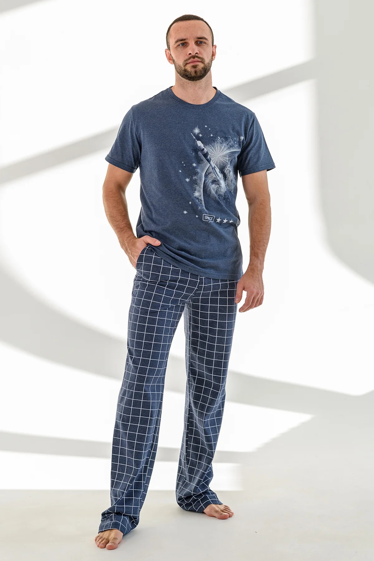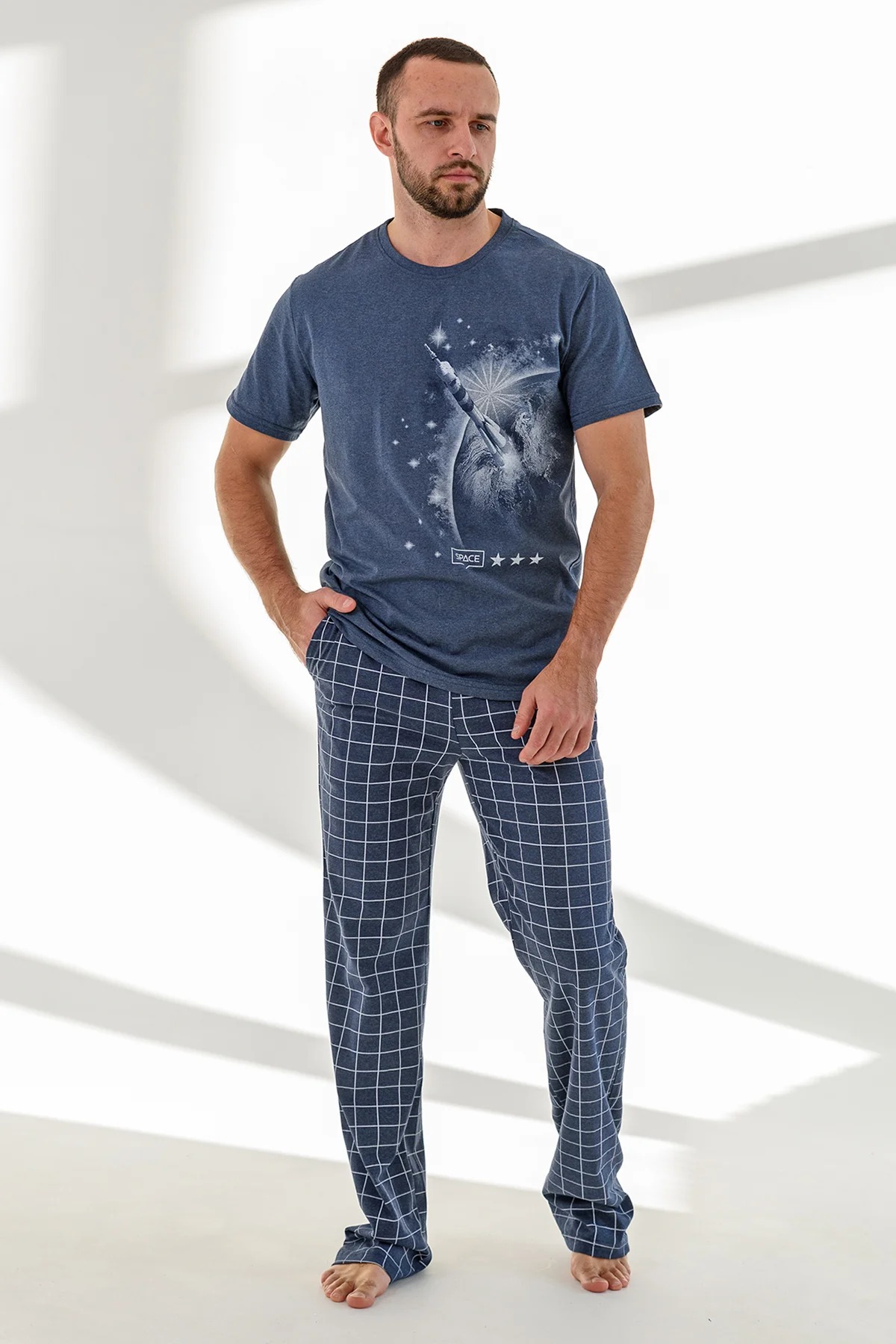 Пижама "Космос" 1341-К состоит из футболки и брюк. Футболка из гладкокрашеного полотна с коротким втачным рукавом. Круглая горловина обработана обтачкой. На полочке принт. Брюки прямого силуэта из набивного полотна с боковыми карманами и цельнокроеным поясом на резинке. Низ изделия обработан швом «в подгибку».