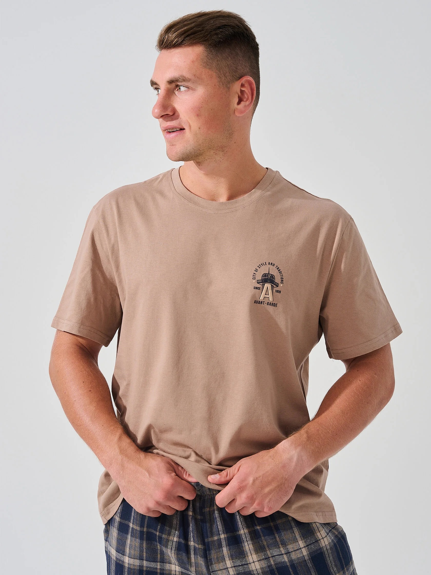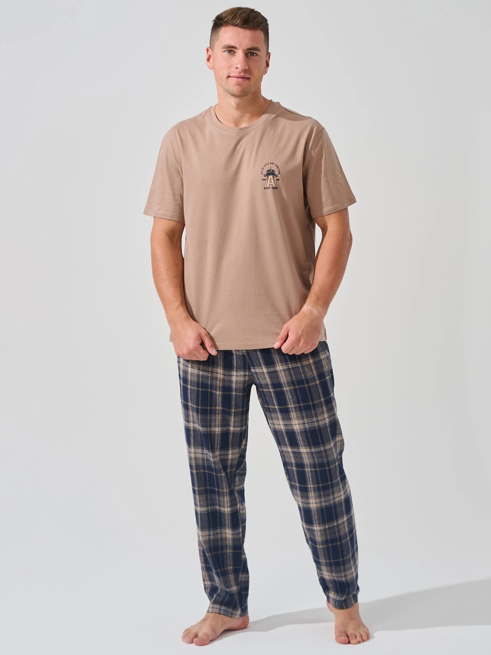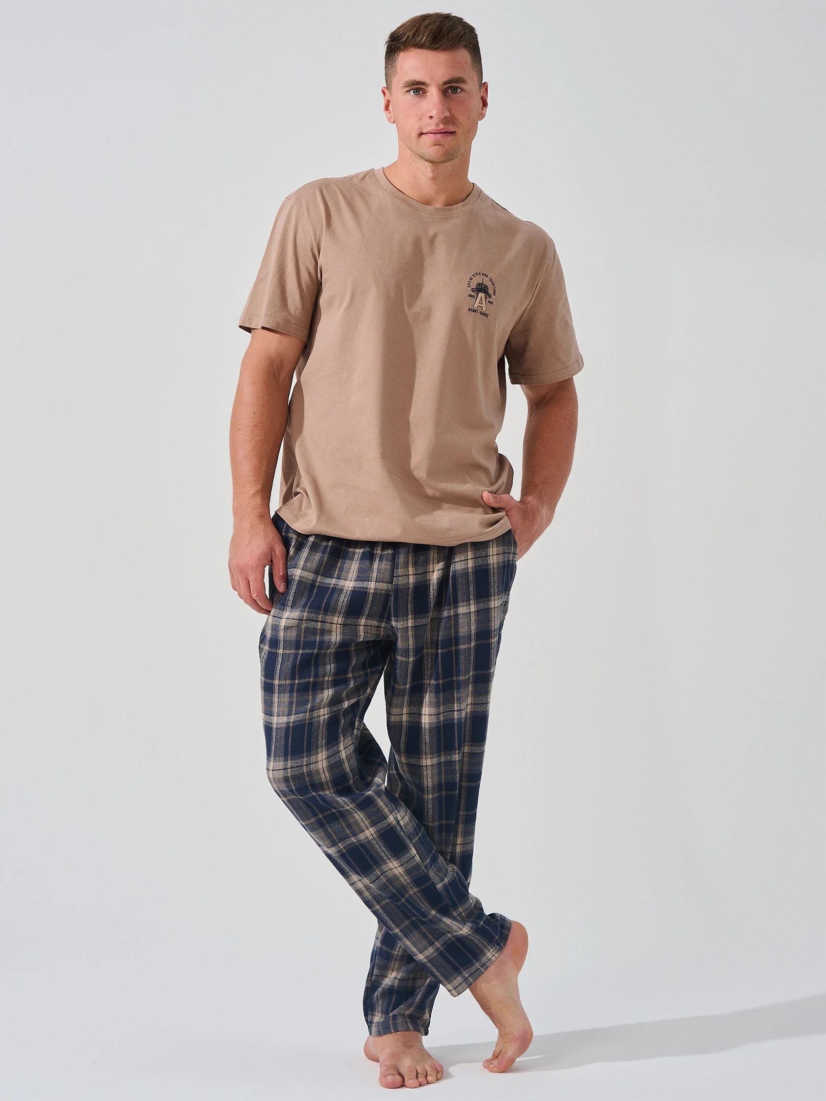 Мужская пижама "Авангард" 2390-К/Ф состоит из футболки и свободных брюк. Мужской костюм отшивается из комбинированных тканей - футболка из кулирки, брюки из фланели.