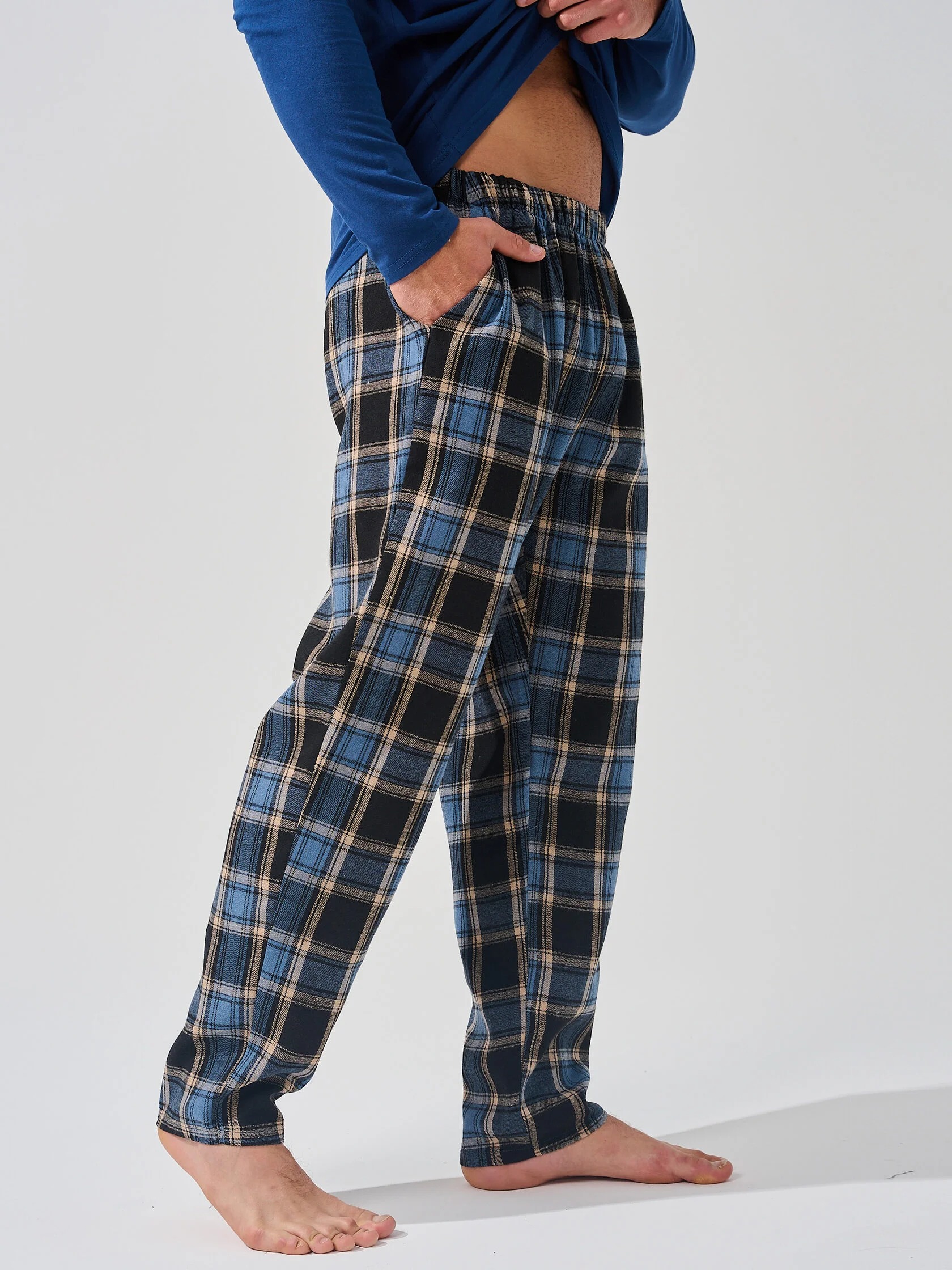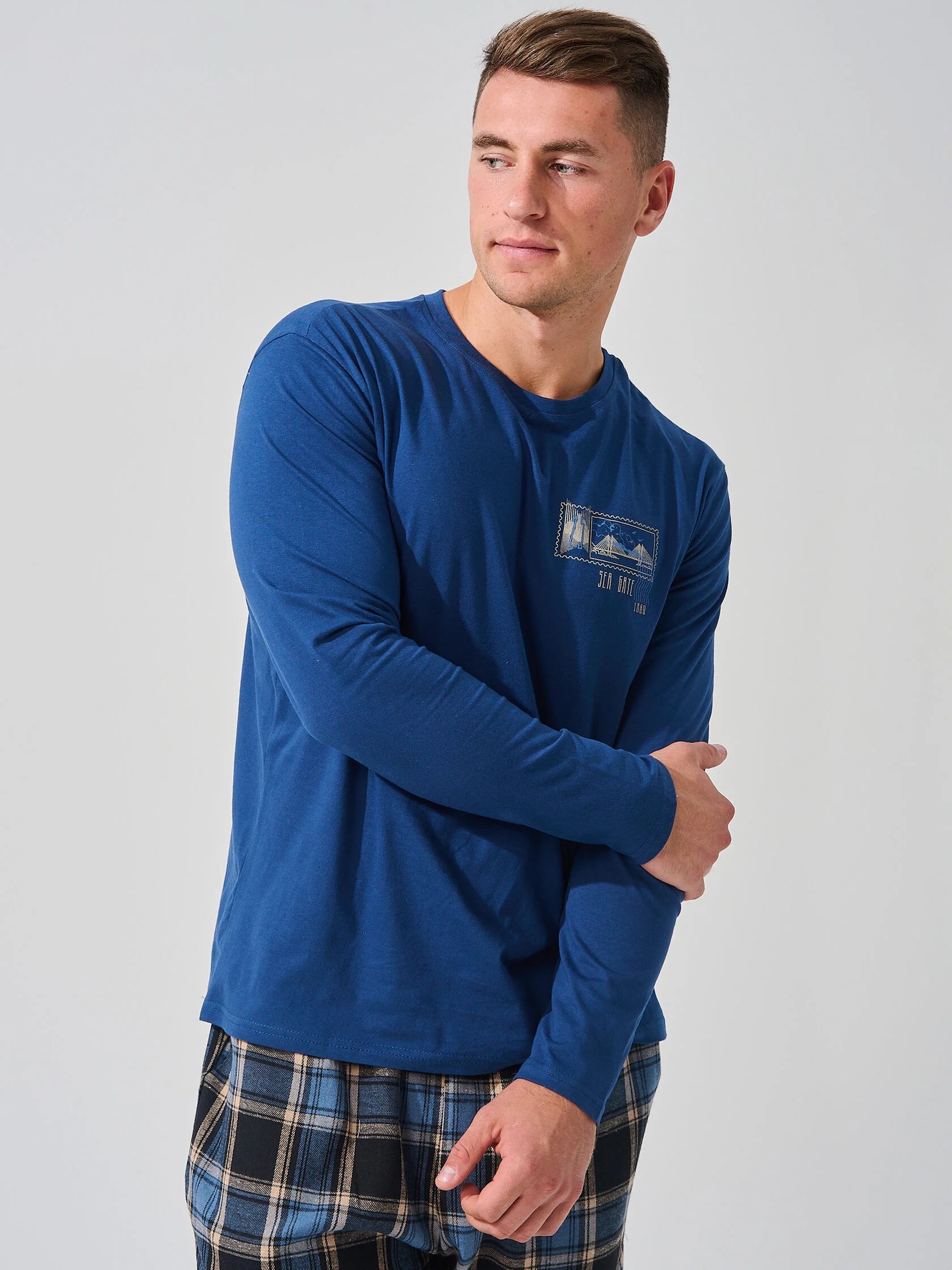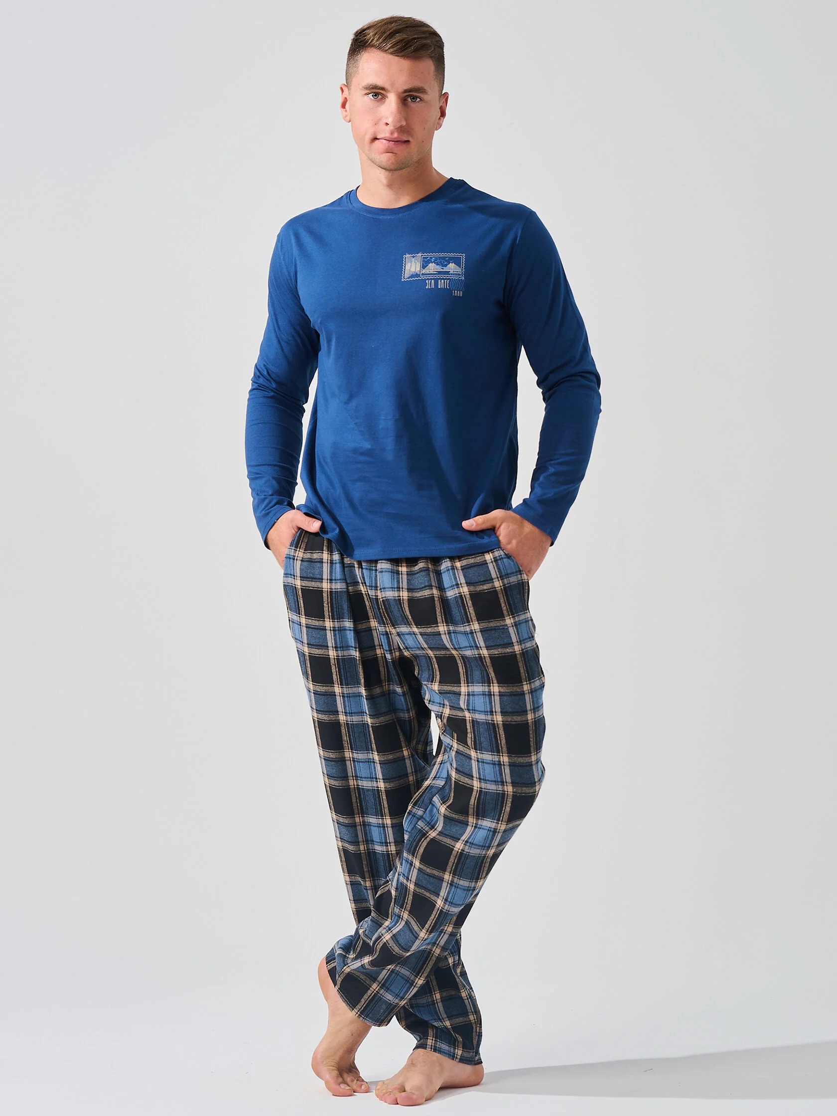 Мужская пижама "Мост" 2397-К/Ф состоит из лонгслива и свободных брюк. Мужской костюм отшивается из комбинированных тканей - верх из кулирки, брюки из фланели.