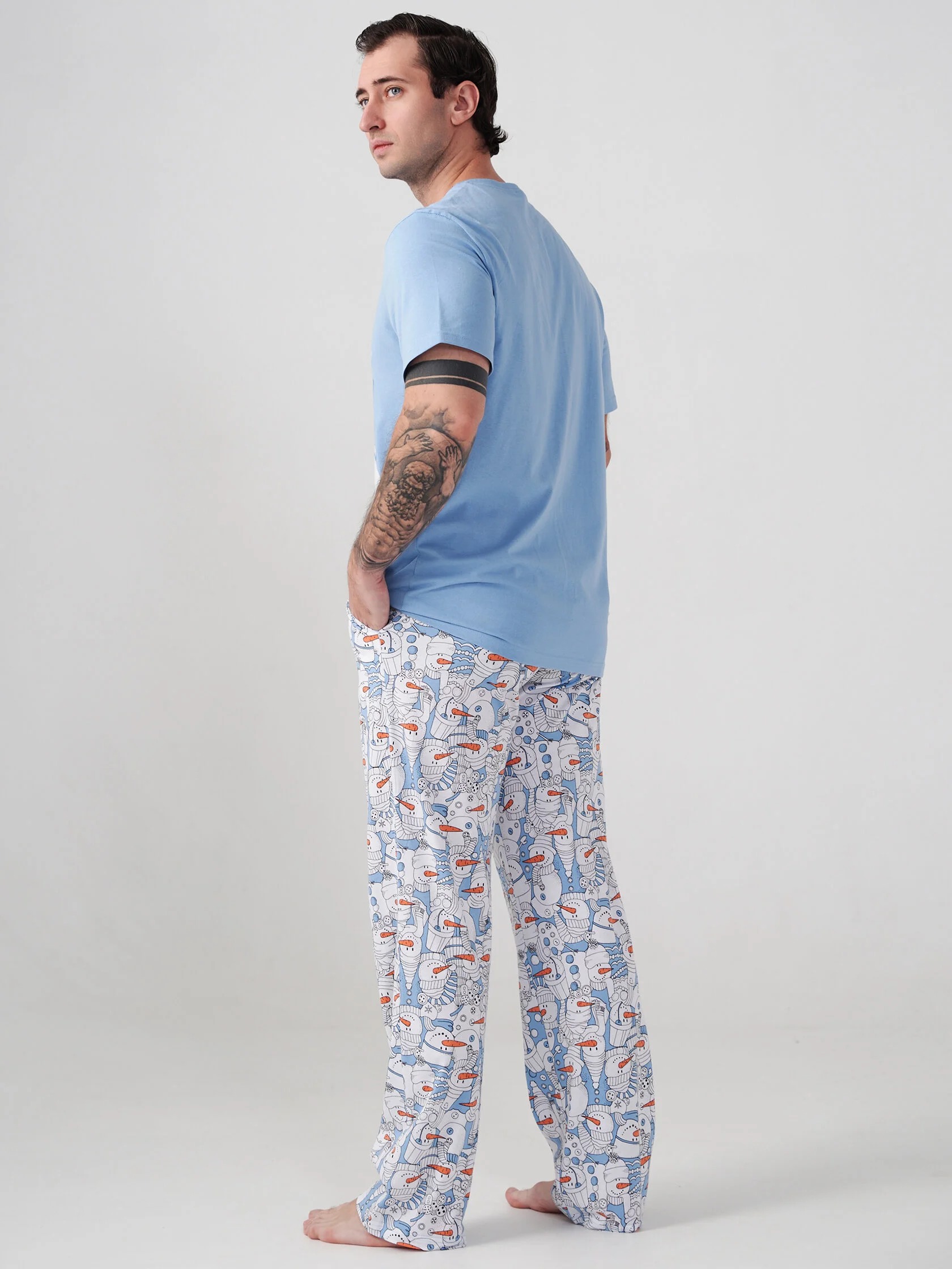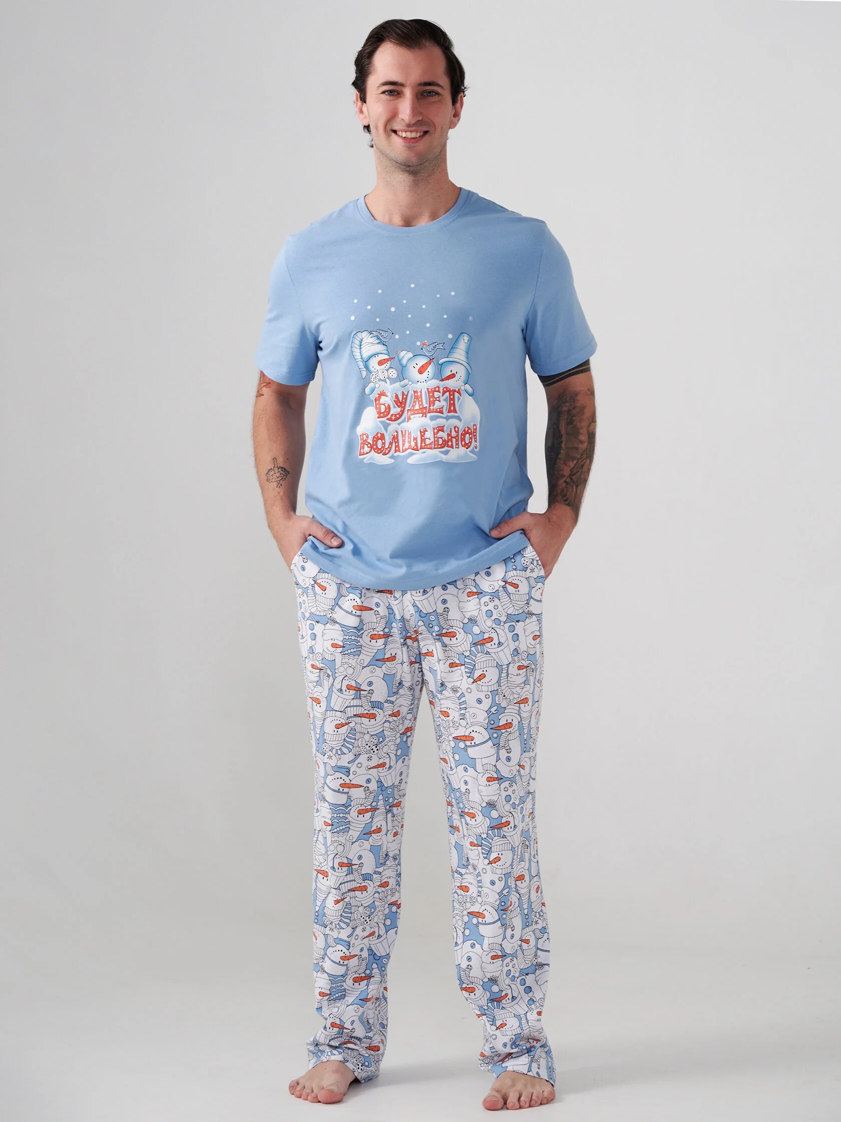 Мужская пижама "Снеговик" 2413-К / Голубой представляет собой стильный домашний комплект, состоящий из футболки и длинных брюк. Модель выполнена из натурального хлопка, что обеспечивает максимальный комфорт при носке.