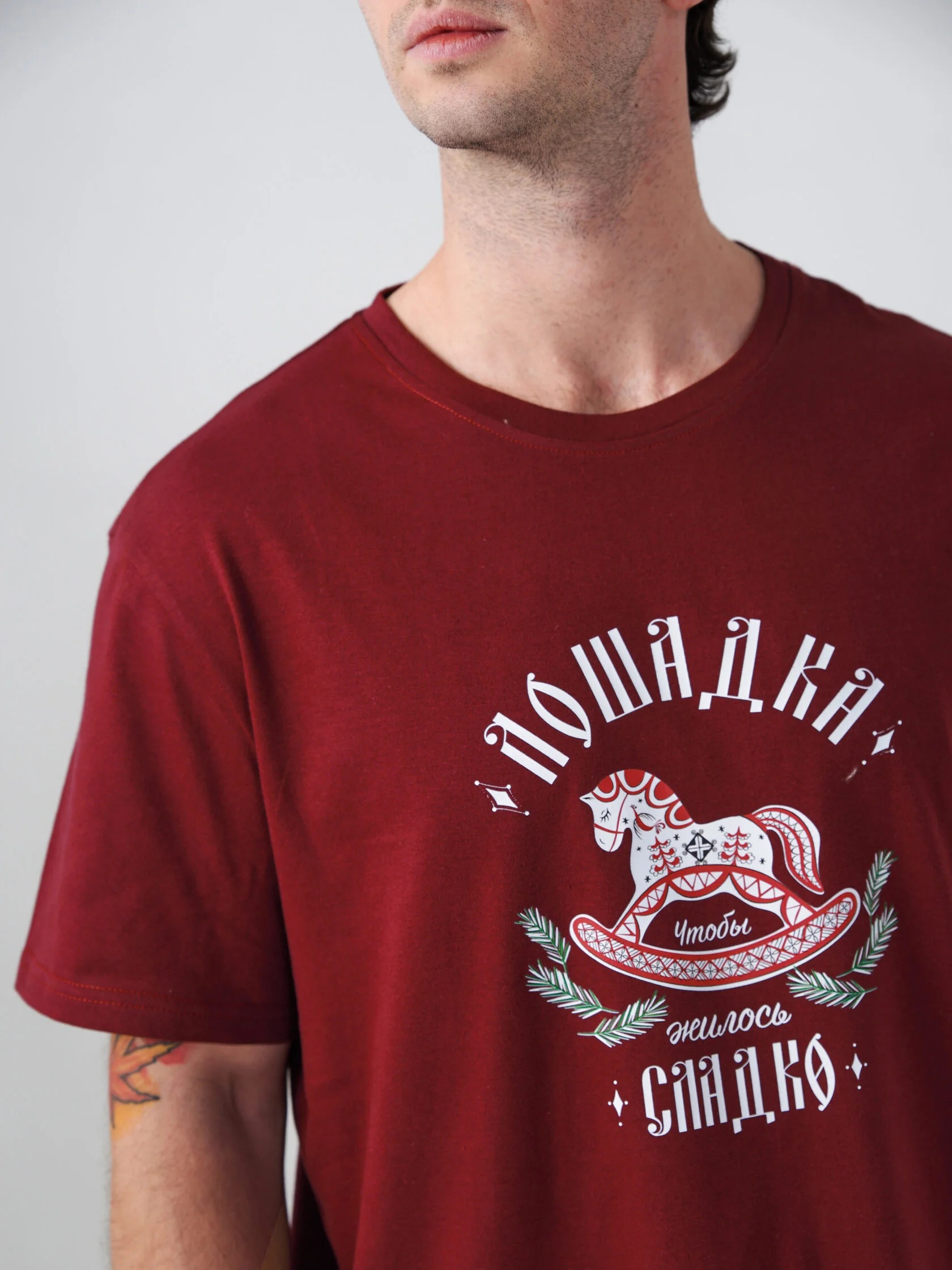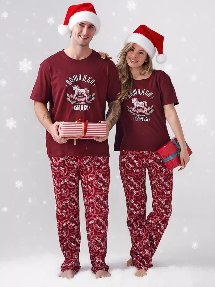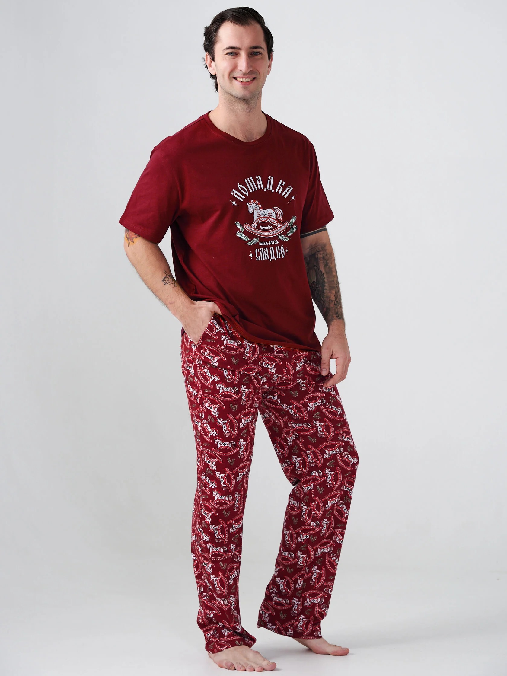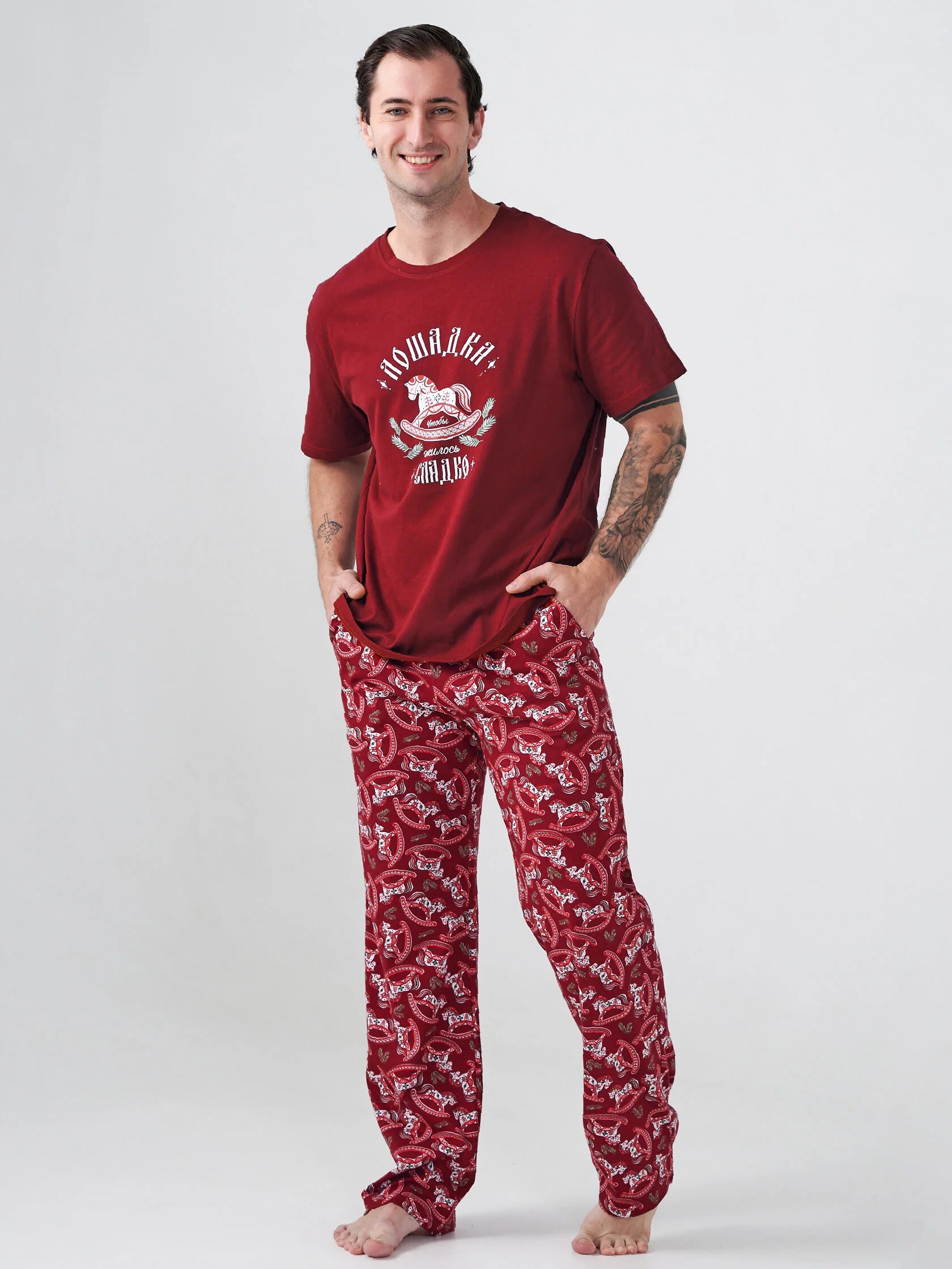 Мужская пижама "Лошадка" 2415-К / Бордовый представляет собой стильный домашний комплект, состоящий из футболки и длинных брюк. Модель выполнена из натурального хлопка, что обеспечивает максимальный комфорт при носке.