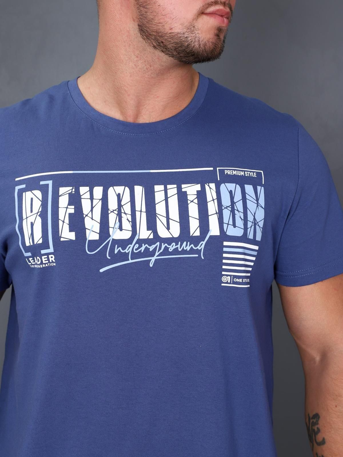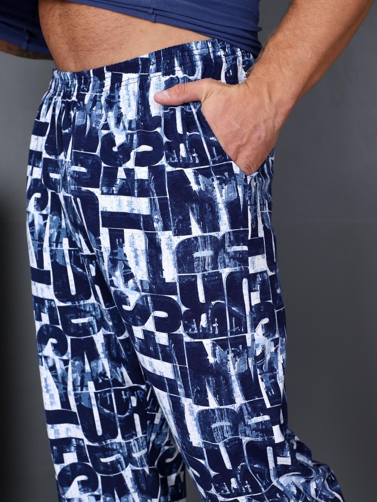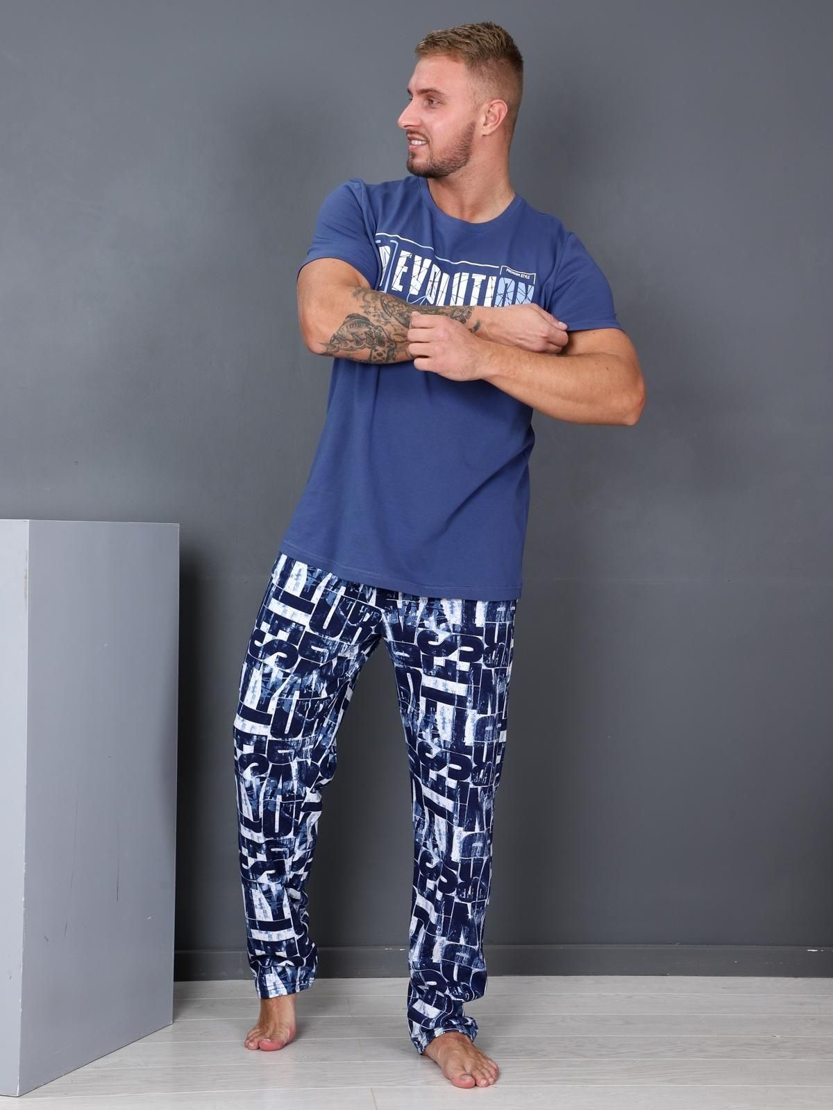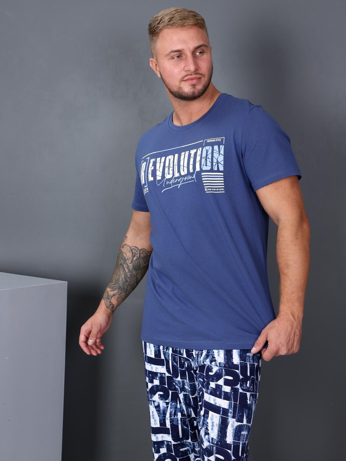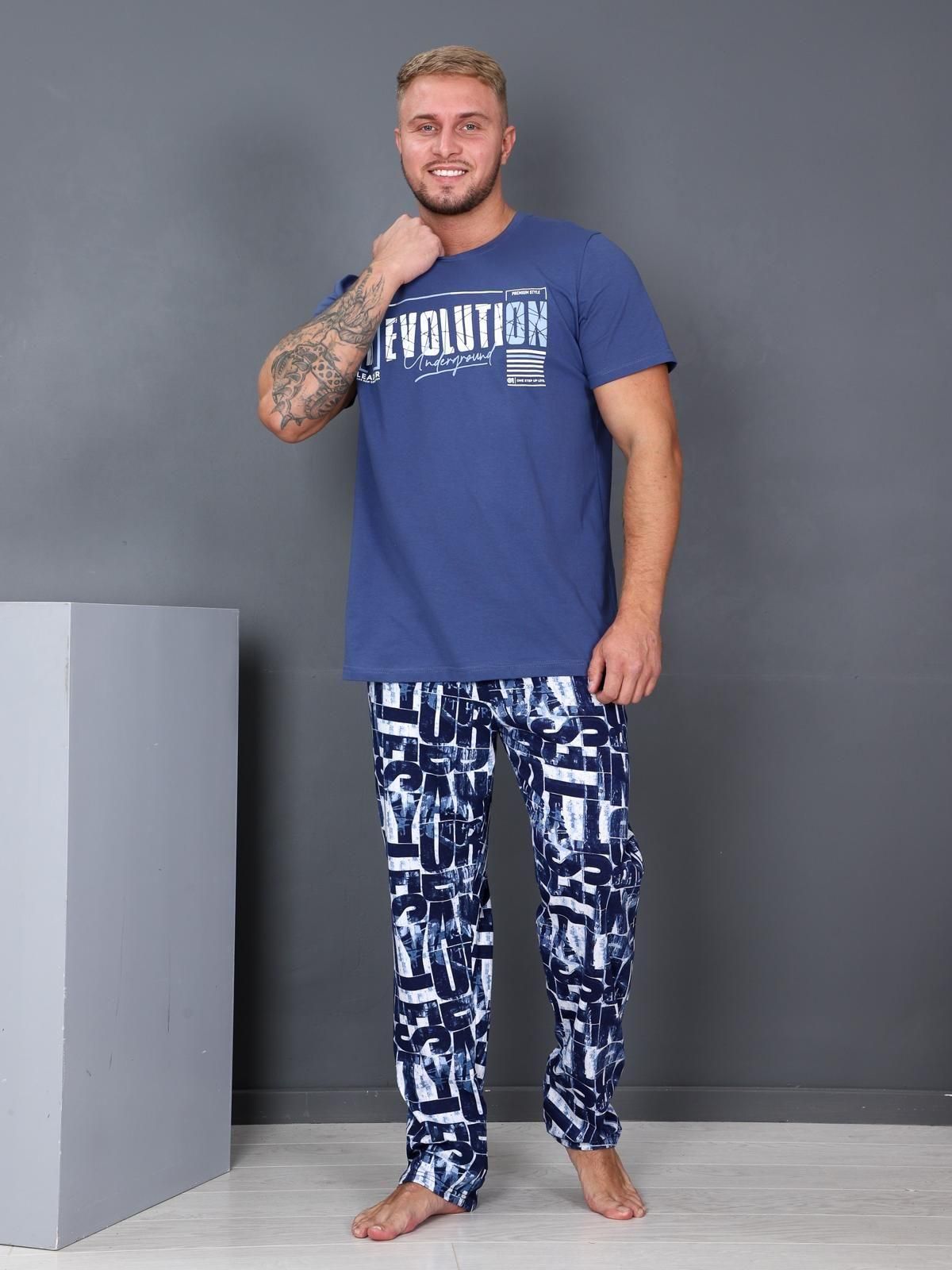 Пижама состоит из футболки и брюк. При пошиве использовано трикотажное полотно- кулирка. Футболка мужская с втачным коротким рукавом. На полочке — принт «Revolution». Горловина обработана обтачкой в цвет изделия. Низ рукава и низ изделия обработаны швом в подгибку.