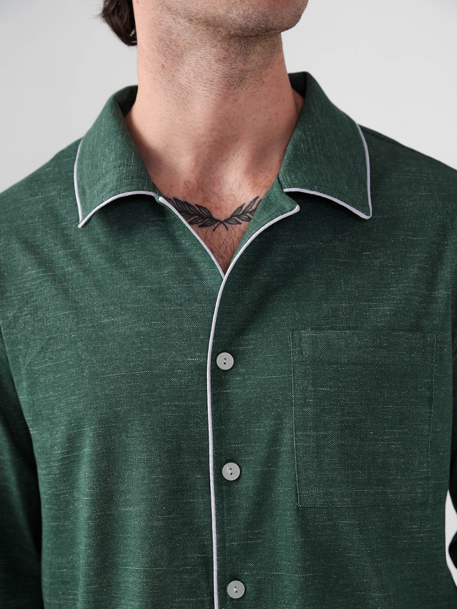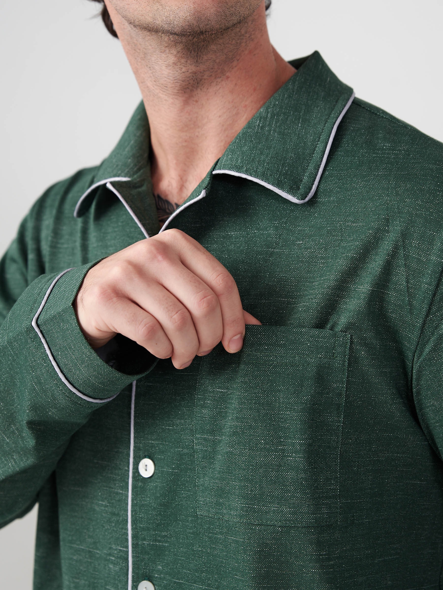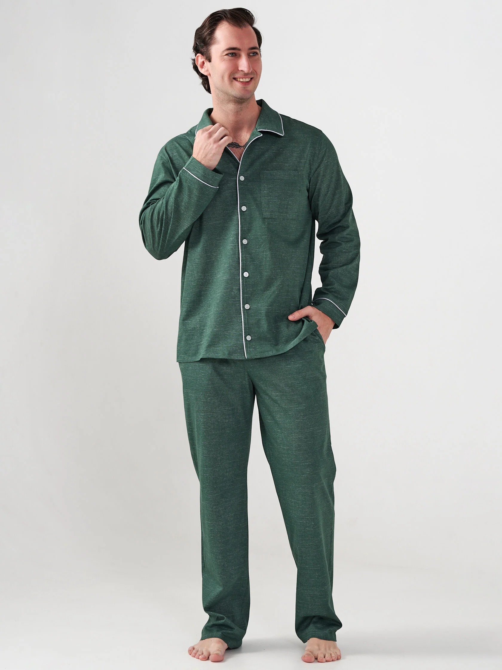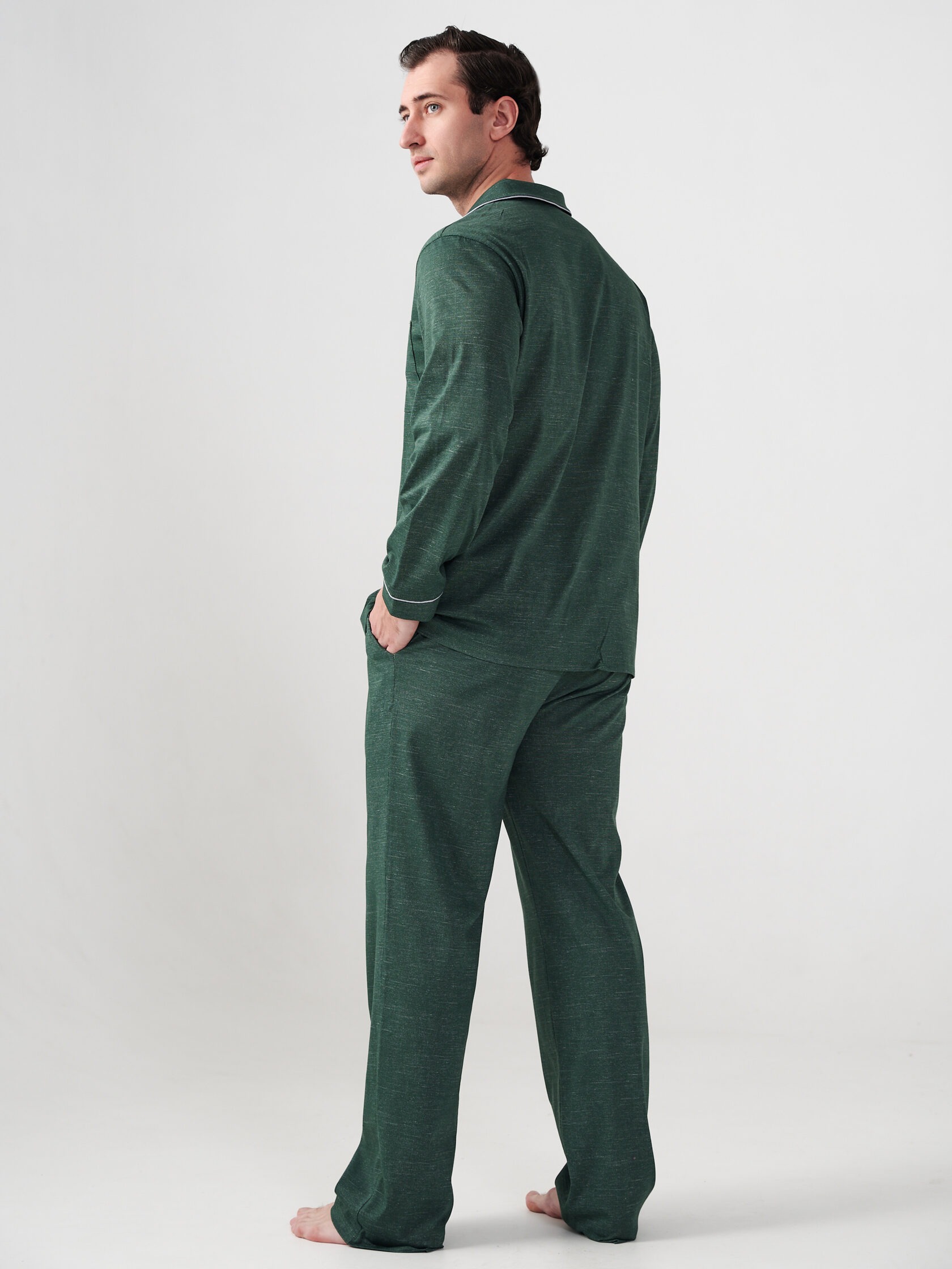 Пижама мужская "Лен" (классическая) 2417-К / Зеленый состоит из пижамной куртки и брюк.