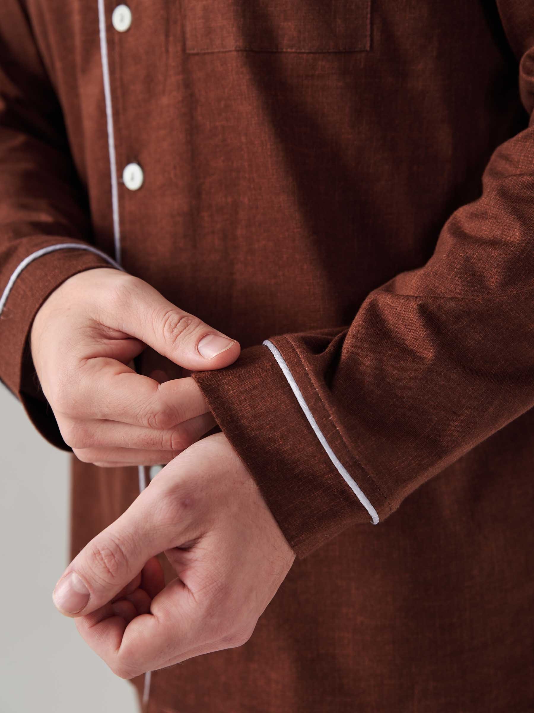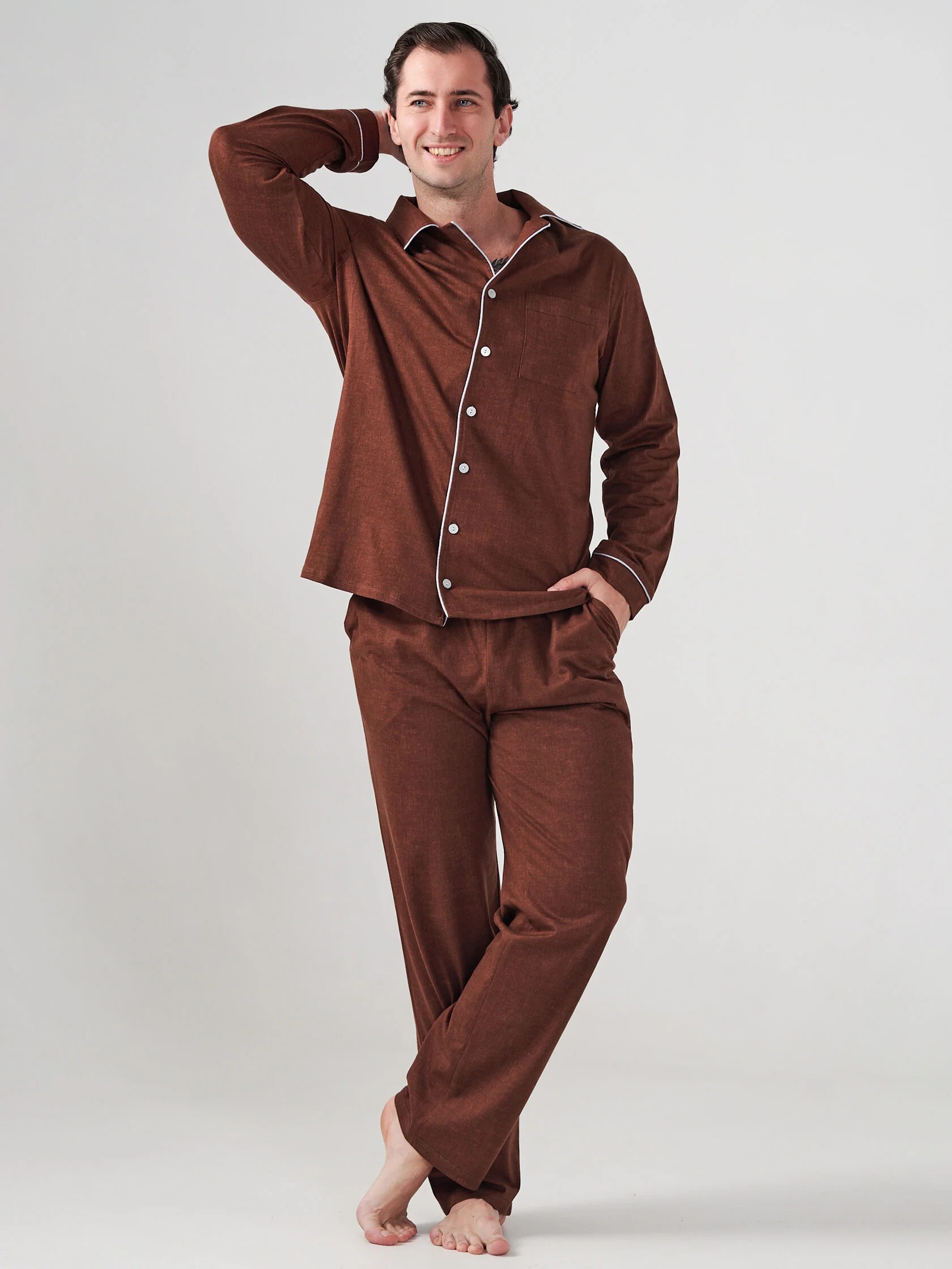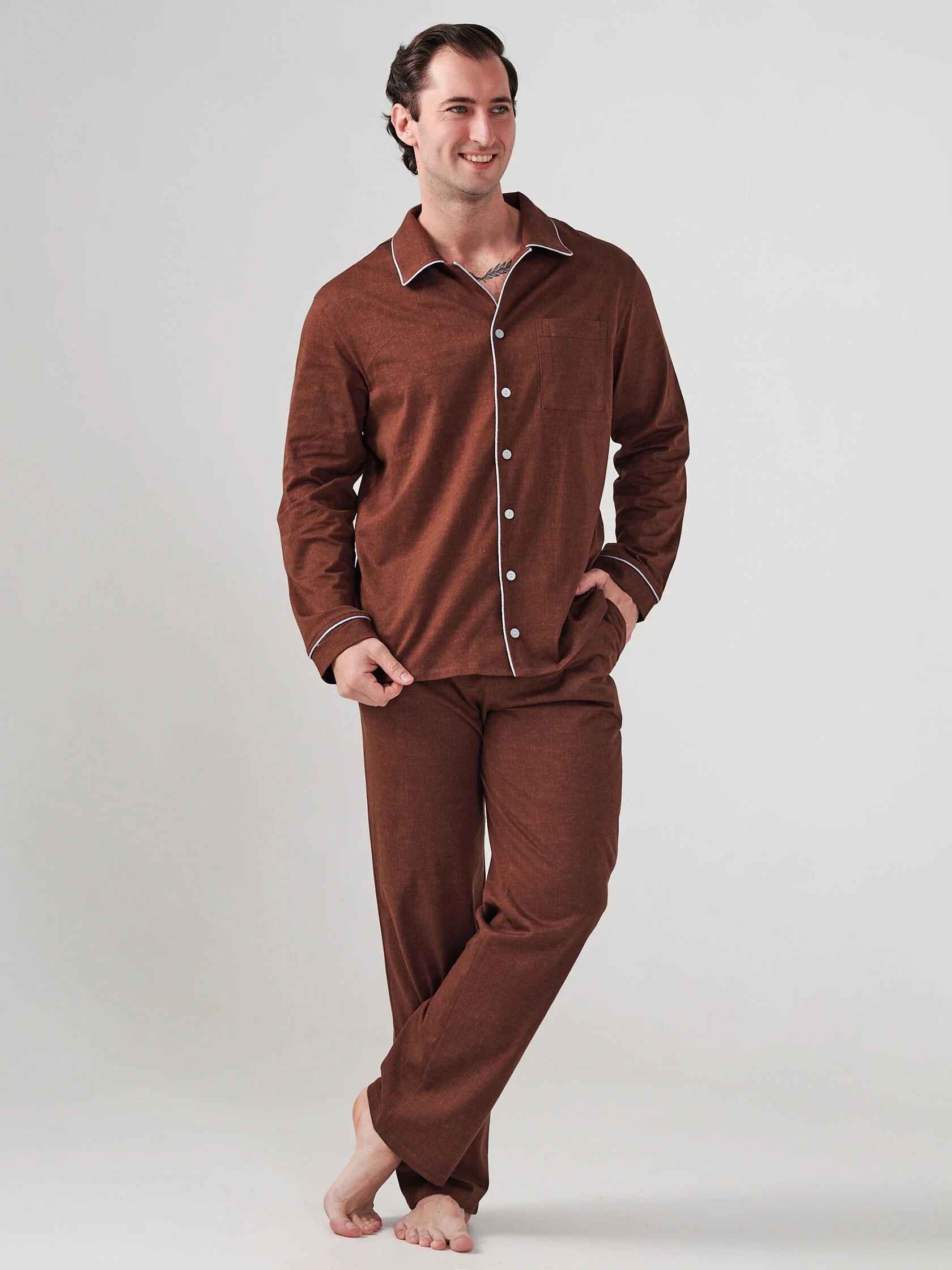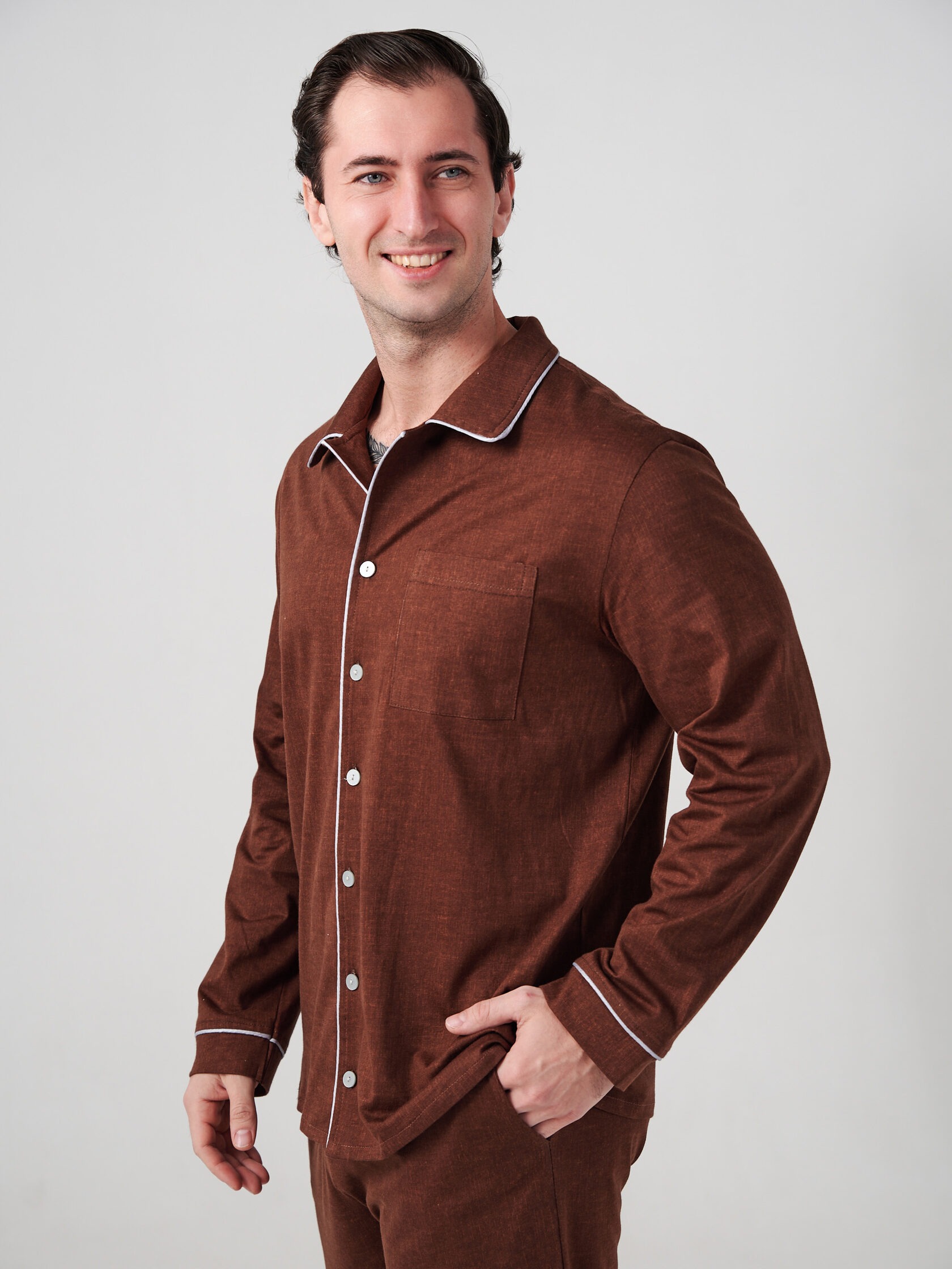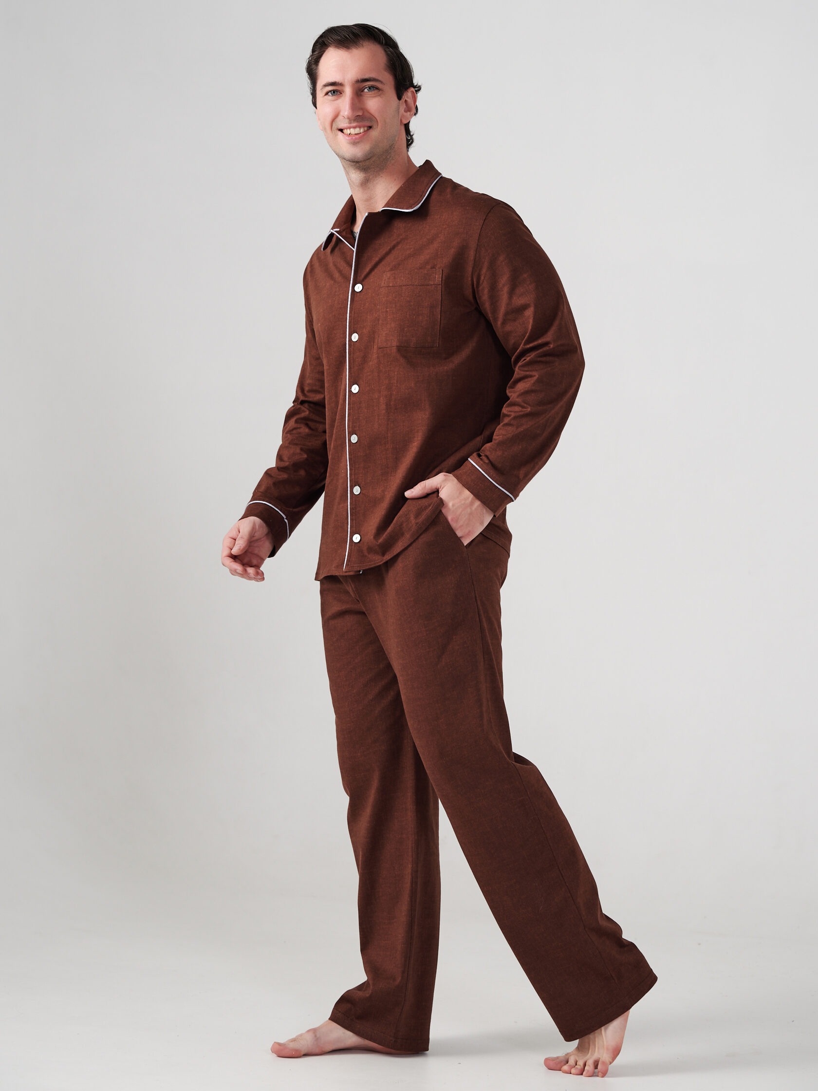 Пижама мужская "Лен" (классическая) 2417-К / Зеленый состоит из пижамной куртки и брюк.