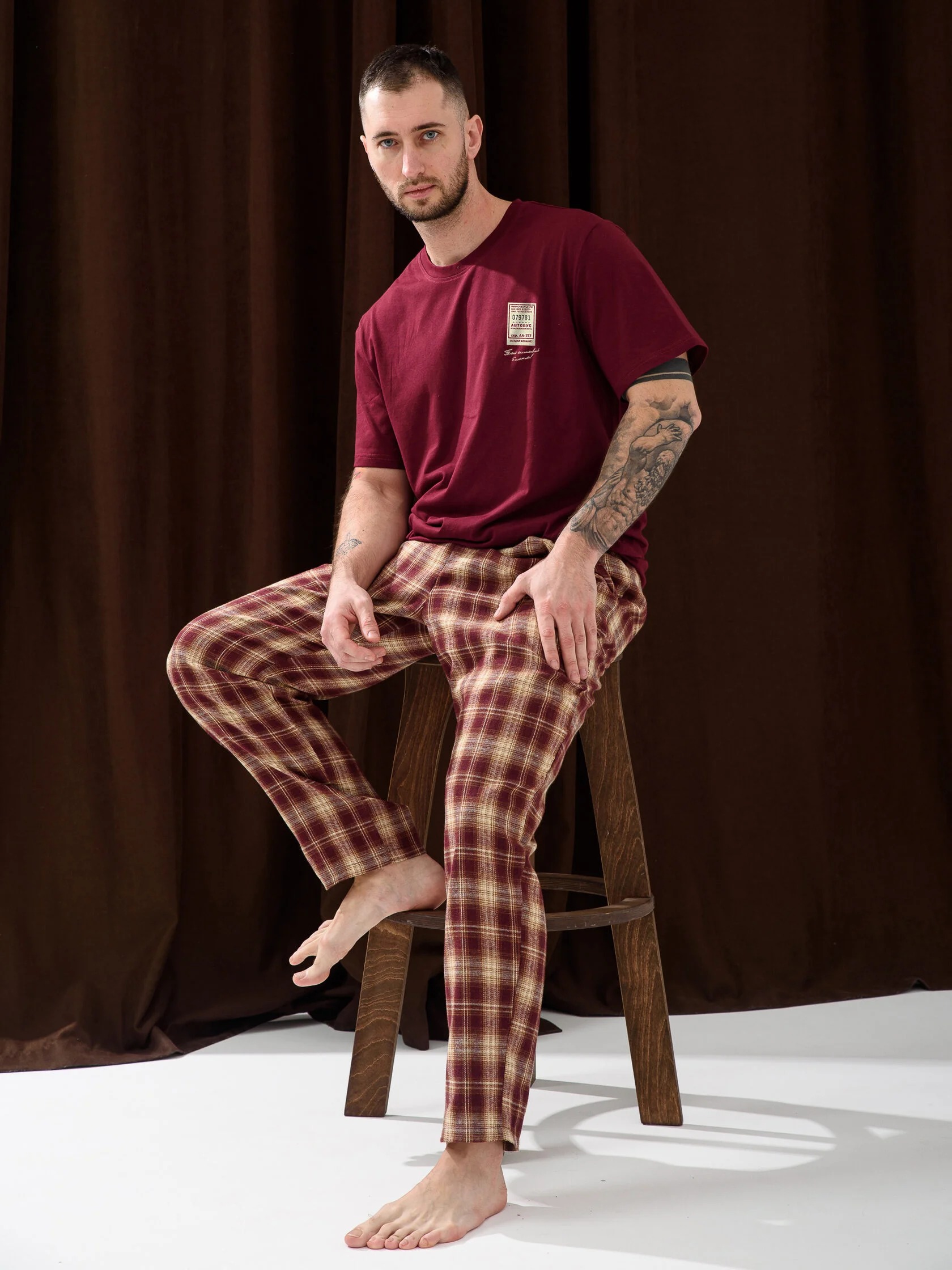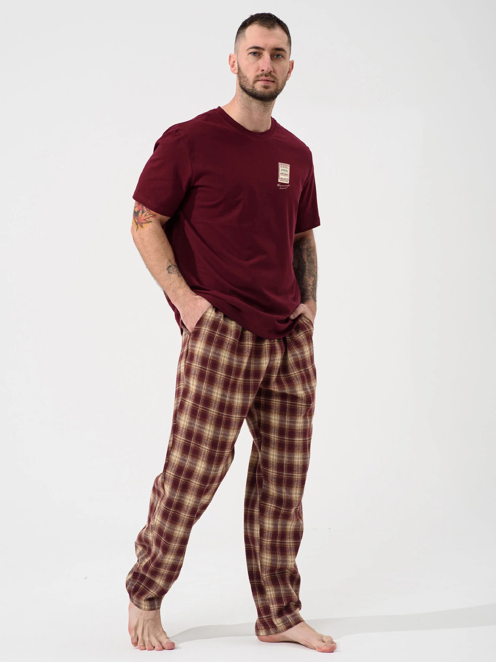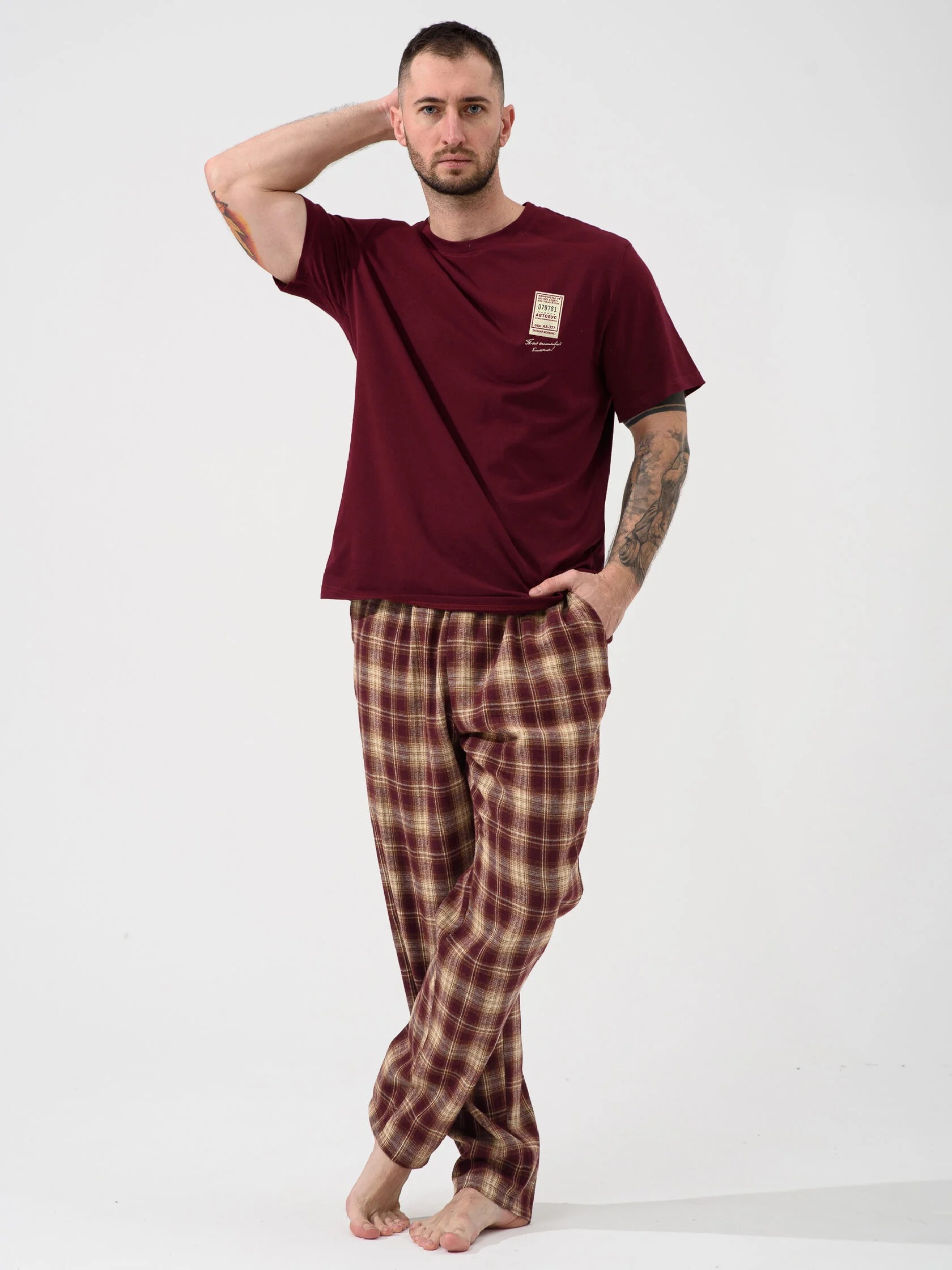Мужская пижама "Счастливый билет" 2434-К/Ф / Бордовый состоит из футболки и свободных брюк. Мужской костюм отшивается из комбинированных тканей - футболка из кулирки, брюки из фланели.