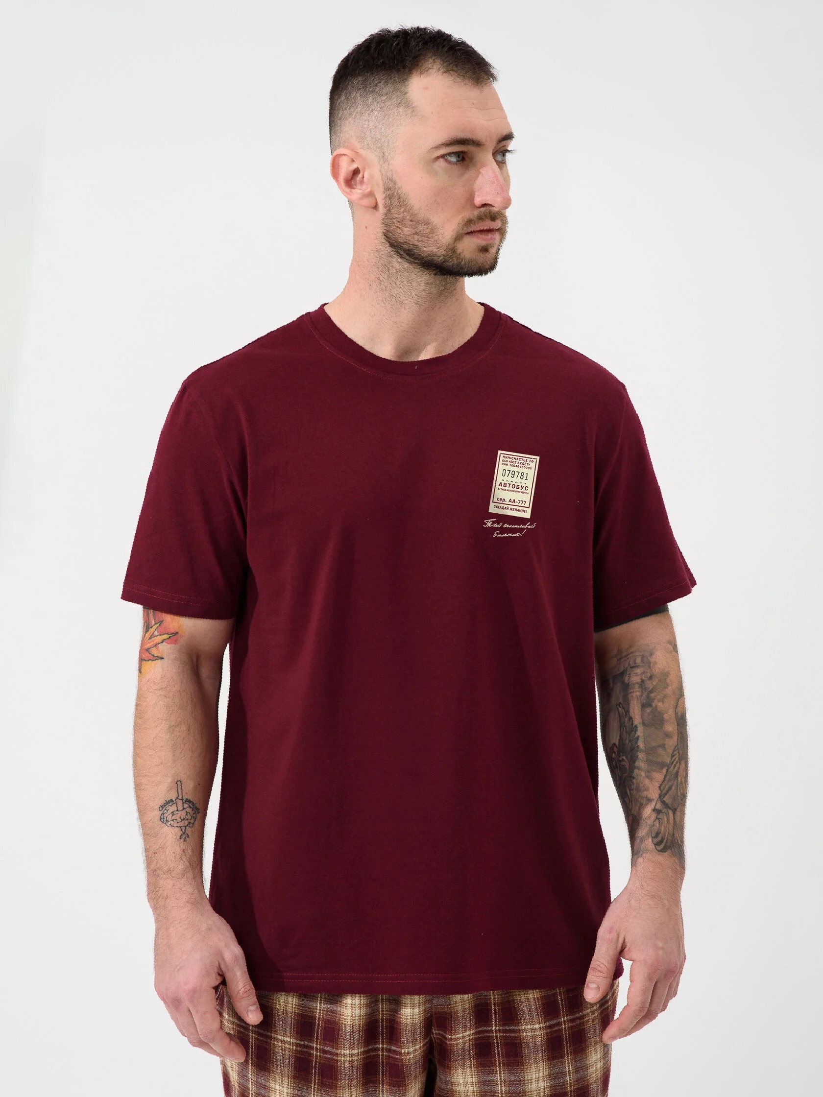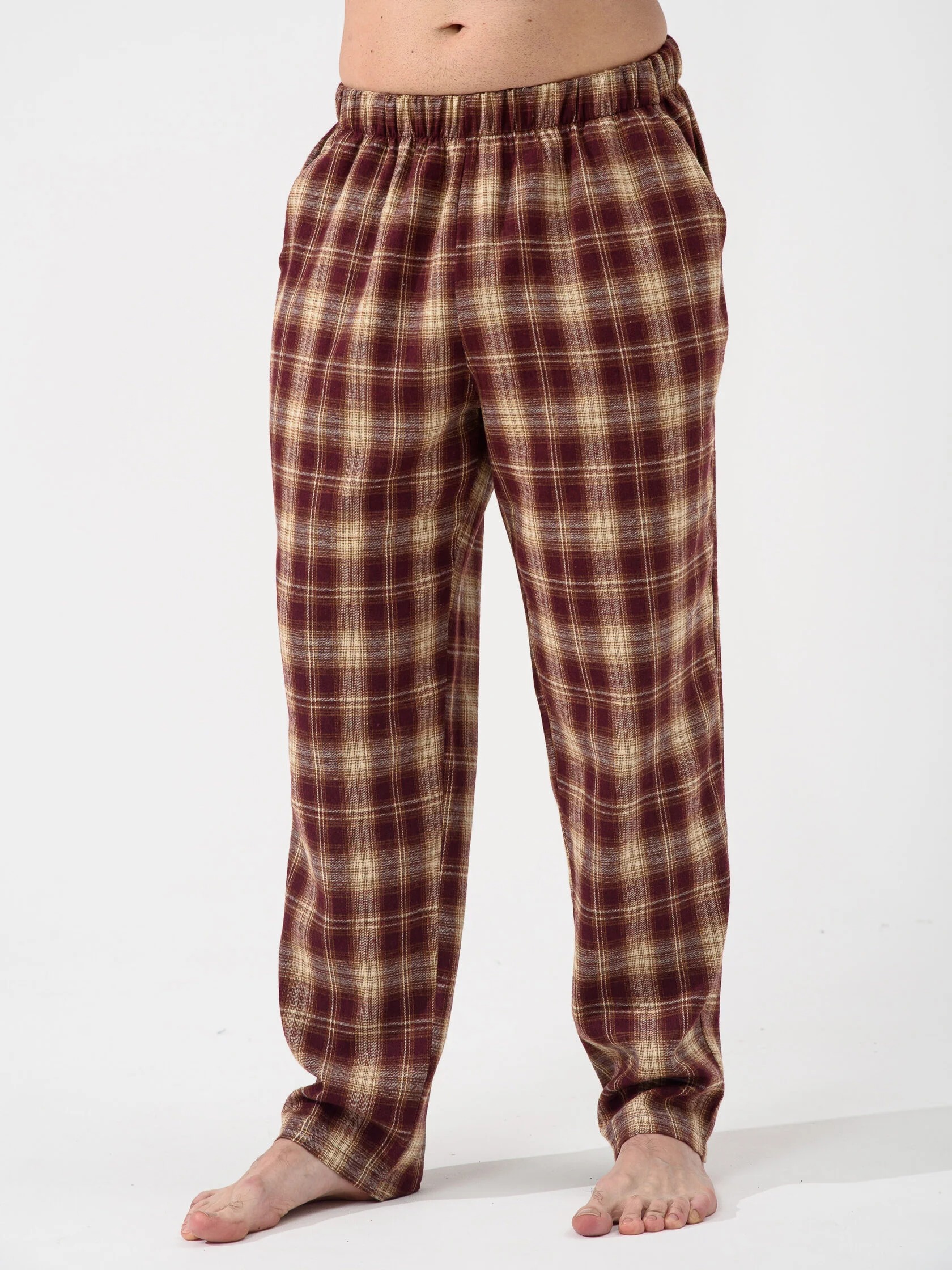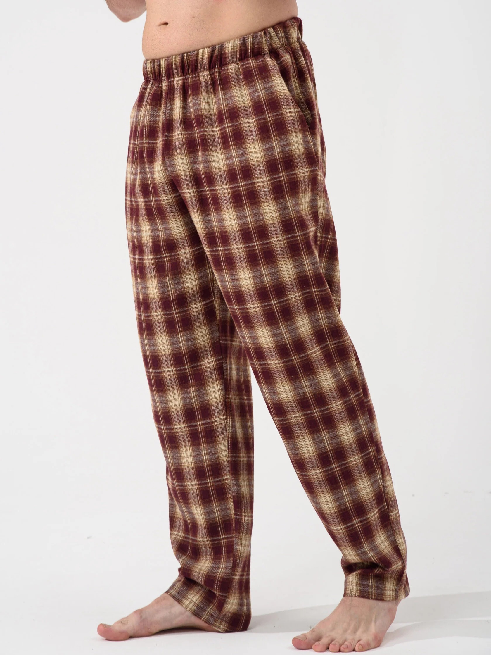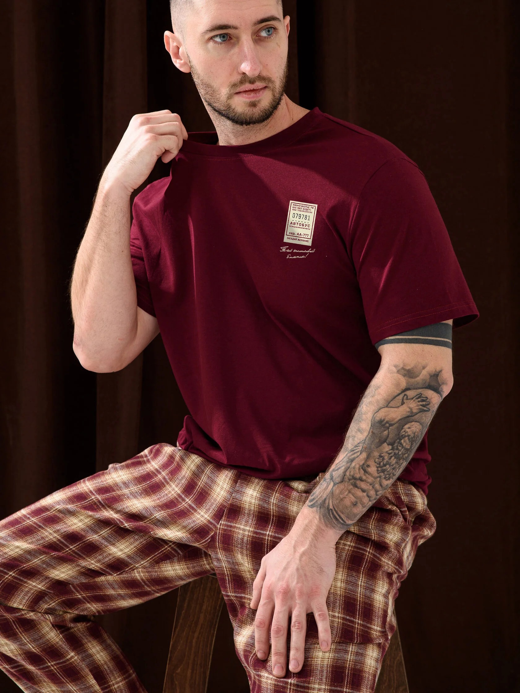 Мужская пижама "Счастливый билет" 2434-К/Ф / Бордовый состоит из футболки и свободных брюк. Мужской костюм отшивается из комбинированных тканей - футболка из кулирки, брюки из фланели.