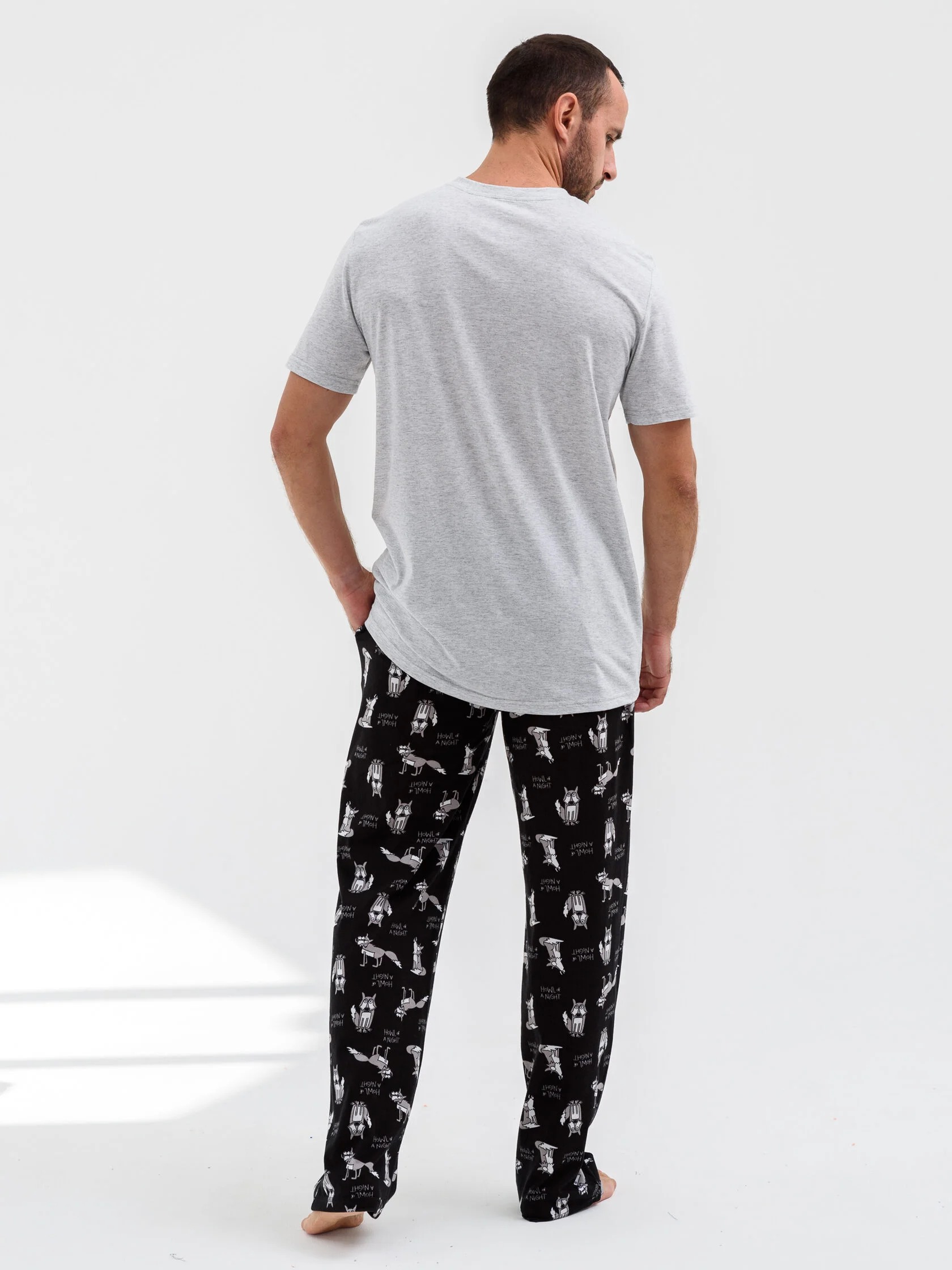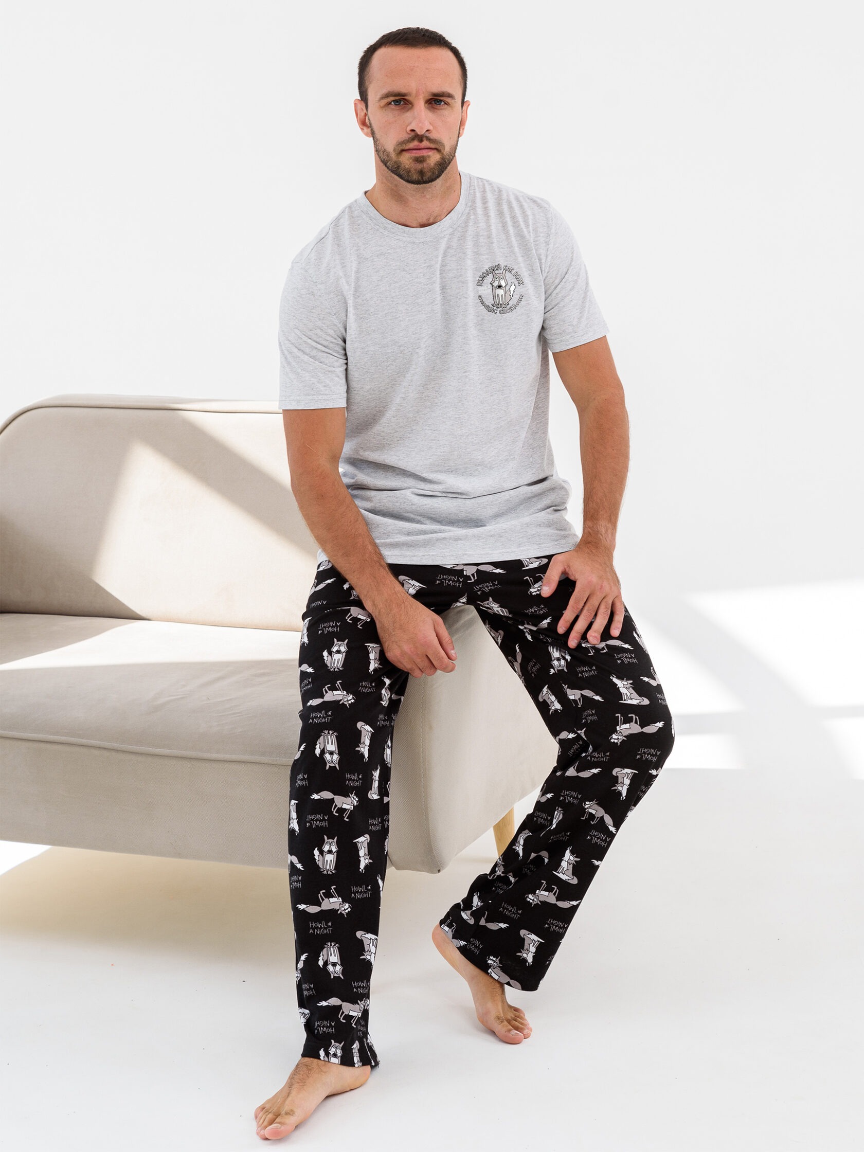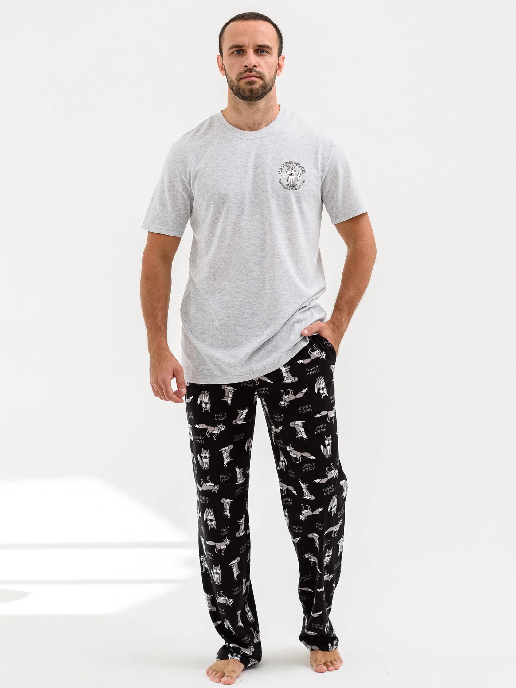 Мужская пижама "Голодный как волк" 2269-К / Серый с веселым принтом. Мужская пижама из кулирки состоит из футболки с короткими рукавами и свободных брюк.