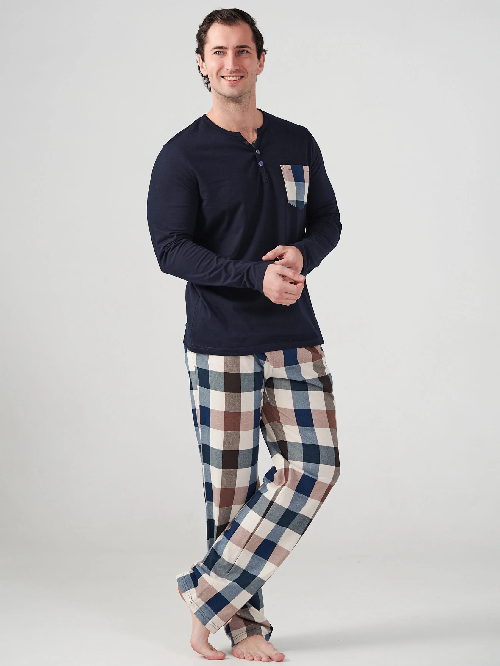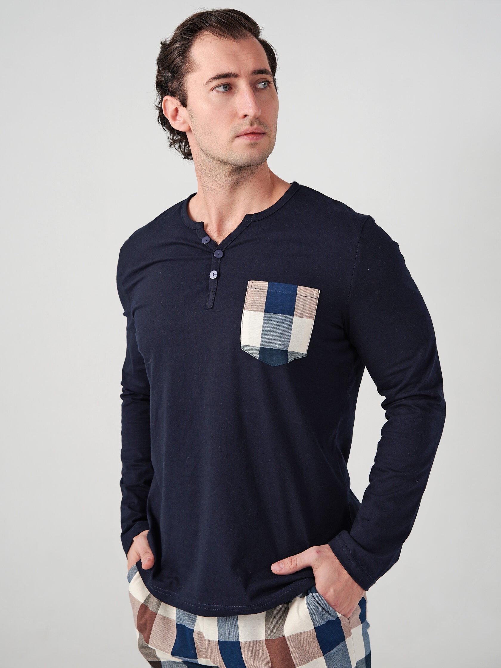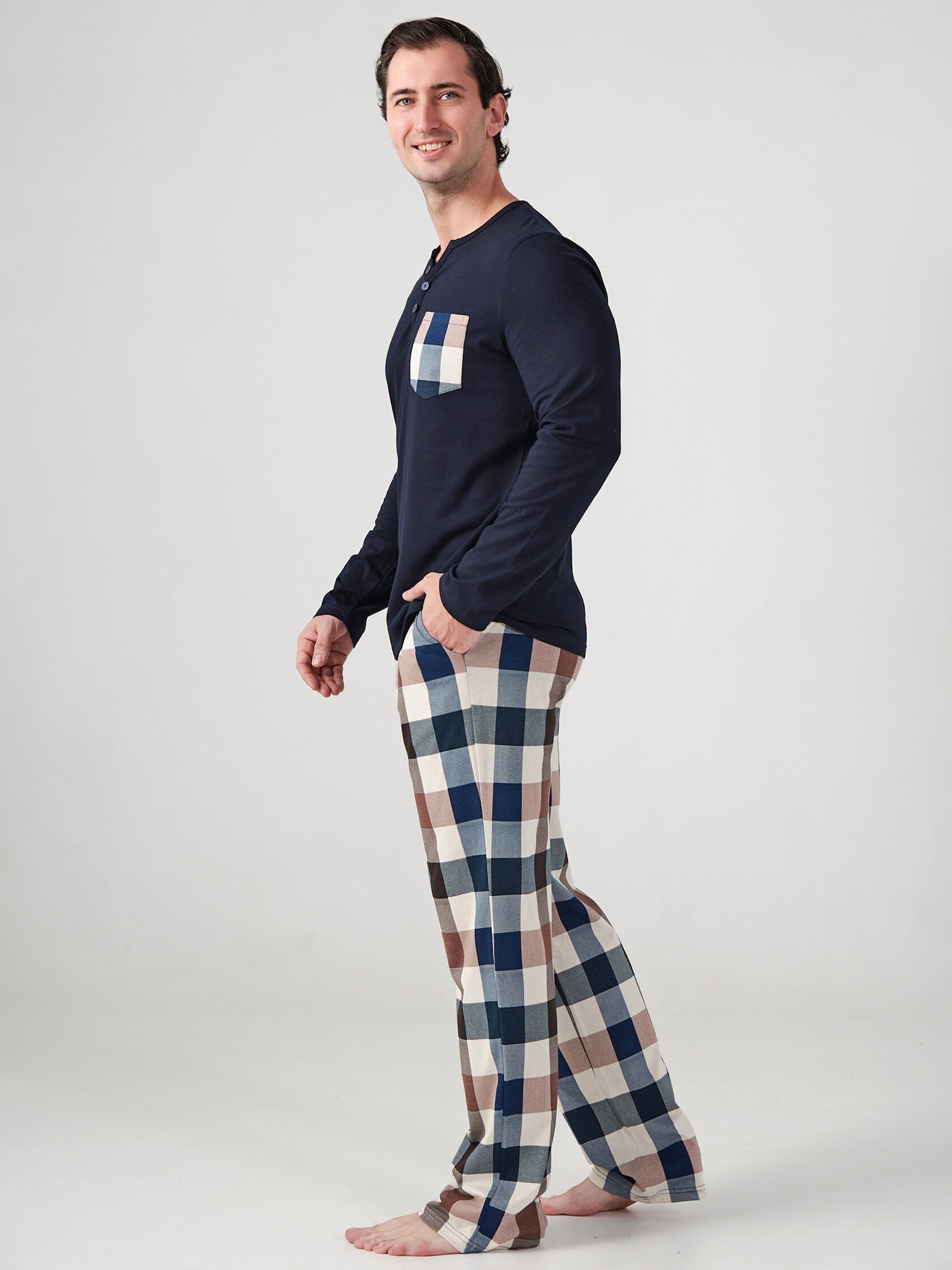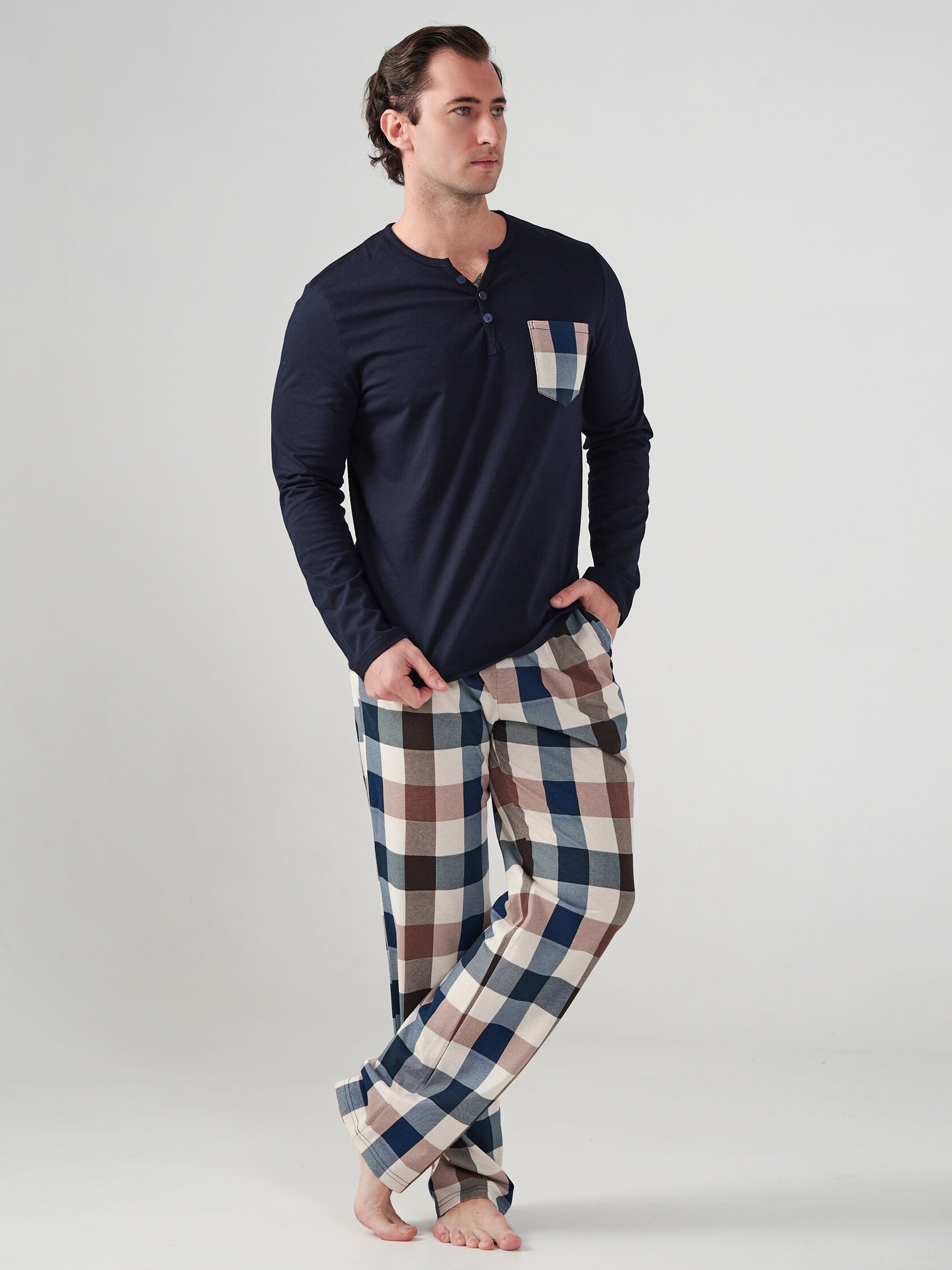 Пижама мужская состоит из футболки и брюк. Футболка с длинным втачным рукавом. Круглый вырез горловины на полочке и имитация планок окантованы бейкой с застежкой на петли и пуговицы. На полочке нагрудной карман. Футболка выполнена из гладкокрашеного полотна. Брюки прямого силуэта с боковыми карманами в швах с цельнокроеным поясом на резинке.