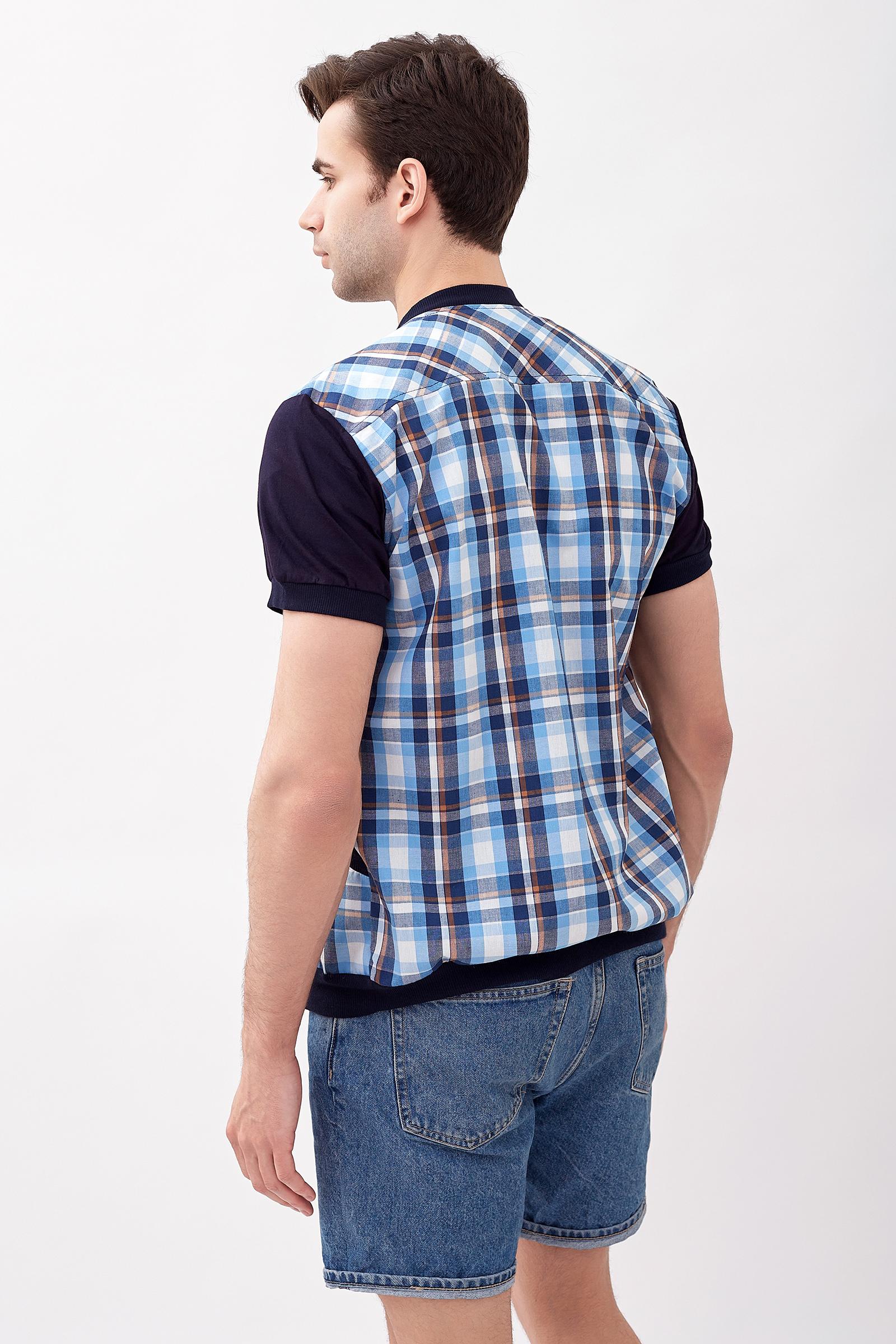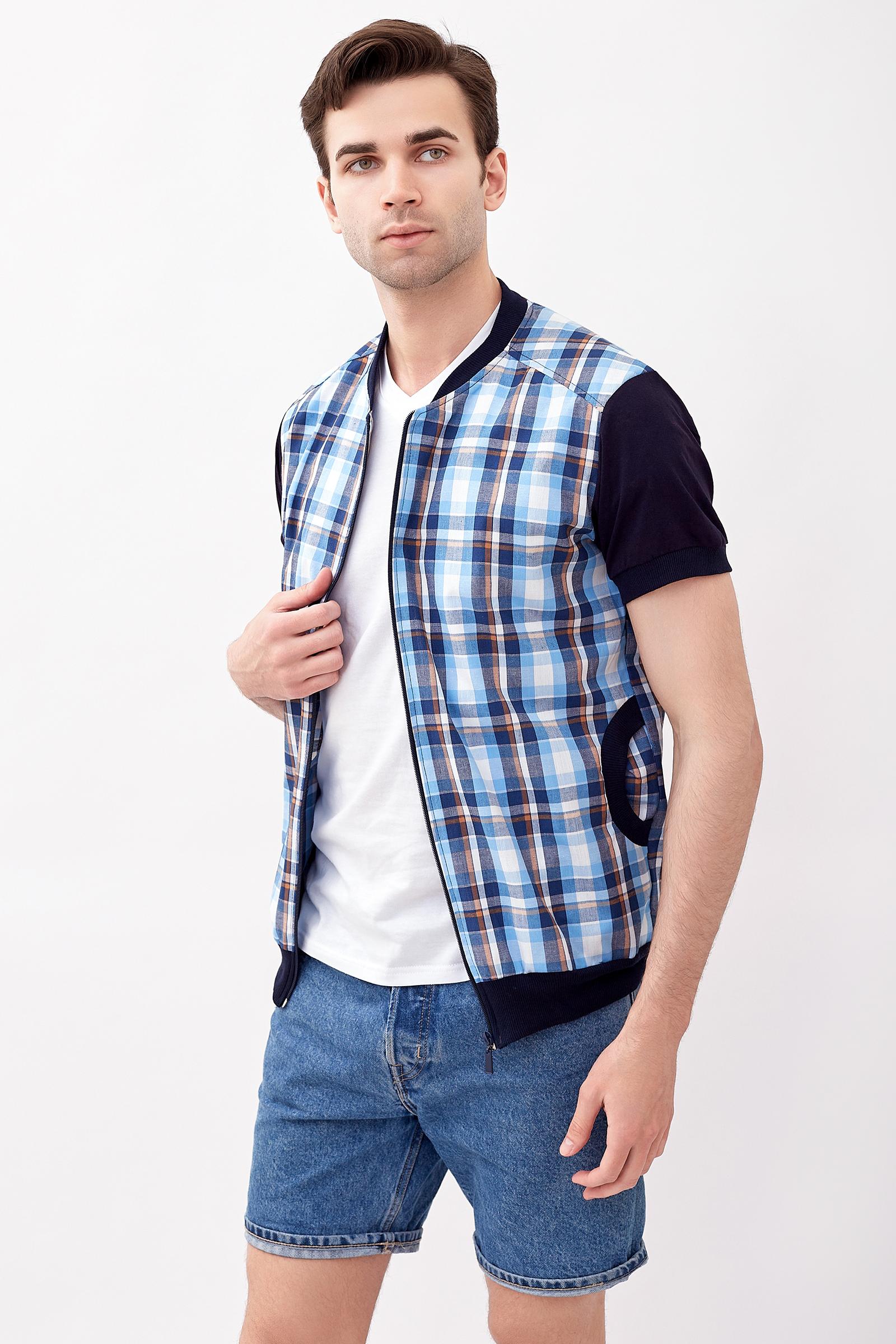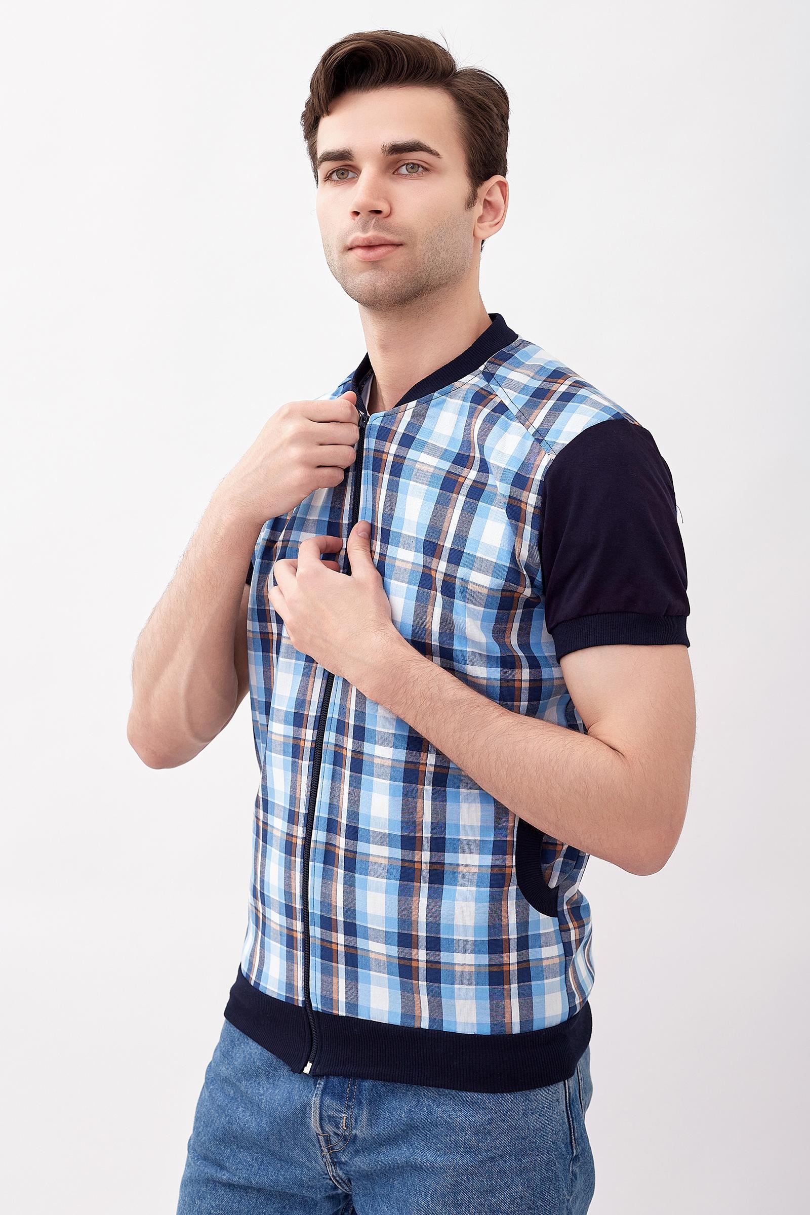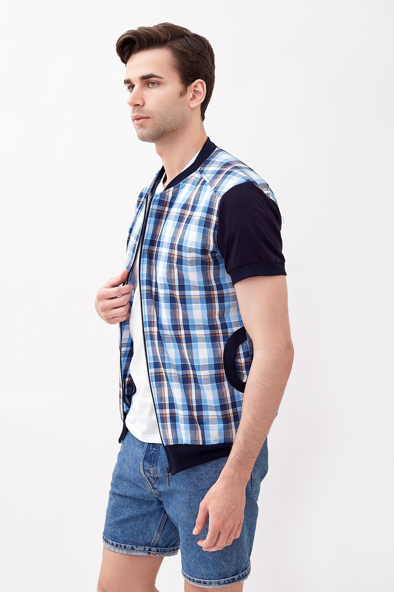 Модная мужская рубашка из 100% хлопка. Модель рубашки по типу куртки-бомбер с застёжкой на молнию. Комбинированная рубашка с рисунком в клетку и однотонными синими рукавами. Рукав короткий. Также рубашка дополнена карманами. По низу изделия проходит эластичный пояс.