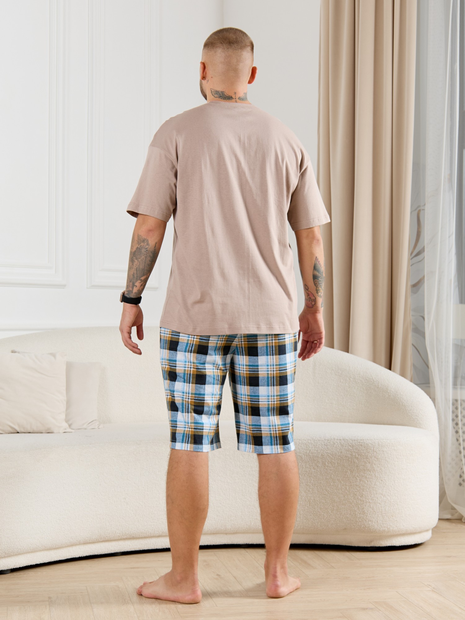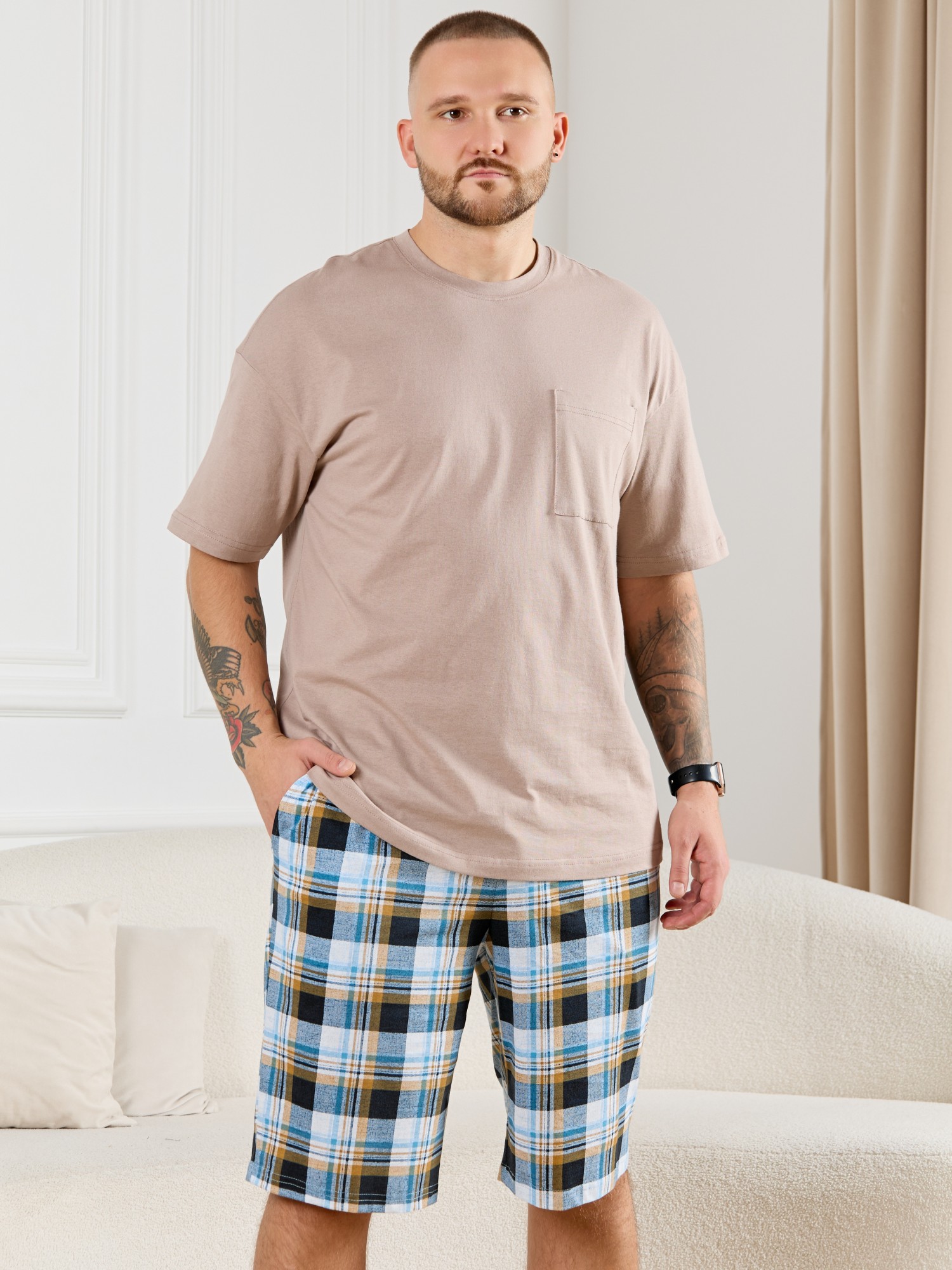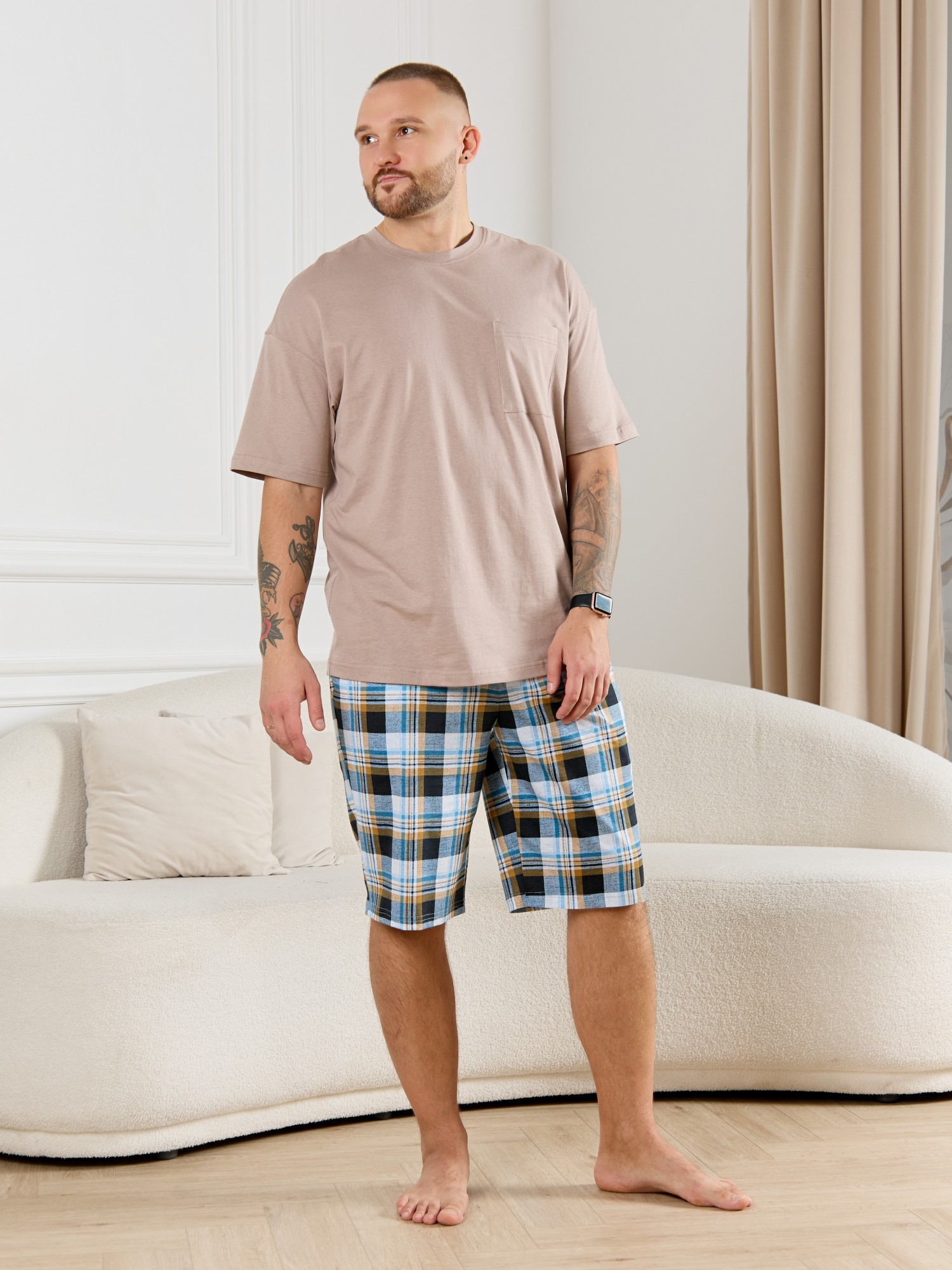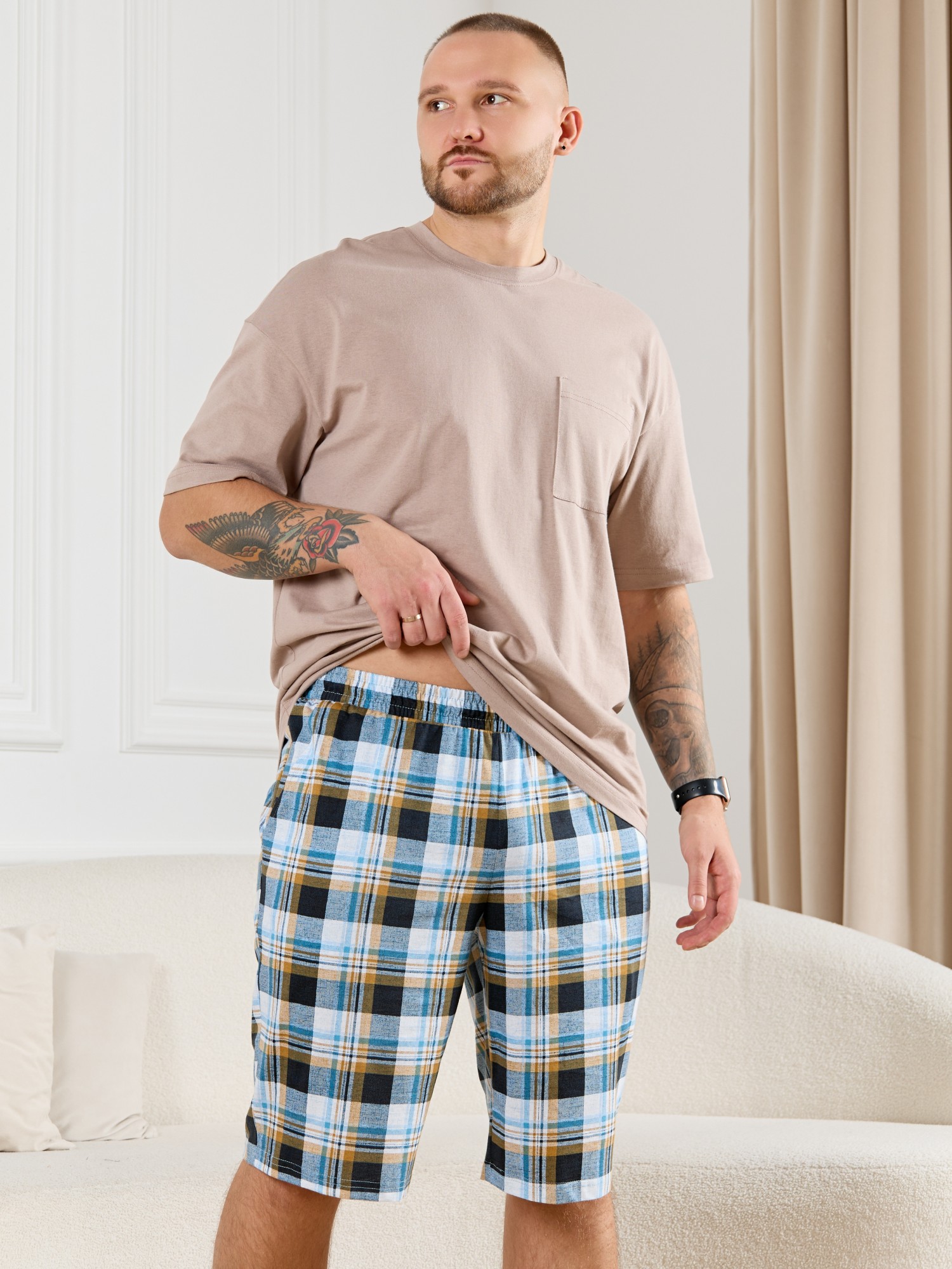 Шорты мужские из трикотажного полотна "кулирка" в клетку, свободного покроя, на притачном поясе с эластичной тесьмой внутри, с карманами в боковых швах. Нижние срезы обработаны подгибкой.