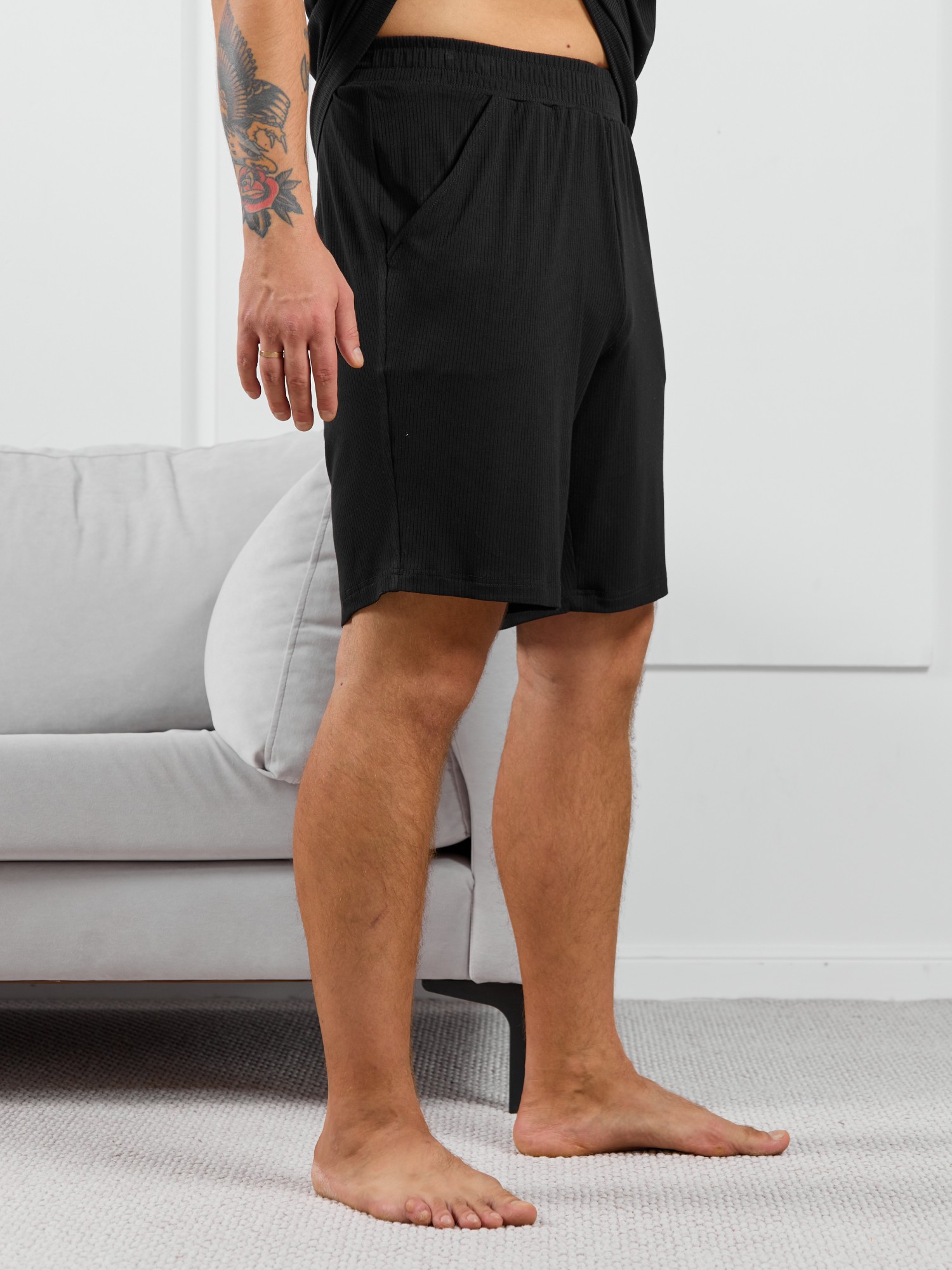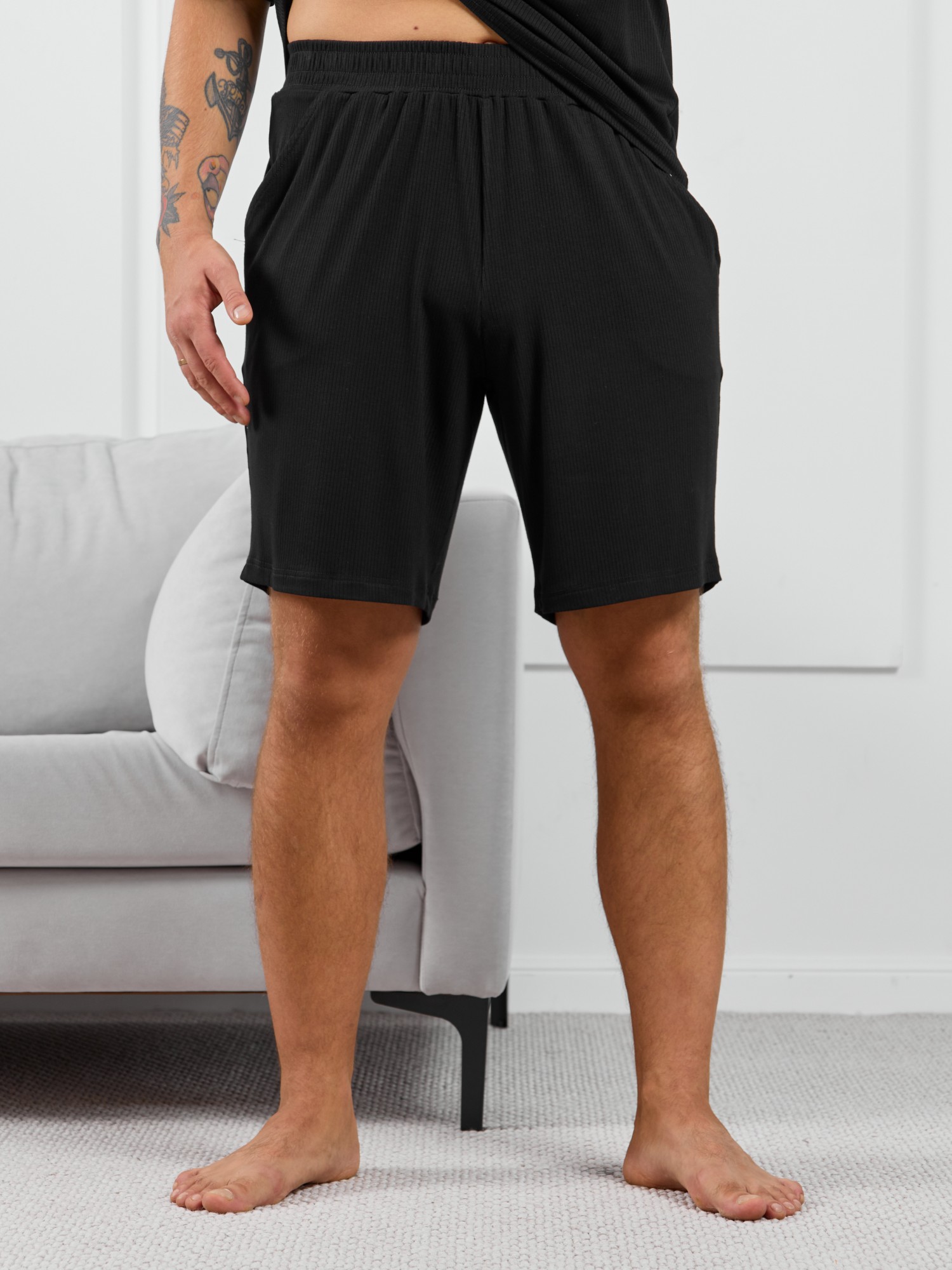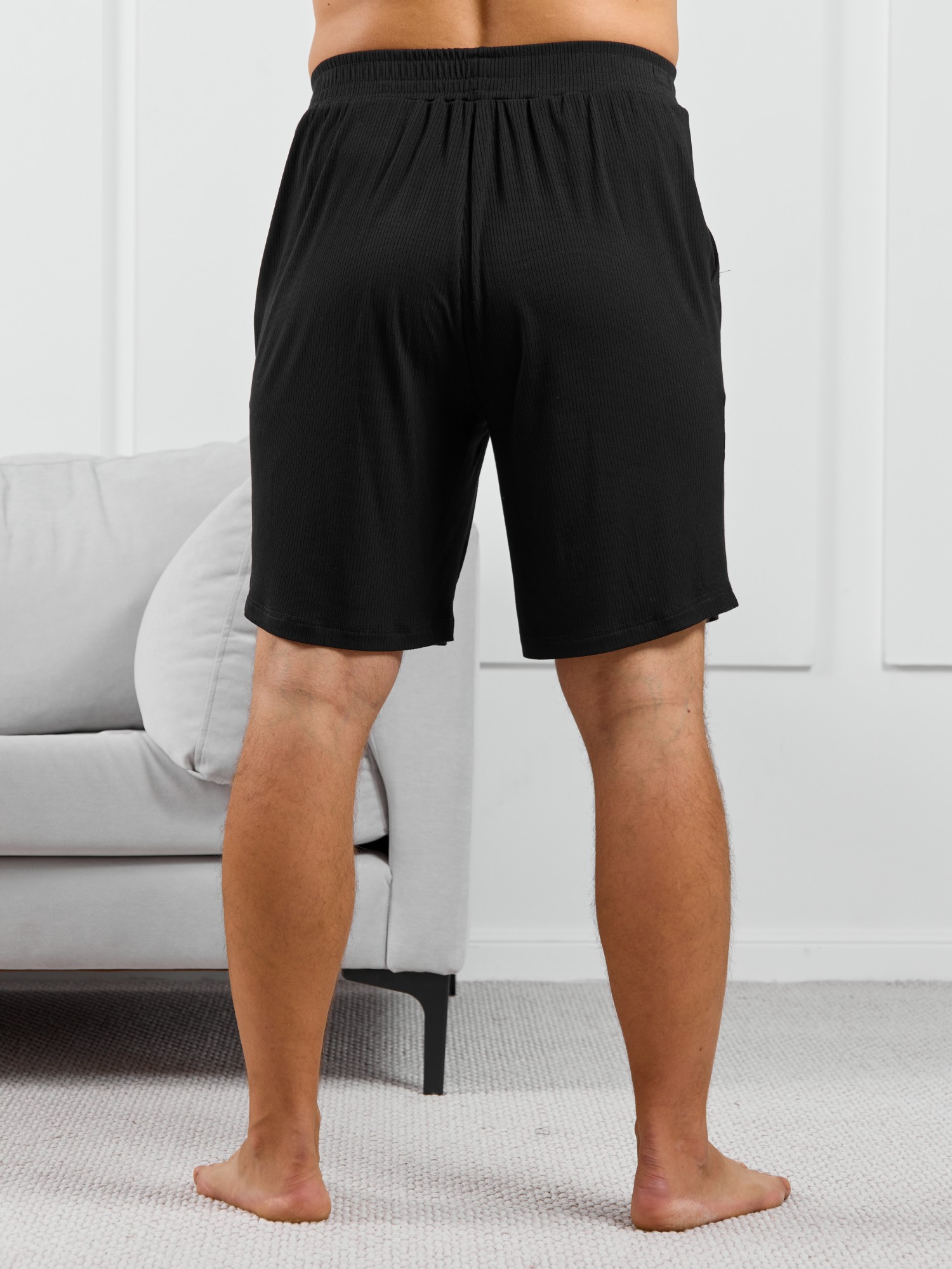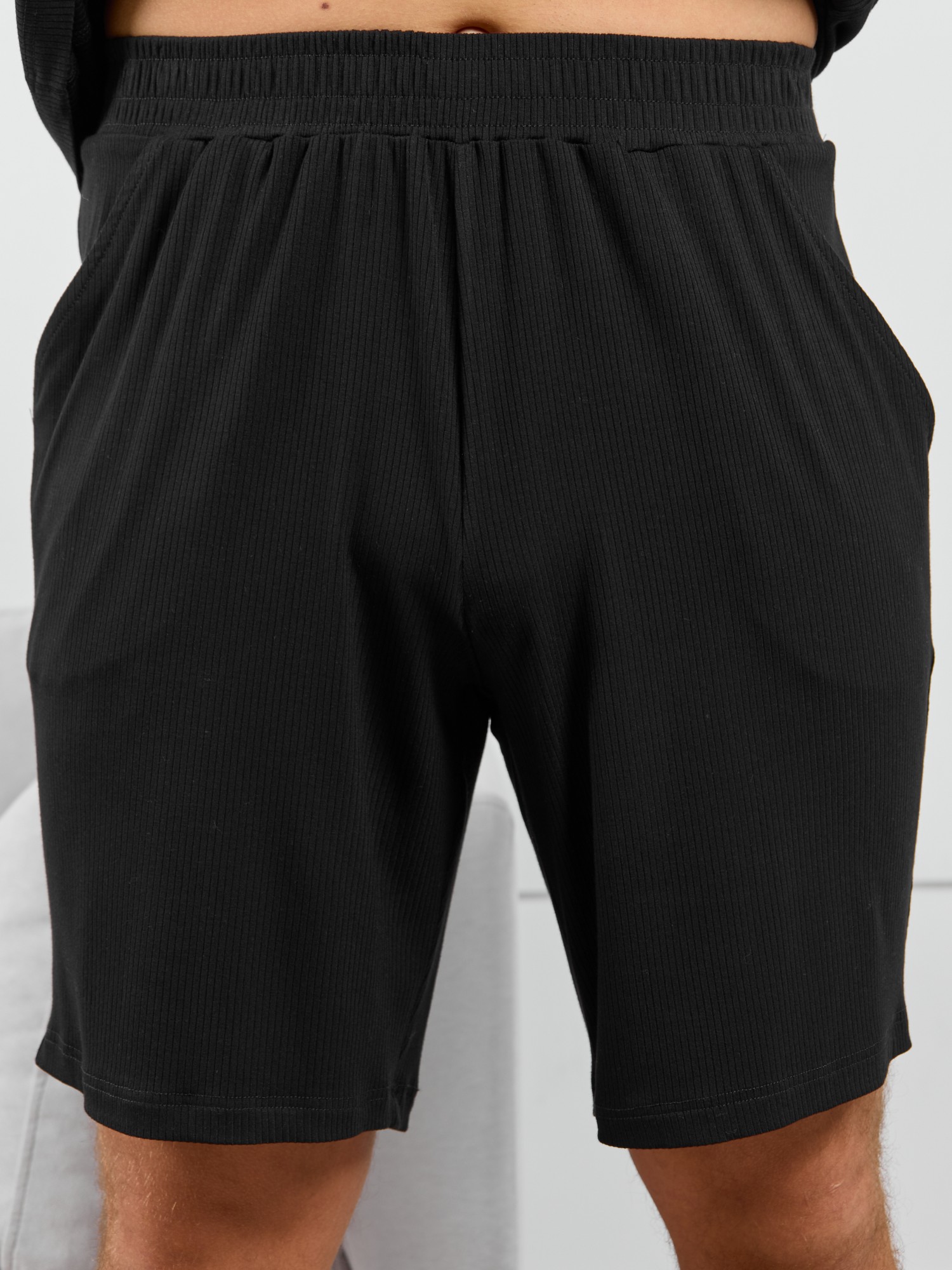 Шорты мужские из пластичного однотонного трикотажного полотна в рубчик, приятного к телу. Модель свободная, с боковыми карманами с обтачными входами, на притачном поясе с отстроченной эластичной тесьмой.