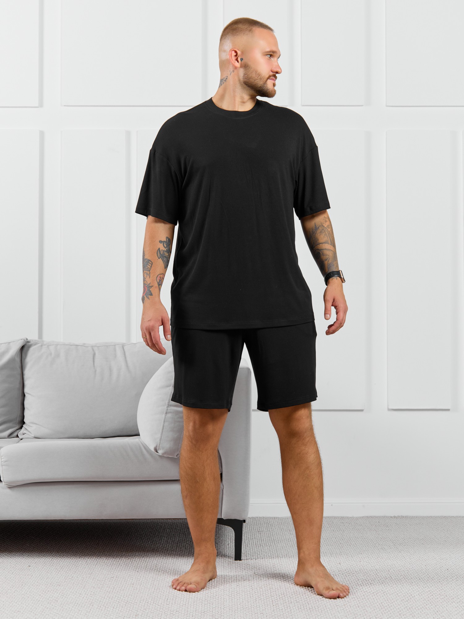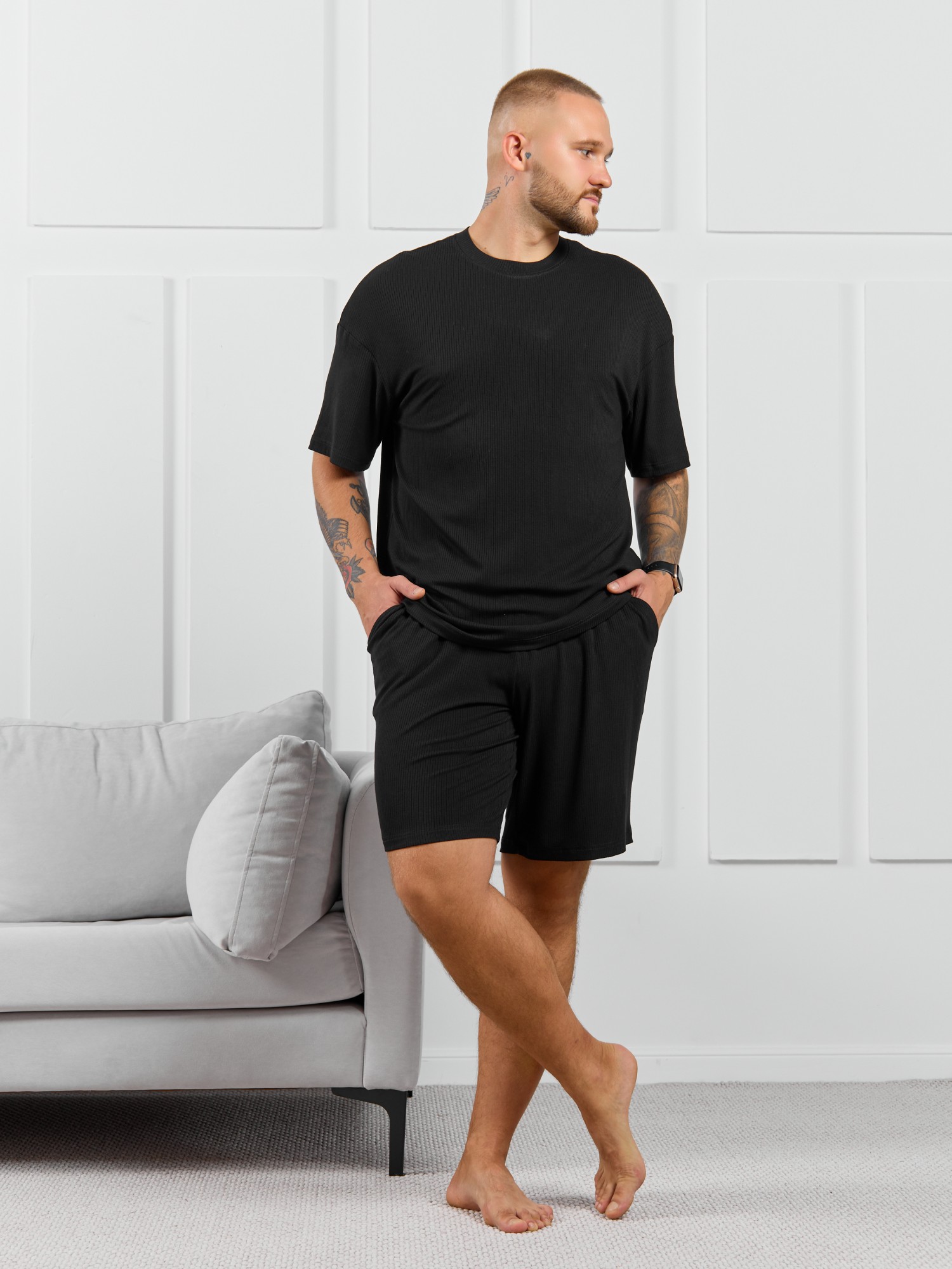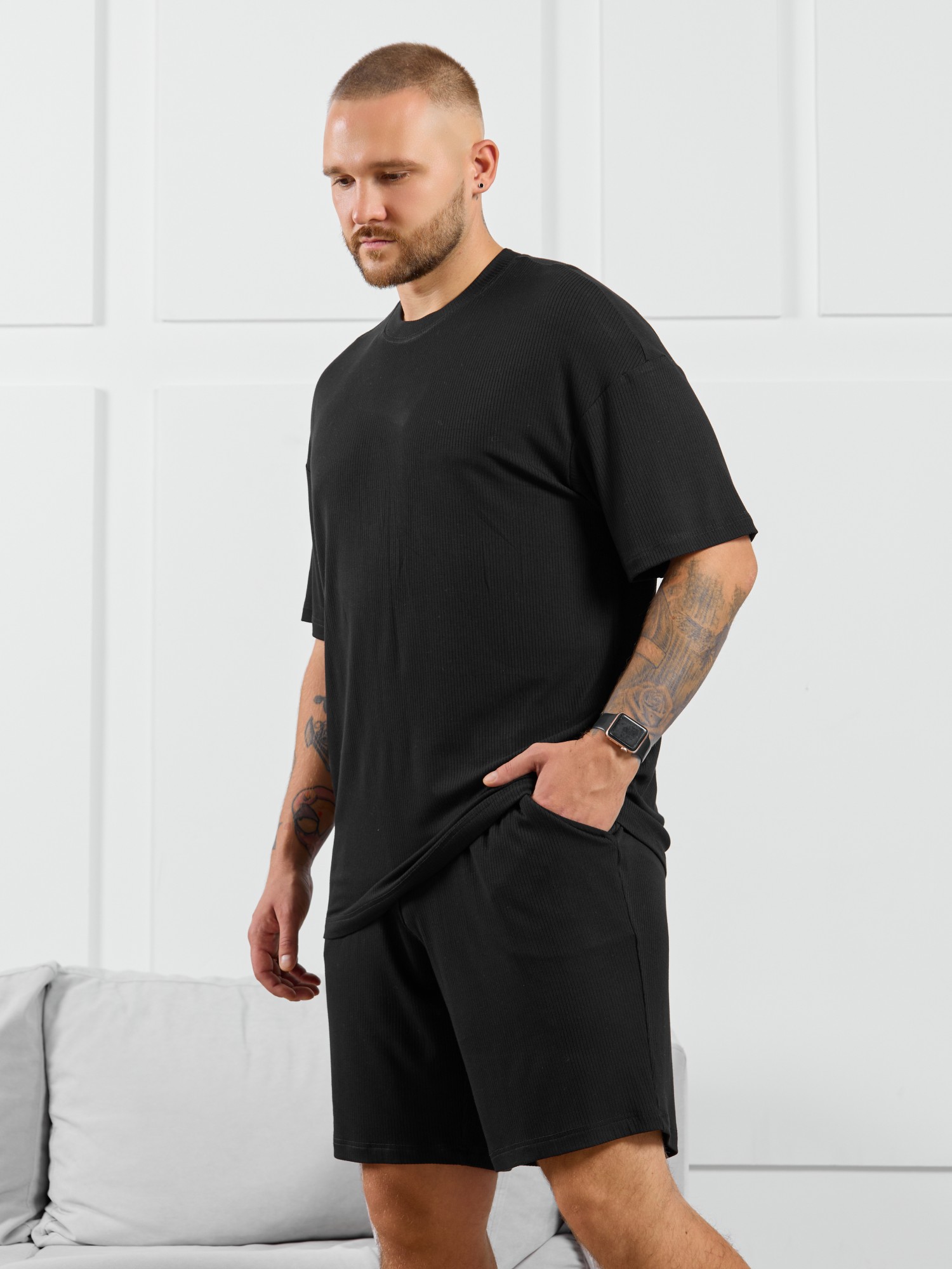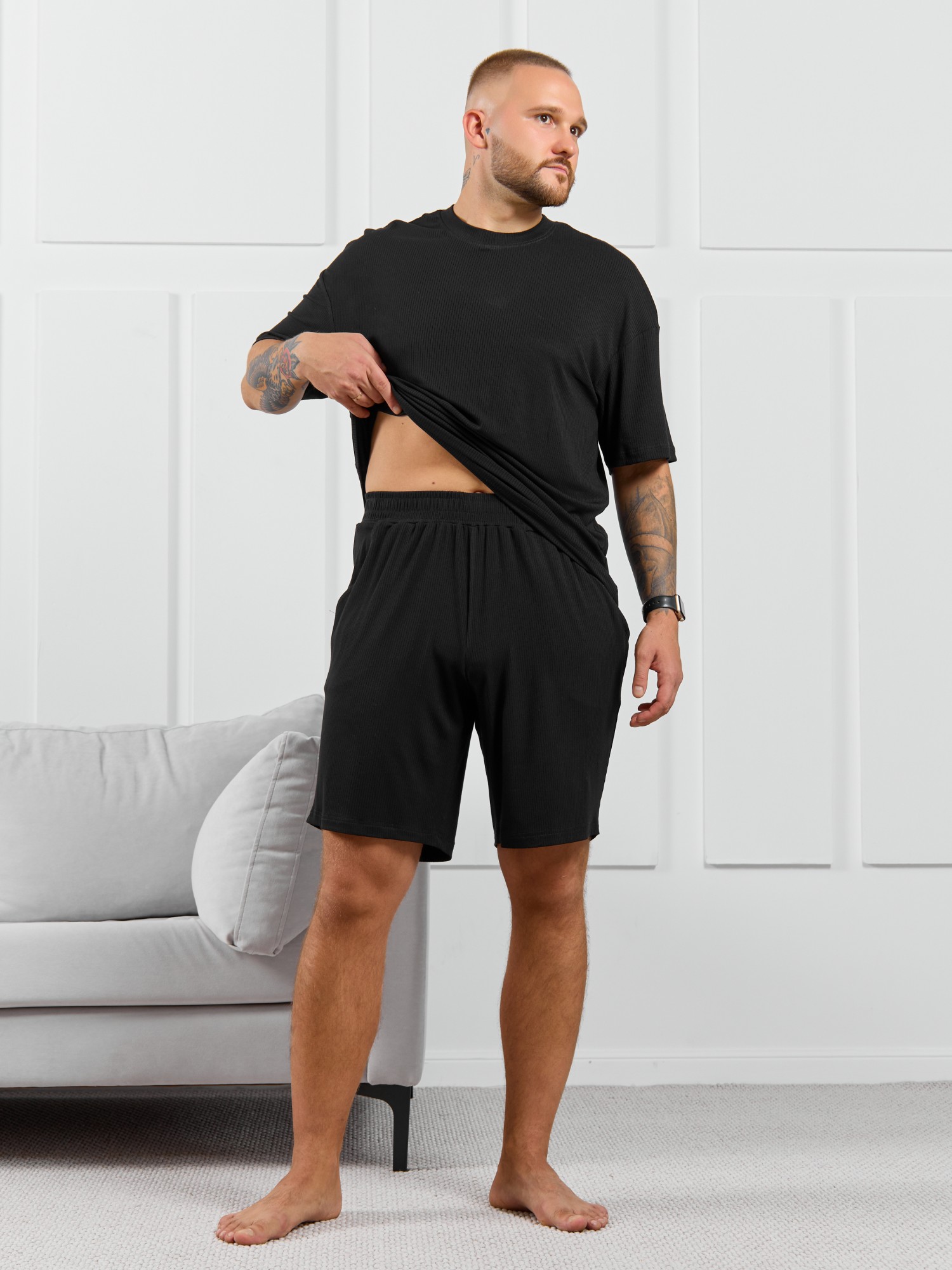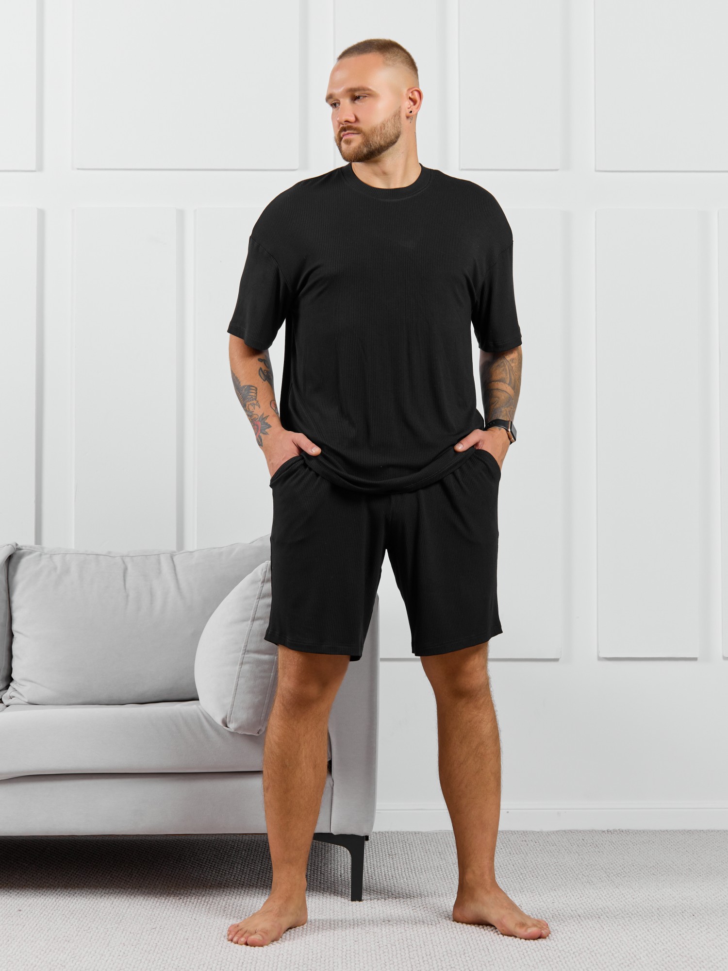 Шорты мужские из пластичного однотонного трикотажного полотна в рубчик, приятного к телу. Модель свободная, с боковыми карманами с обтачными входами, на притачном поясе с отстроченной эластичной тесьмой.