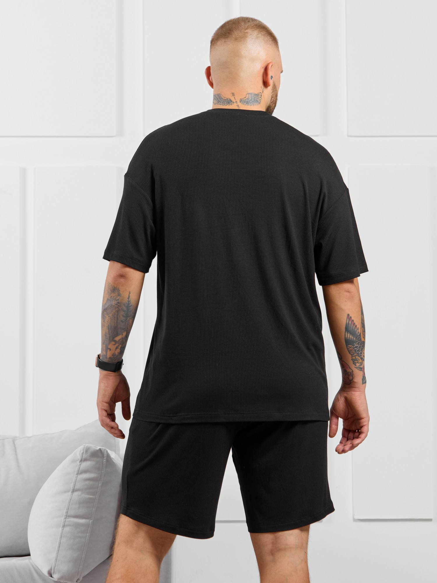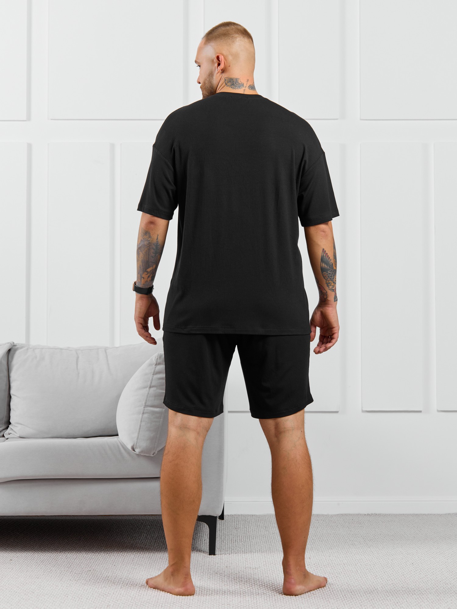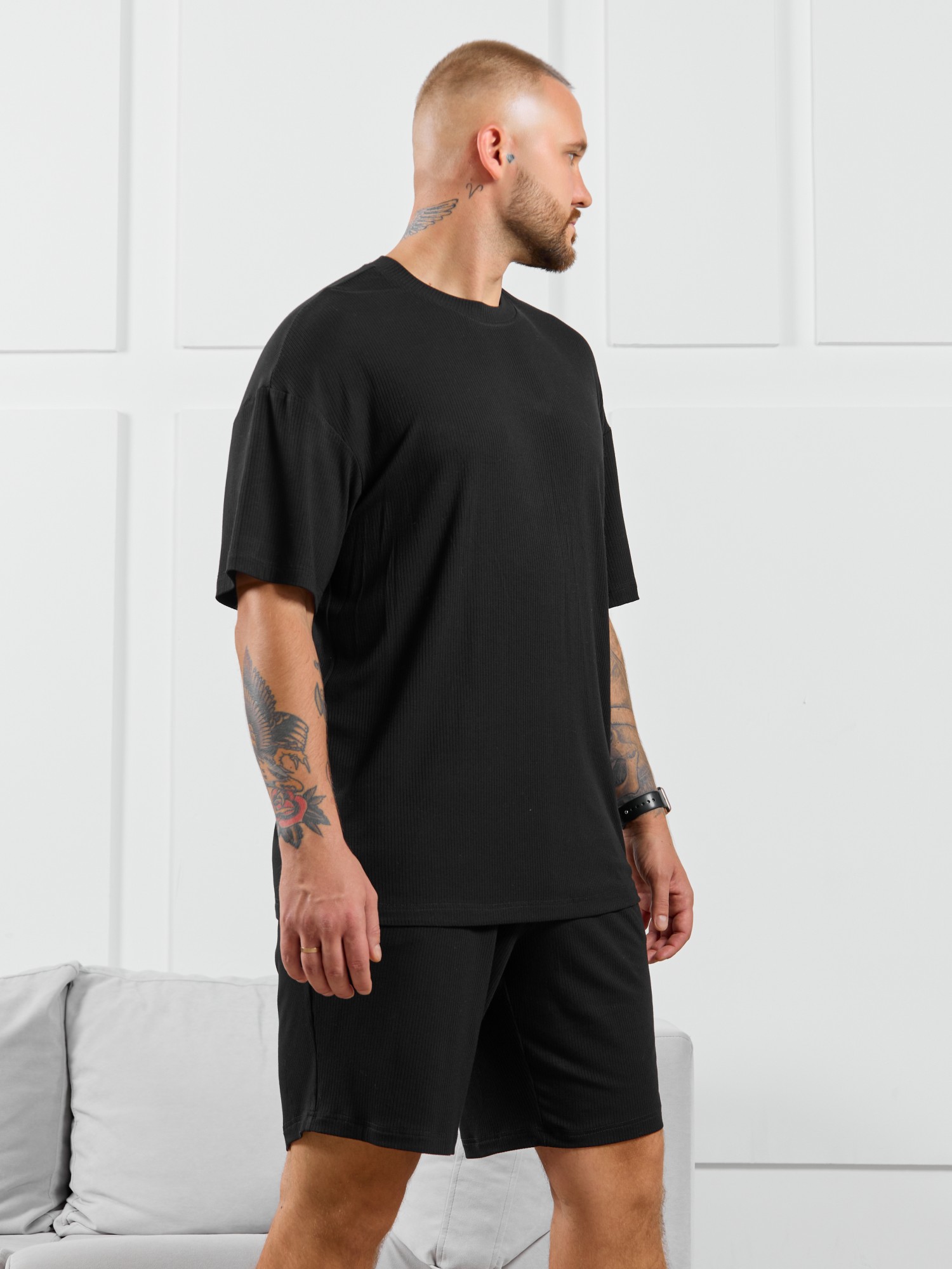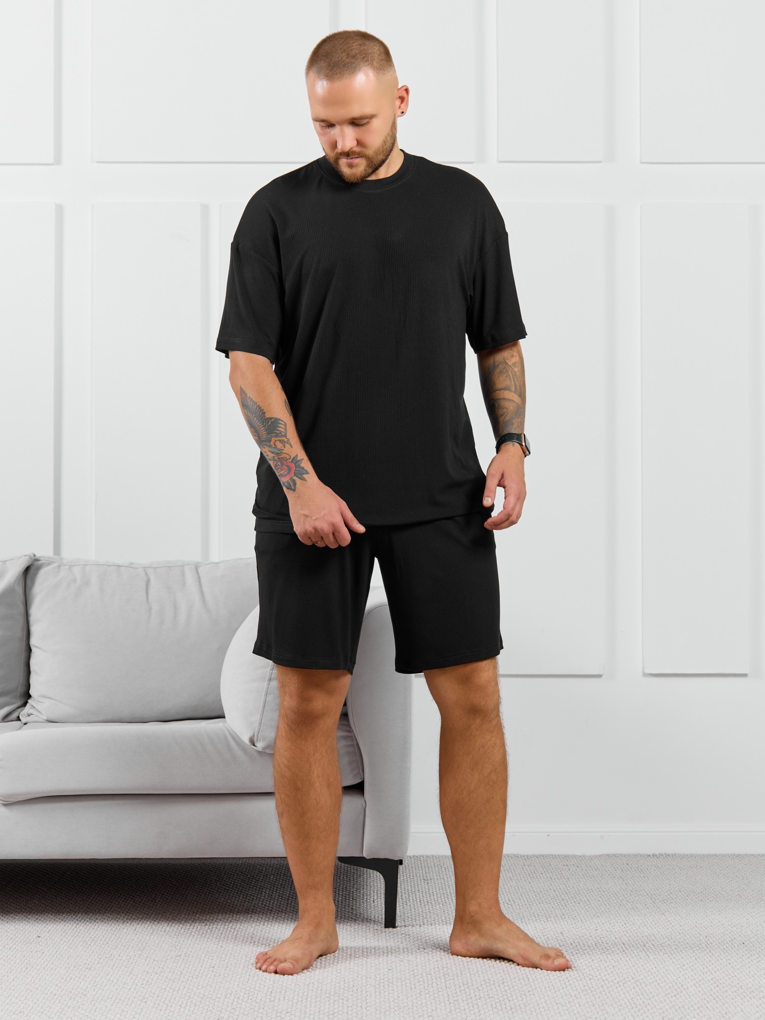 Шорты мужские из пластичного однотонного трикотажного полотна в рубчик, приятного к телу. Модель свободная, с боковыми карманами с обтачными входами, на притачном поясе с отстроченной эластичной тесьмой.