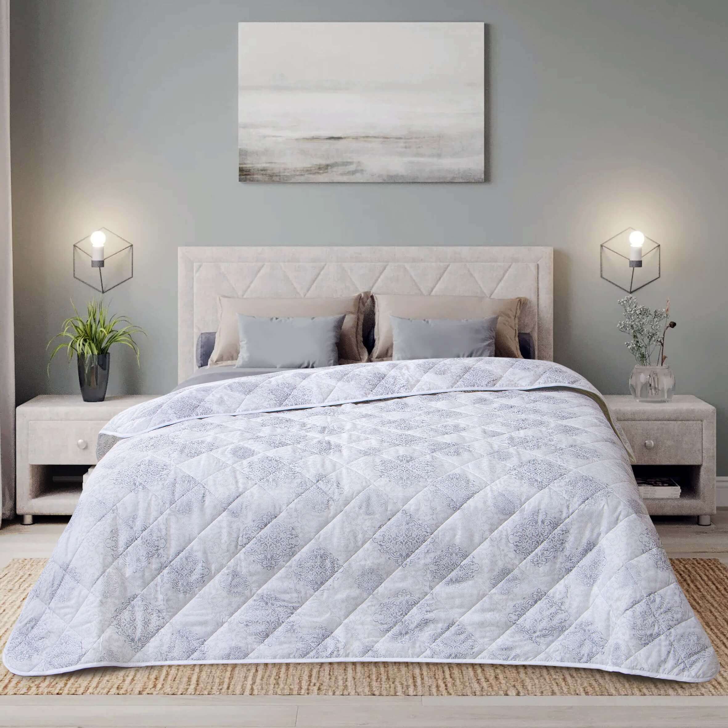 Красивое легкое одеяло с бамбуковым наполнителем (силиконизированнное волокно). Наполнитель представляет собой экологически чистый материал растительного происхождения. Прекрасно поглощая и испаряя влагу, оно способствует терморегуляции – летом сохраняет прохладу, а зимой создает необходимое тепло. Одеяло способно подарить незабываемый комфорт во время отдыха. Плотность наполнителя в изделии составляет 150 гр/м2.