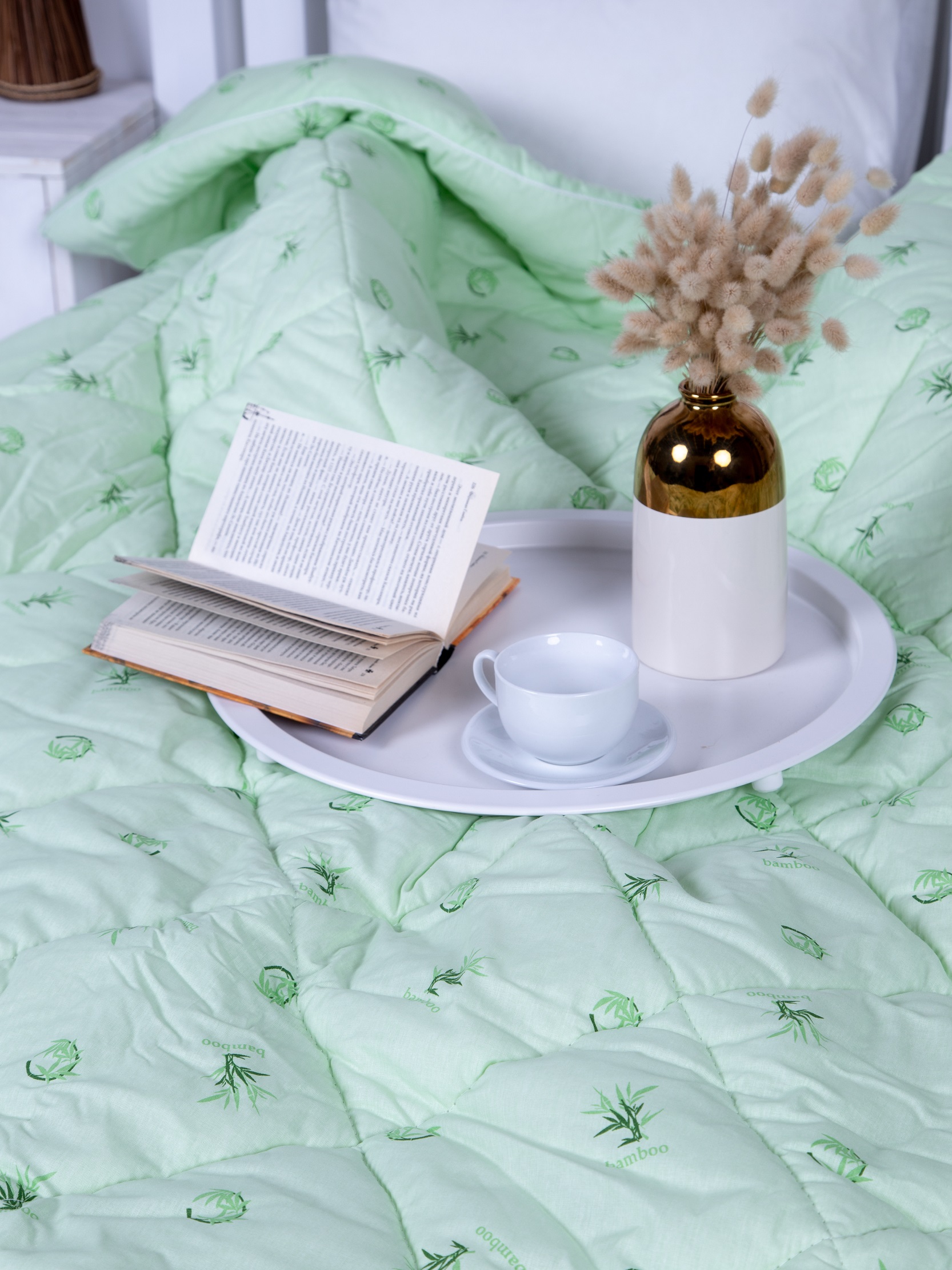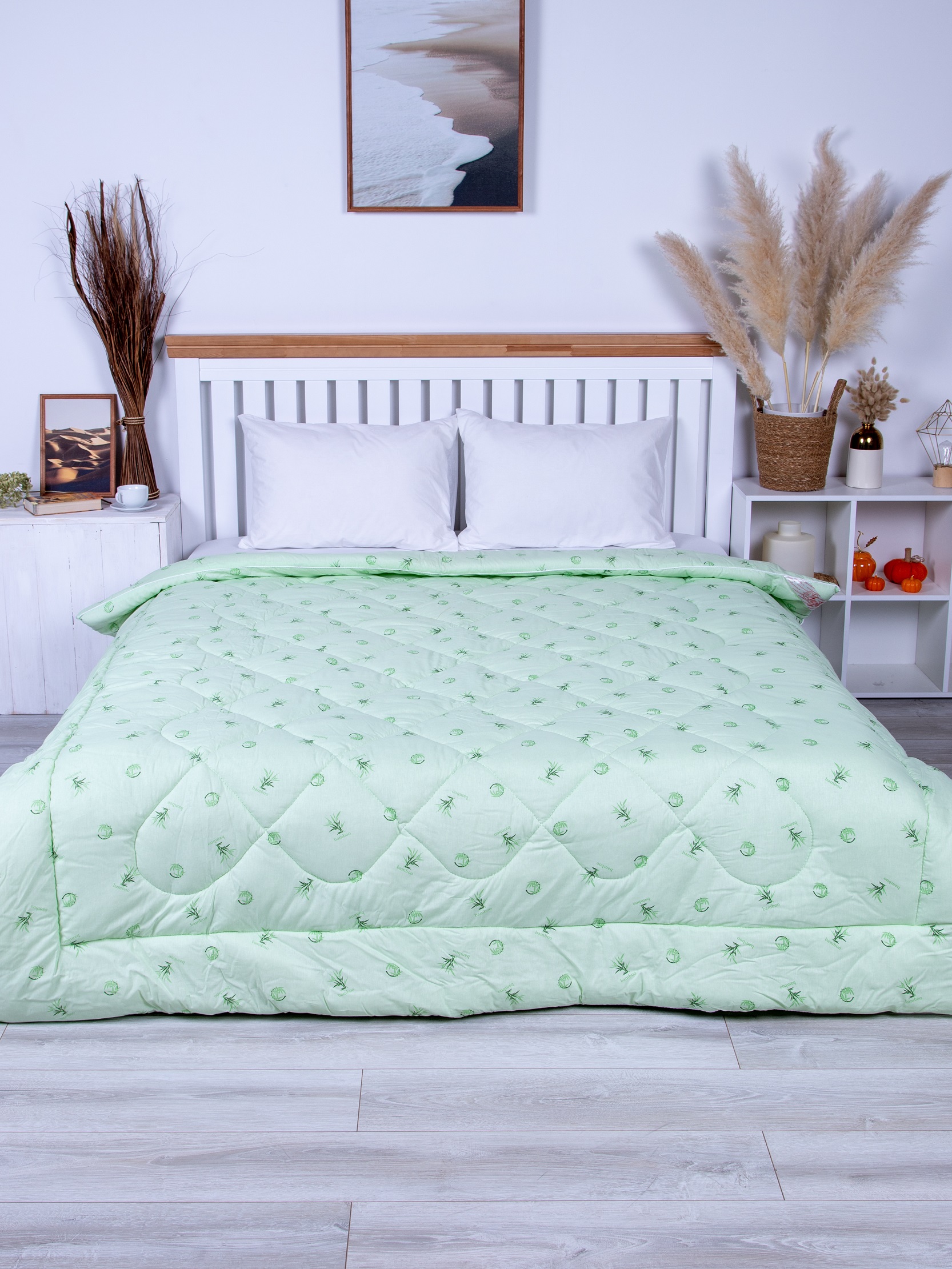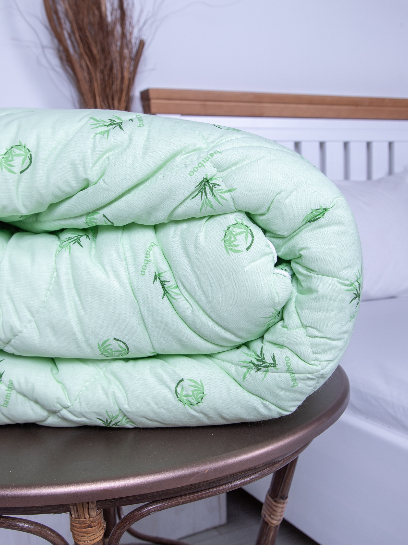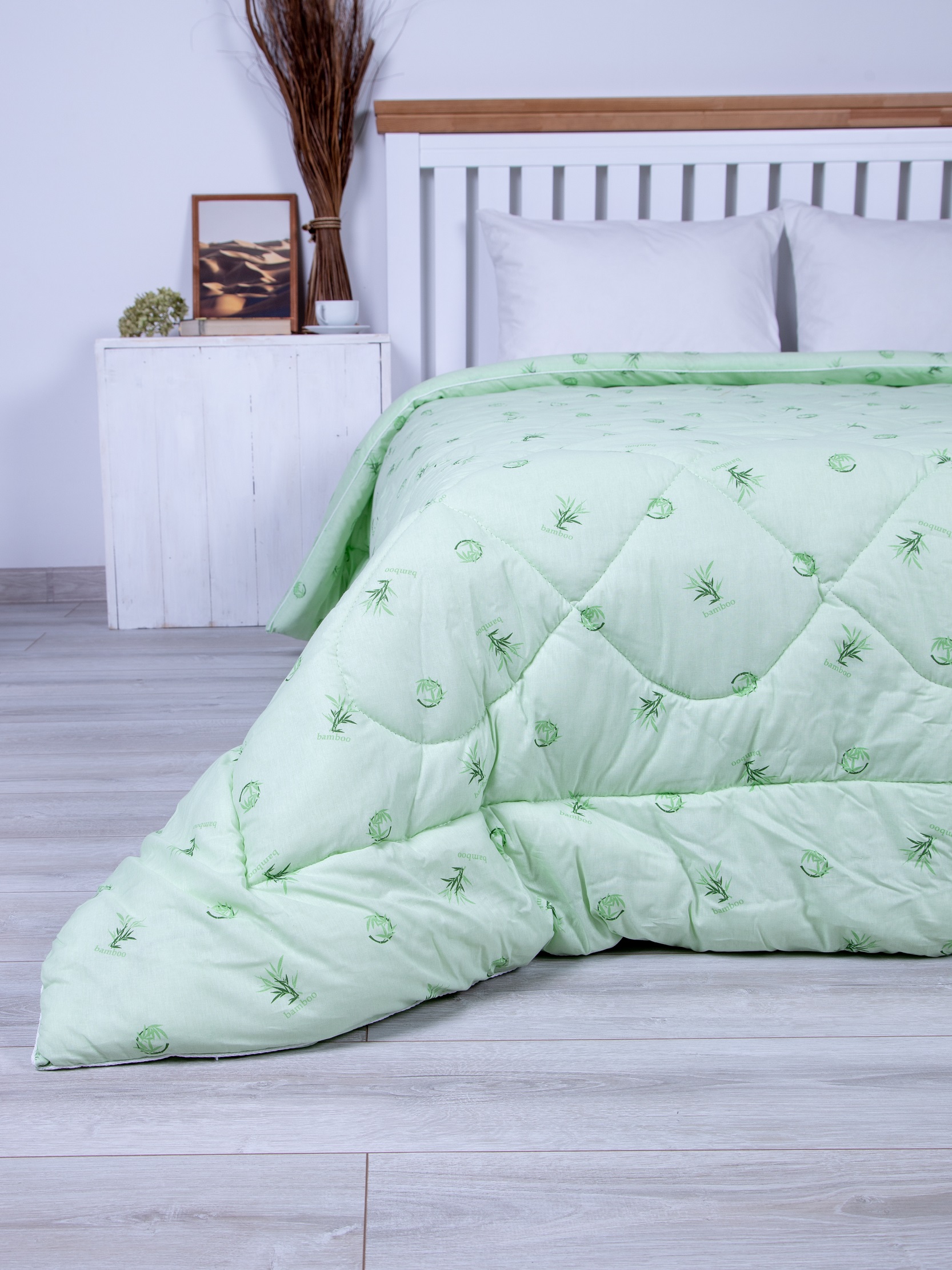 Одеяло стёганое "Бамбуковое волокно" с наполнением из бамбукового волокна, утолщенное - плотность не менее 400 гр/кв.м. Одноигольная стежка, очень теплое и мягкое, прекрасно дышит и обладает антибактерицидным эффектом. Отделочный элемент - вшивной кант. Упаковка - сумка ПВХ с ручками.