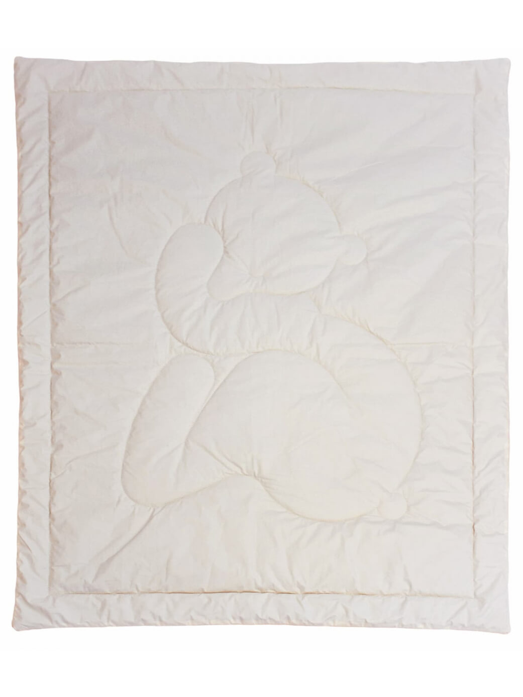 Сонный маленький медвежонок на стежке одеяла непременно понравится малышу, а хлопковая ткань чехла и наполнитель из натуральной шерсти оценят заботливые родители.