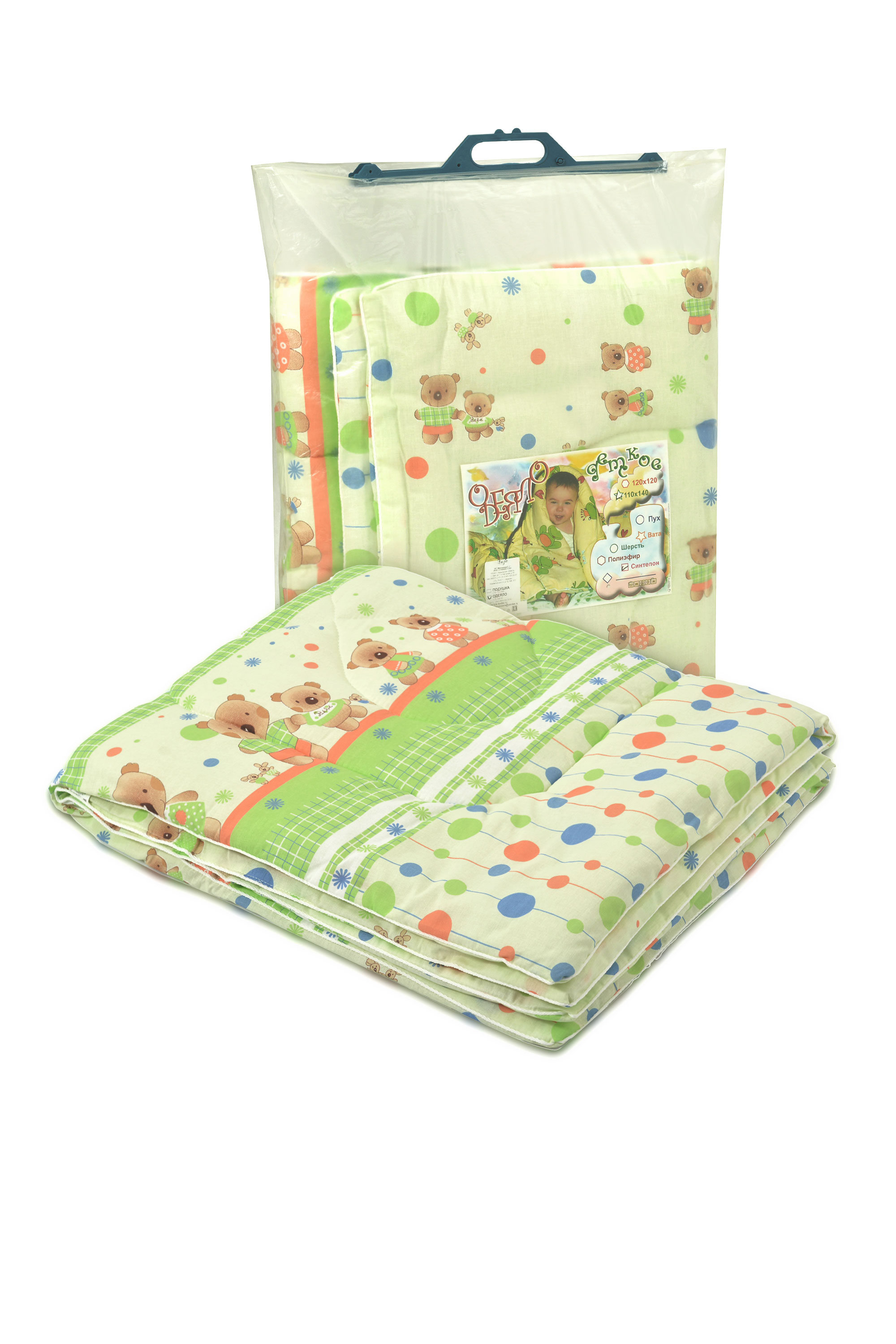 Одеяло стёганое детское с наполнением из синтепона плотностью 300 гр/кв.м. Одноигольная стежка, ткань чехла из натурального хлопка, не вызывает аллергии у малыша. Отделочный элемент - вшивной кант. Упаковка - пакет с ручками.