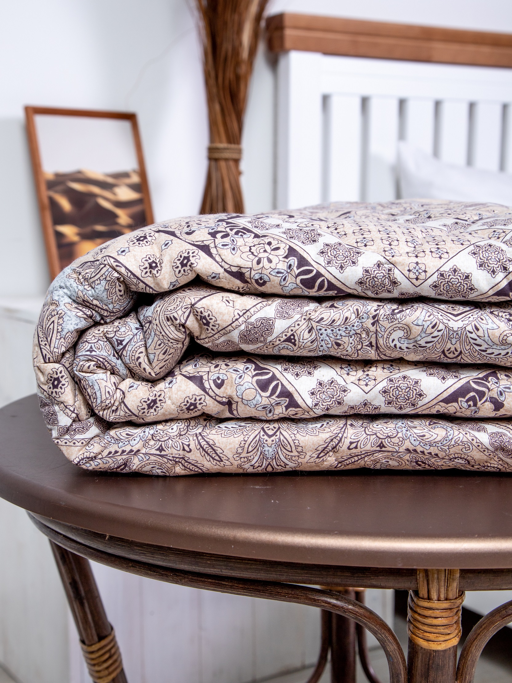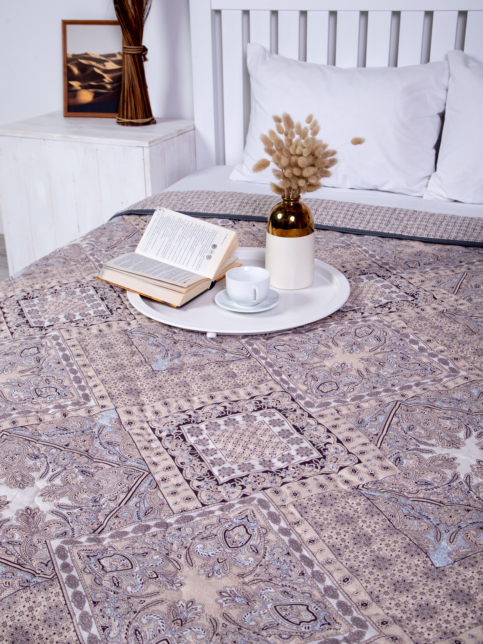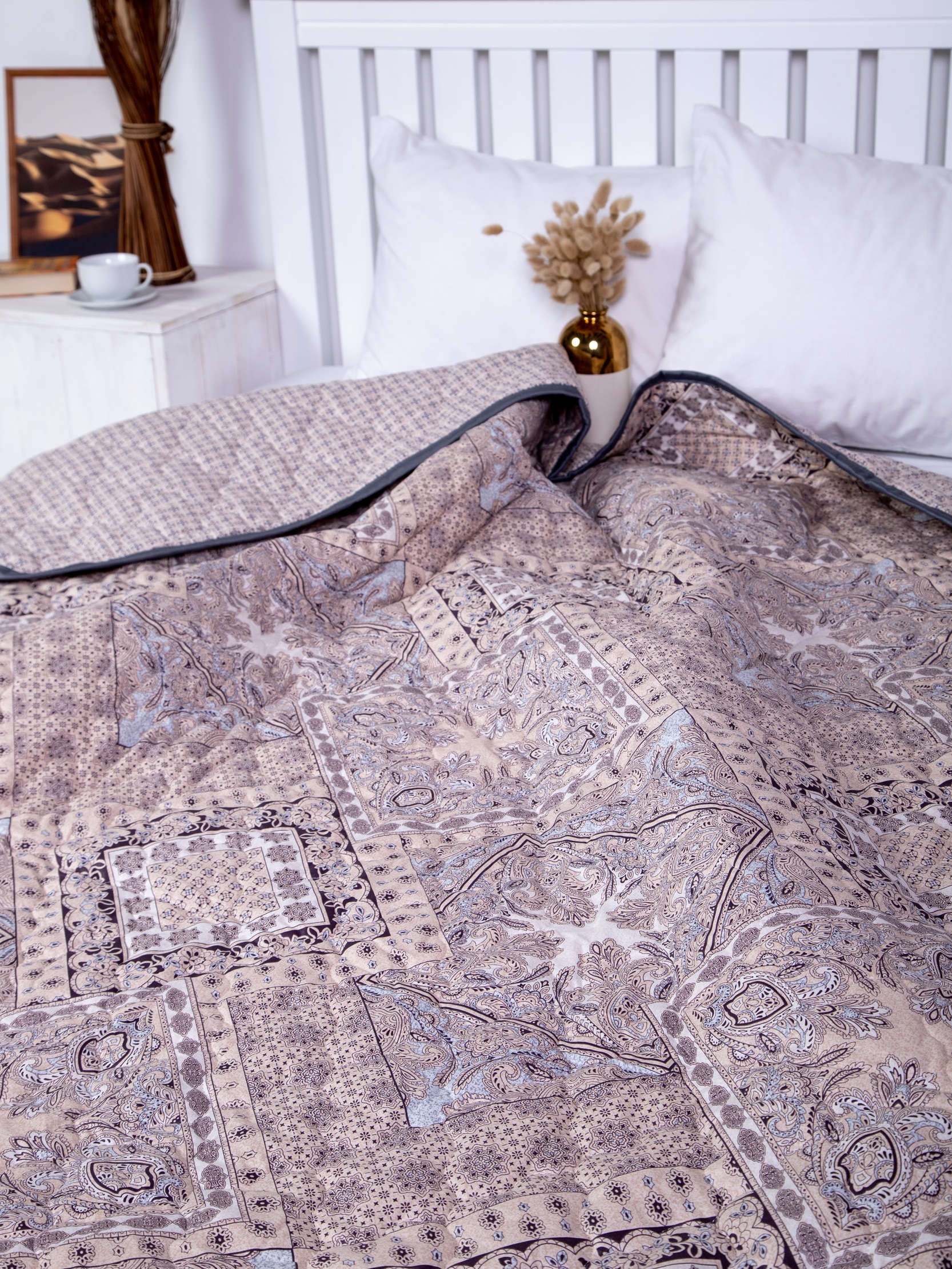 Одеяло с наполнением из термофиксированного льняного волокна плотностью 150 гр/кв.м. окантовано широкой тесьмой. Прекрасное облегченное одеяло-покрывало. Волокна льна - это экологически чистый растительный наполнитель, не вызывающий аллергии. Одеяло прекрасно "дышит" и сохраняет тепло. Изделие премиум-класса. Упаковка - сумка ПВХ с ручками.