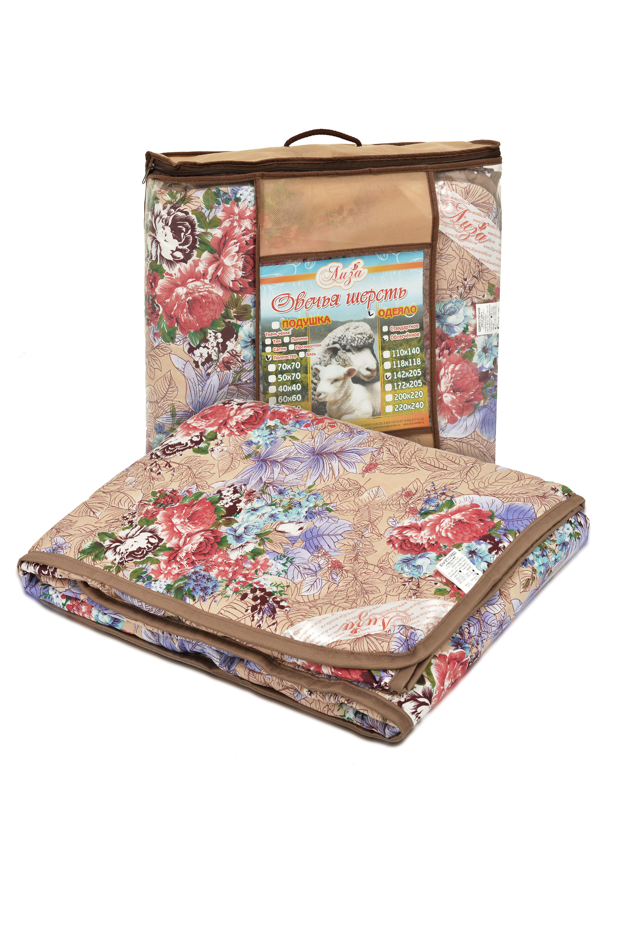 Одеяло с наполнением из термофиксированной овечьей шерсти плотностью 150 гр/кв.м., окантовано широкой тесьмой. Упаковка - сумка ПВХ с ручками.