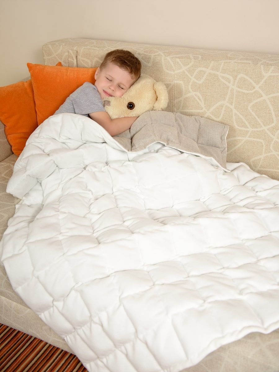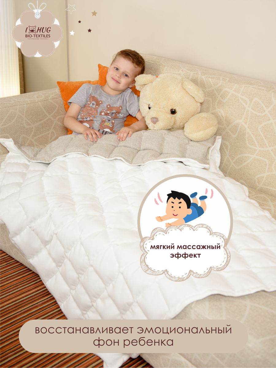 Двусторонее утяжеленное одеяло-плед для детей. С одной стороны – натуральный лён. Благодаря дышащим и охлаждающим свойствам ткани под ним комфортно спать летом. С другой – нежный и мягкий флис, согревающий в прохладное время года. Одеяло состоит из множества ячеек с лузгой гречихи. Благодаря этому наполнитель равномерно распределяется по изделию и не сбивается в один край. Плотно покрывая тело и стимулируя сенсорные рецепторы, одеяло создаёт эффект глубокого массажа. Его мягкое, но весомое давление по ощущениям очень похоже на крепкие объятия. Это успокаивает ребенка и дарит ему чувство уюта и защищенности. Благодаря стимуляции давлением тело расслабляется, улучшается кровоток – сон становится глубоким и ровным. Утяжеленное одеяло стабилизирует эмоциональное состояние ребенка, расслабляет нервную систему и помогает сконцентрироваться на занятиях. Также оно положительно влияет на детей с СДВГ и аутистическими расстройствами, ослабляя симптомы и помогая легче адаптироваться в социуме.