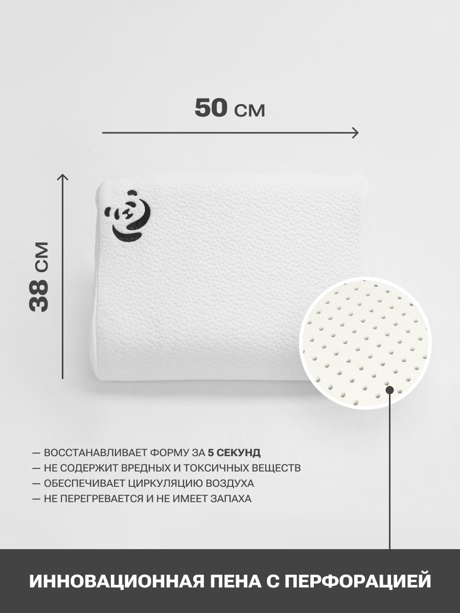 Подушка в форме волны с перфорацией и эффектом памяти поддерживает голову, шею и грудной отдел позвоночника в физиологически правильном положении. Это отличная профилактика остеохондрозов, головных болей, нарушений сна. В конструкции два валика – для сна на боку и спине.