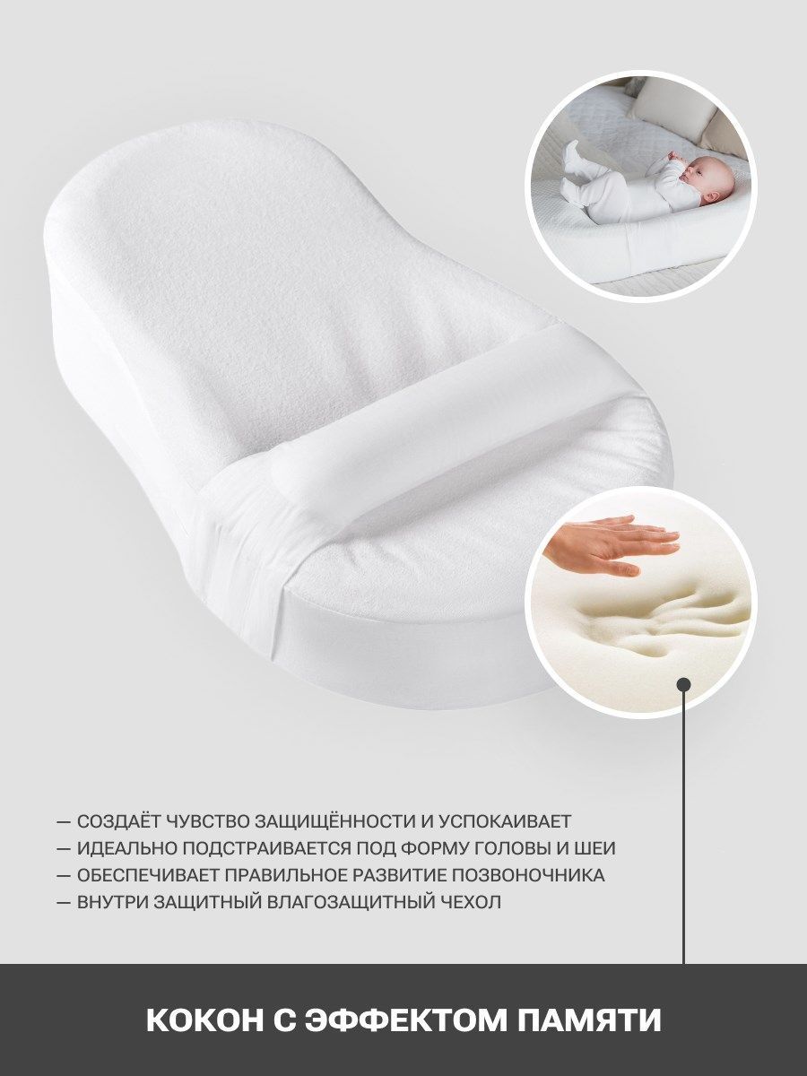 Кокон гнёздышко ортопедический детский от 0+. Удобная люлька создана для новорождённых детей, её можно расположить в кроватке и на диване, удобно использовать для переноски в пределах дома и дачи. Инновационный материал с эффектом памяти мягкий и упругий поддержит ребёнка. Анатомическая форма гнездышка выполнена с учетом особенностей младенца, наличие бортиков создает ощущения как у мамы в животике, благодаря им он чувствует себя спокойно, а сон станет крепче. В комплекте валик под ноги,поможет создать "привычное положение" , широкий пояс на липучке поможет зафиксировать малыша для безопасности. Верхняя поверхность внутреннего чехла выполнена из мулетона - махровой ткани с водонепроницаемой мембраной, которая надежно защитит кокон от влаги. Модель удобна для кормления и совместного сна с родителями. Матрас-кокон для сна полезный подарок будущей маме, на выписку, крестины на рождение. Универсален для мальчика и девочки его можно использовать как колыбель для новорожденного даже на полу.