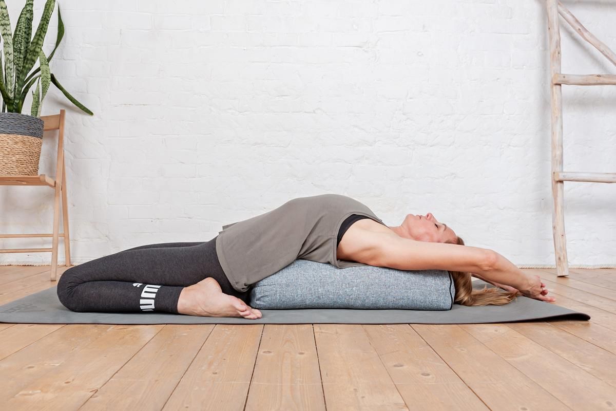 Можно выполнять упражнения с наклоном вперед, в этом случае болстер будет служить опорой там, где вашему телу не хватает растяжки, а вы сможете расслабить мышцы.