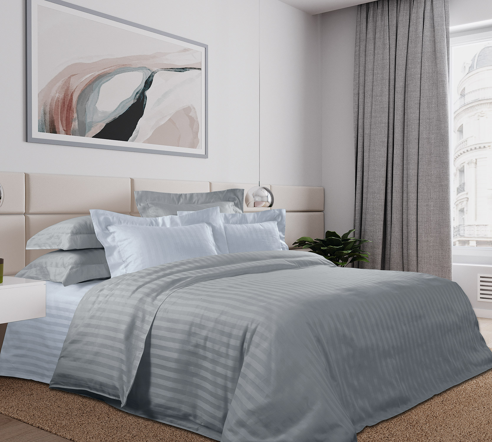 Комплект выполнен из пакистанского хлопка высшего качества, ткани страйп-сатин, прочной, износоустойчивой и очень красивой. Мягкость и блеск ее часто сравнивают с шелком. На поверхности можно рассмотреть чередующиеся глянцевые и матовые полоски, образованные благодаря особому способу переплетения нитей. Ширина контрастной полоски 2 см.