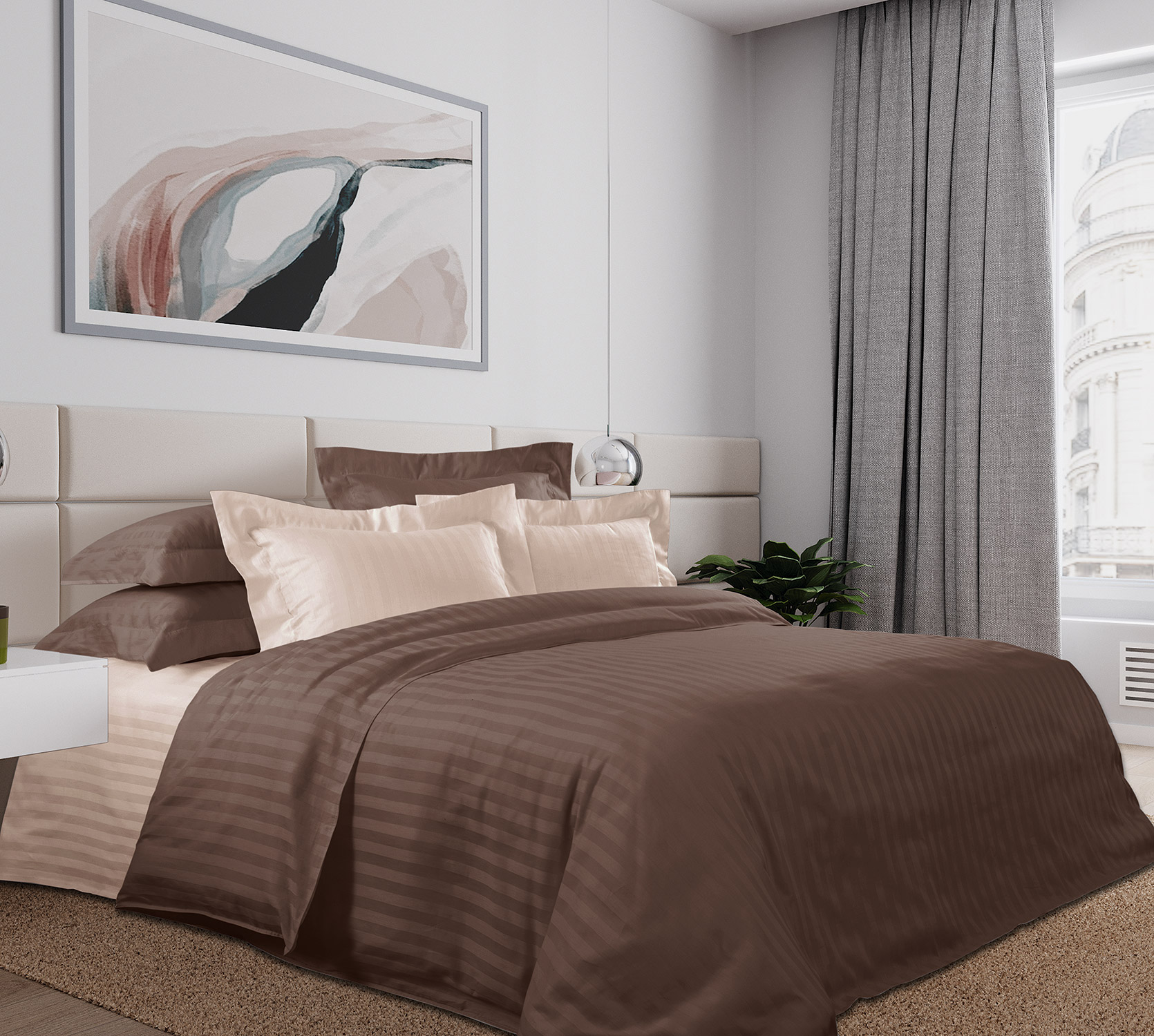 Комплект выполнен из пакистанского хлопка высшего качества, ткани страйп-сатин, прочной, износоустойчивой и очень красивой. Мягкость и блеск ее часто сравнивают с шелком. На поверхности можно рассмотреть чередующиеся глянцевые и матовые полоски, образованные благодаря особому способу переплетения нитей. Ширина контрастной полоски 2 см.