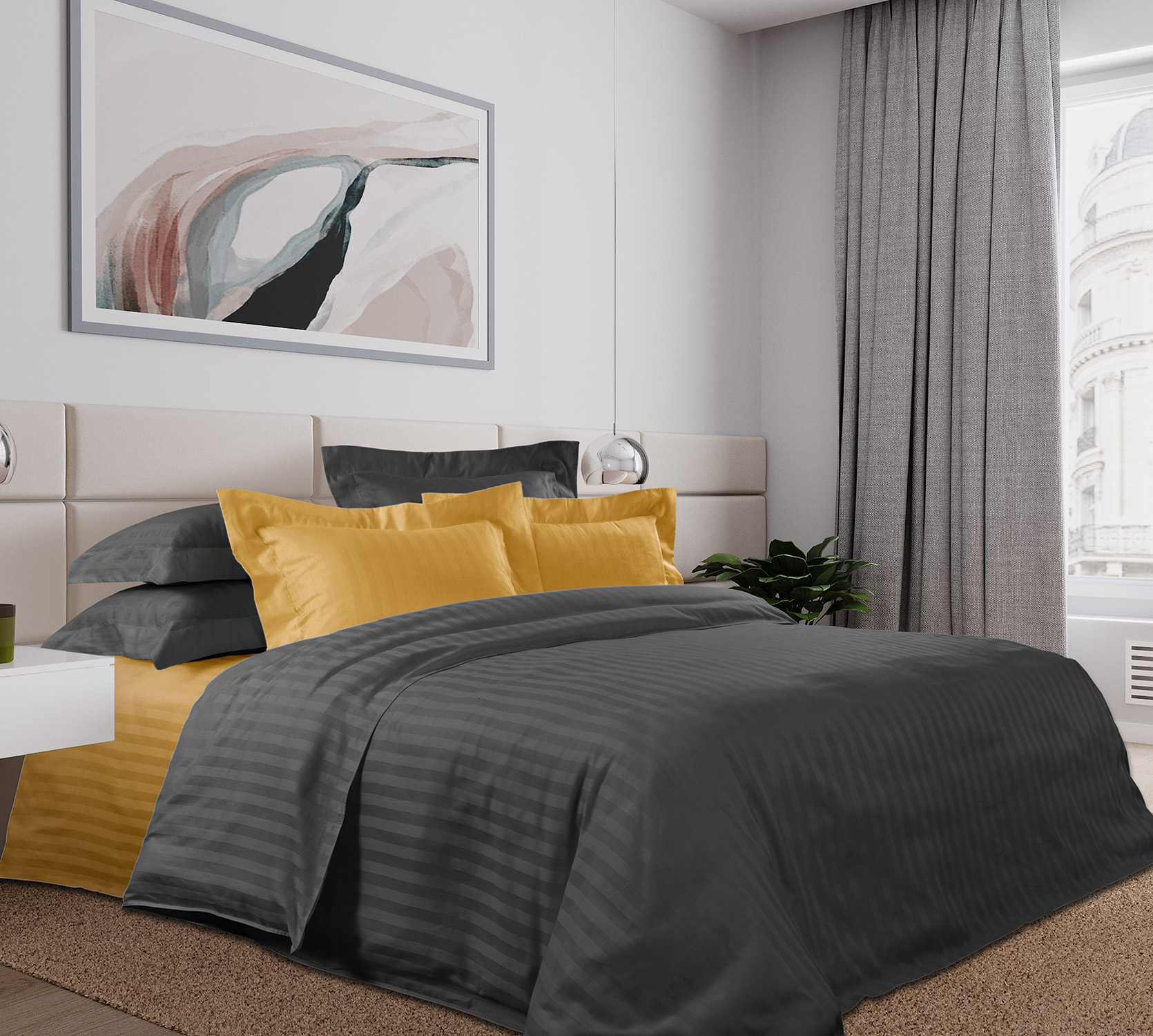 Комплект выполнен из пакистанского хлопка высшего качества, ткани страйп-сатин, прочной, износоустойчивой и очень красивой. Мягкость и блеск ее часто сравнивают с шелком. На поверхности можно рассмотреть чередующиеся глянцевые и матовые полоски, образованные благодаря особому способу переплетения нитей. Ширина контрастной полоски 2 см.