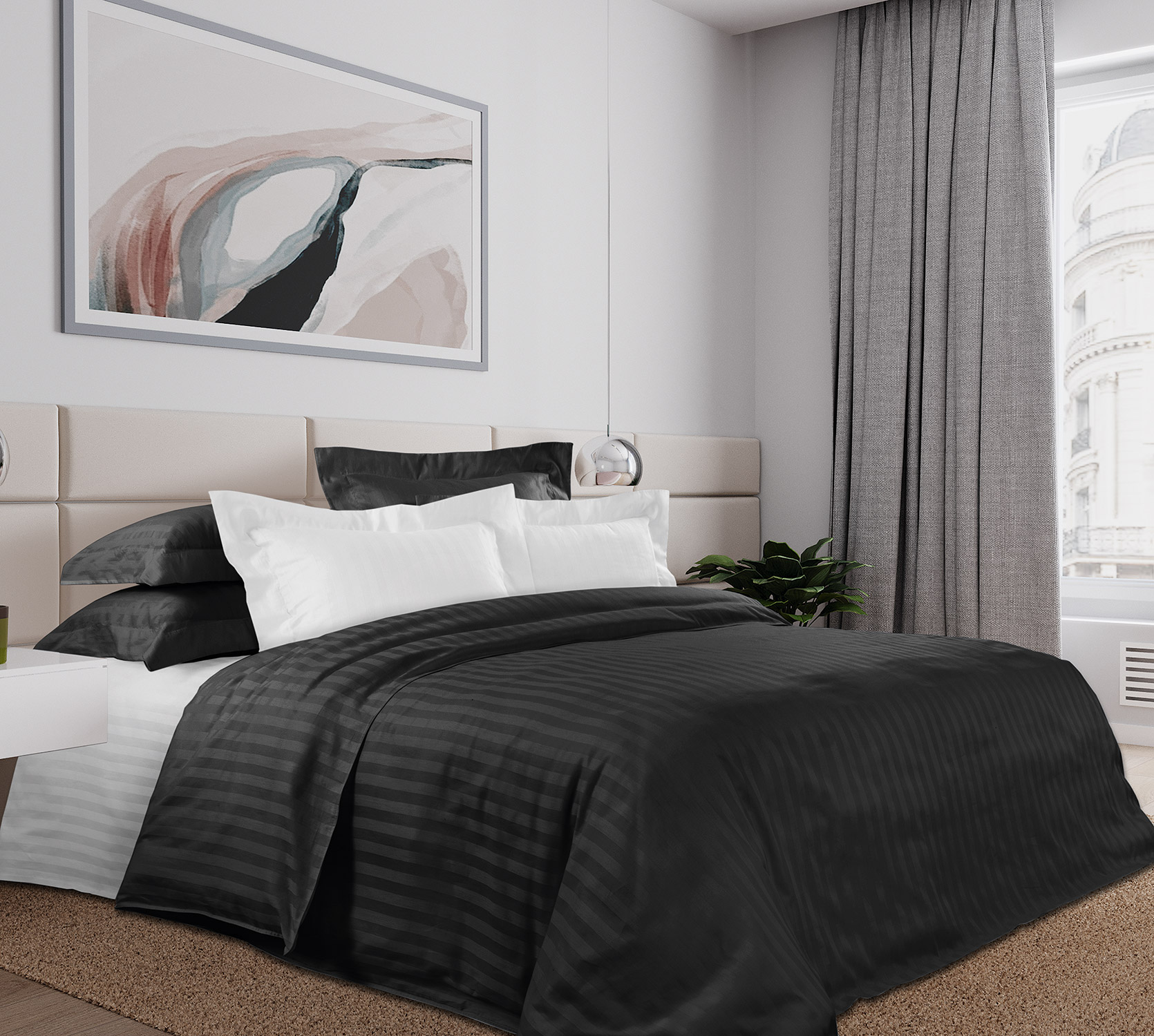 Комплект выполнен из пакистанского хлопка высшего качества, ткани страйп-сатин, прочной, износоустойчивой и очень красивой. Мягкость и блеск ее часто сравнивают с шелком. На поверхности можно рассмотреть чередующиеся глянцевые и матовые полоски, образованные благодаря особому способу переплетения нитей. Ширина контрастной полоски 2 см.