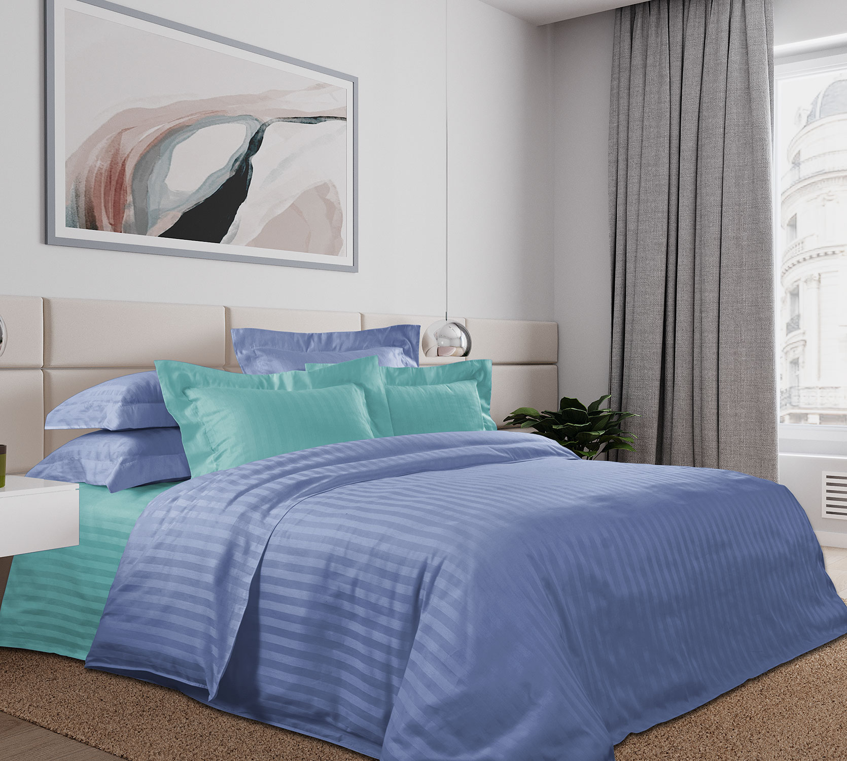 Комплект выполнен из пакистанского хлопка высшего качества, ткани страйп-сатин, прочной, износоустойчивой и очень красивой. Мягкость и блеск ее часто сравнивают с шелком. На поверхности можно рассмотреть чередующиеся глянцевые и матовые полоски, образованные благодаря особому способу переплетения нитей. Ширина контрастной полоски 2 см.