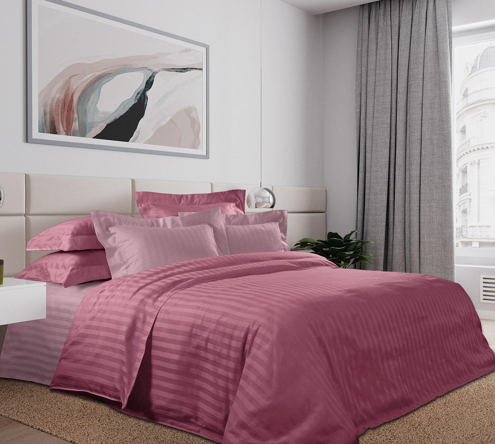 Комплект выполнен из пакистанского хлопка высшего качества, ткани страйп-сатин, прочной, износоустойчивой и очень красивой. Мягкость и блеск ее часто сравнивают с шелком. На поверхности можно рассмотреть чередующиеся глянцевые и матовые полоски, образованные благодаря особому способу переплетения нитей. Ширина контрастной полоски 2 см.