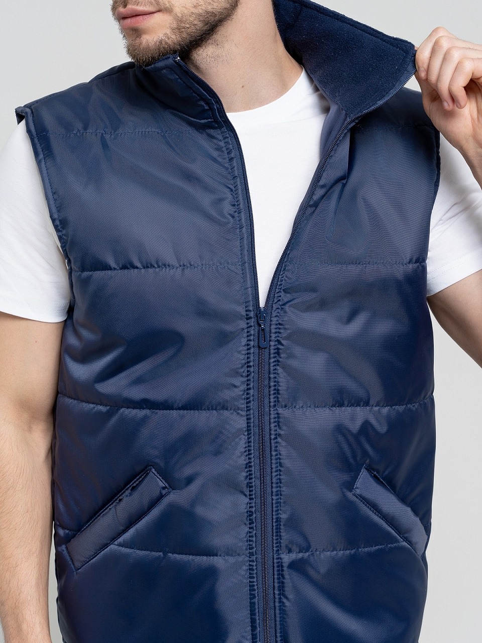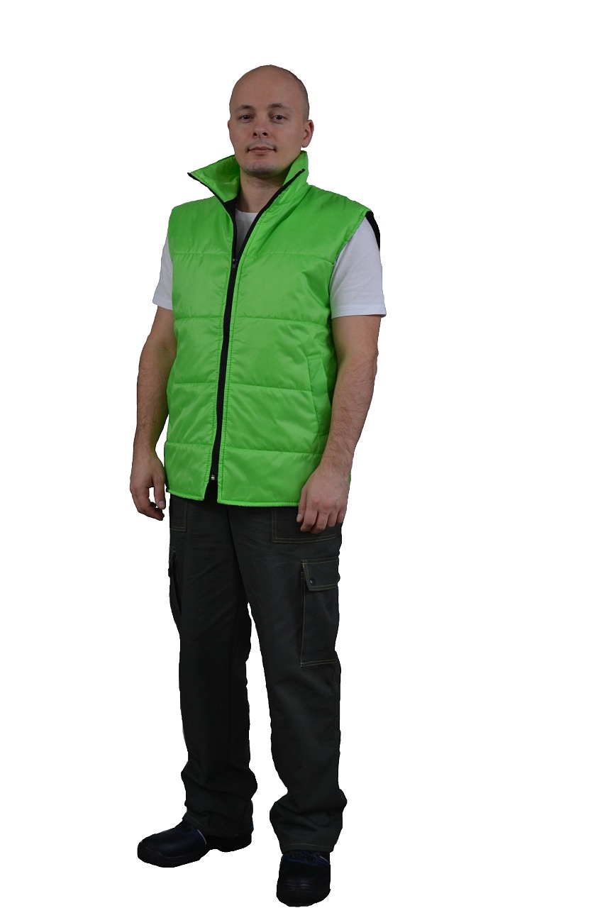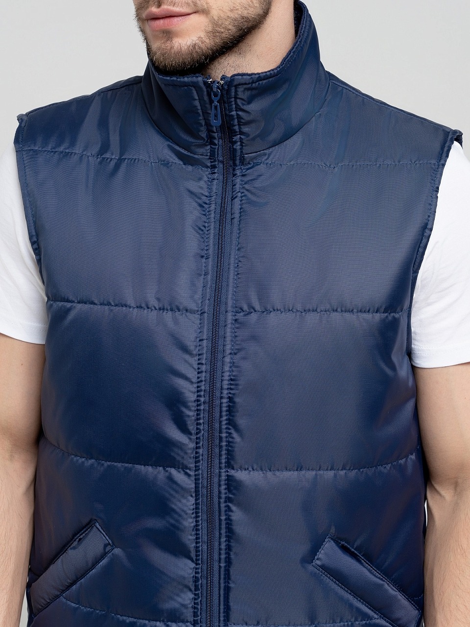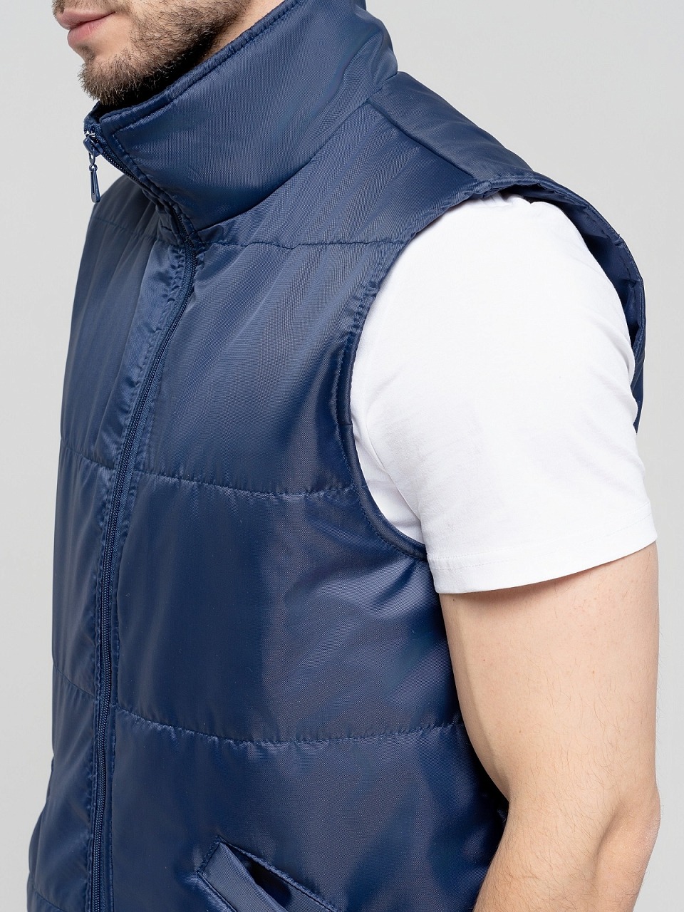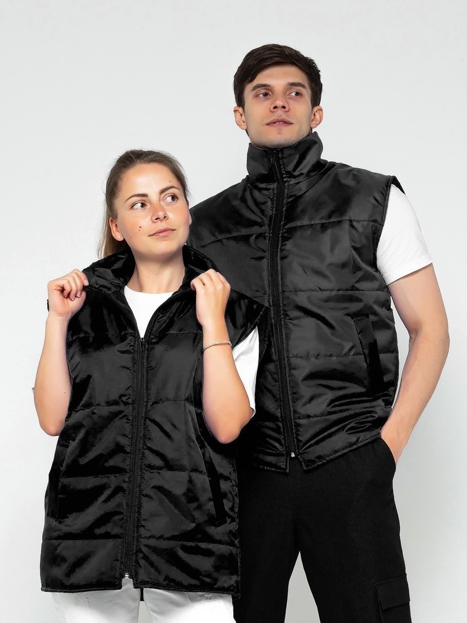 Жилет утепленный 3.9.4.49 прямого силуэта с центральной застёжкой на молнию.