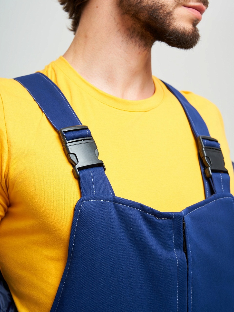 Полукомбинезон с застежкой на тесьму – молнию по передним половинкам, с регулирующимися бретелями. Передние половинки цельнокроеные. По верхним частям передних половинок расположены боковые накладные карманы с наклонным входом. Задняя часть цельнокроеная. По нижней части полукомбинезона настрочена светоотражающая лента шириной 50мм.
