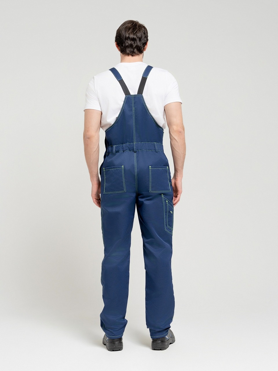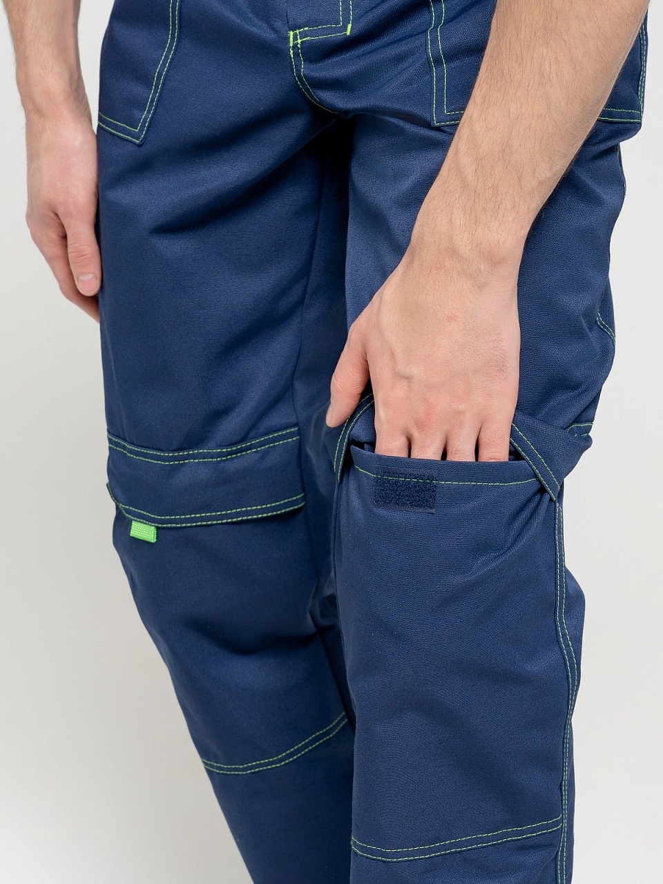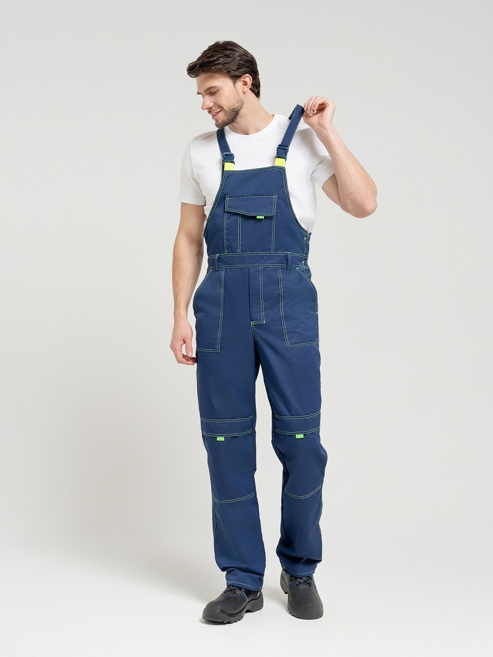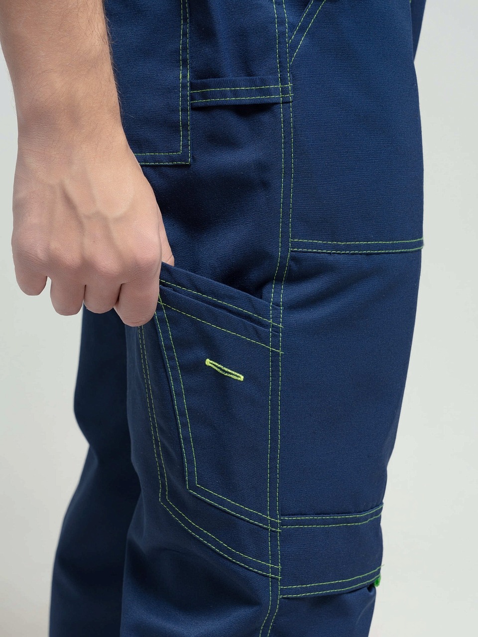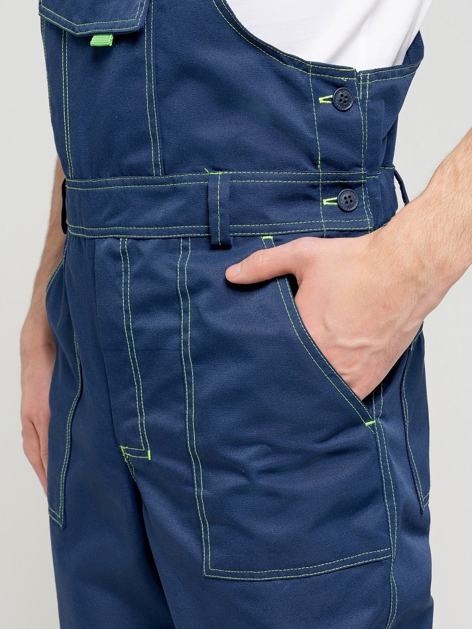 Полукомбинезон с застежкой гульф тесьма молния, застежкой в левом боковом шве на три обметанные петли и пуговицы, с регулирующимися бретелями. Передняя половинка состоит из верхней и нижней частей, соединенных поясом. По поясу проходит пять шлевок. По нижним частям передних половинок расположены боковые накладные карманы с наклонным входом, на правой половинке - 2 накладных кармана под инструменты. На верхней части нагрудный карман с двумя отделами, закрытый клапаном на контактной ленте «Велькро» . Задняя часть стачная. В области талии втачная резинка. На задней половинке два накладных кармана. На передних половинках в области колен усиление-карман, для вставки наколенника. Все элементы и места стачивания обработаны двойной контрастной строчкой.