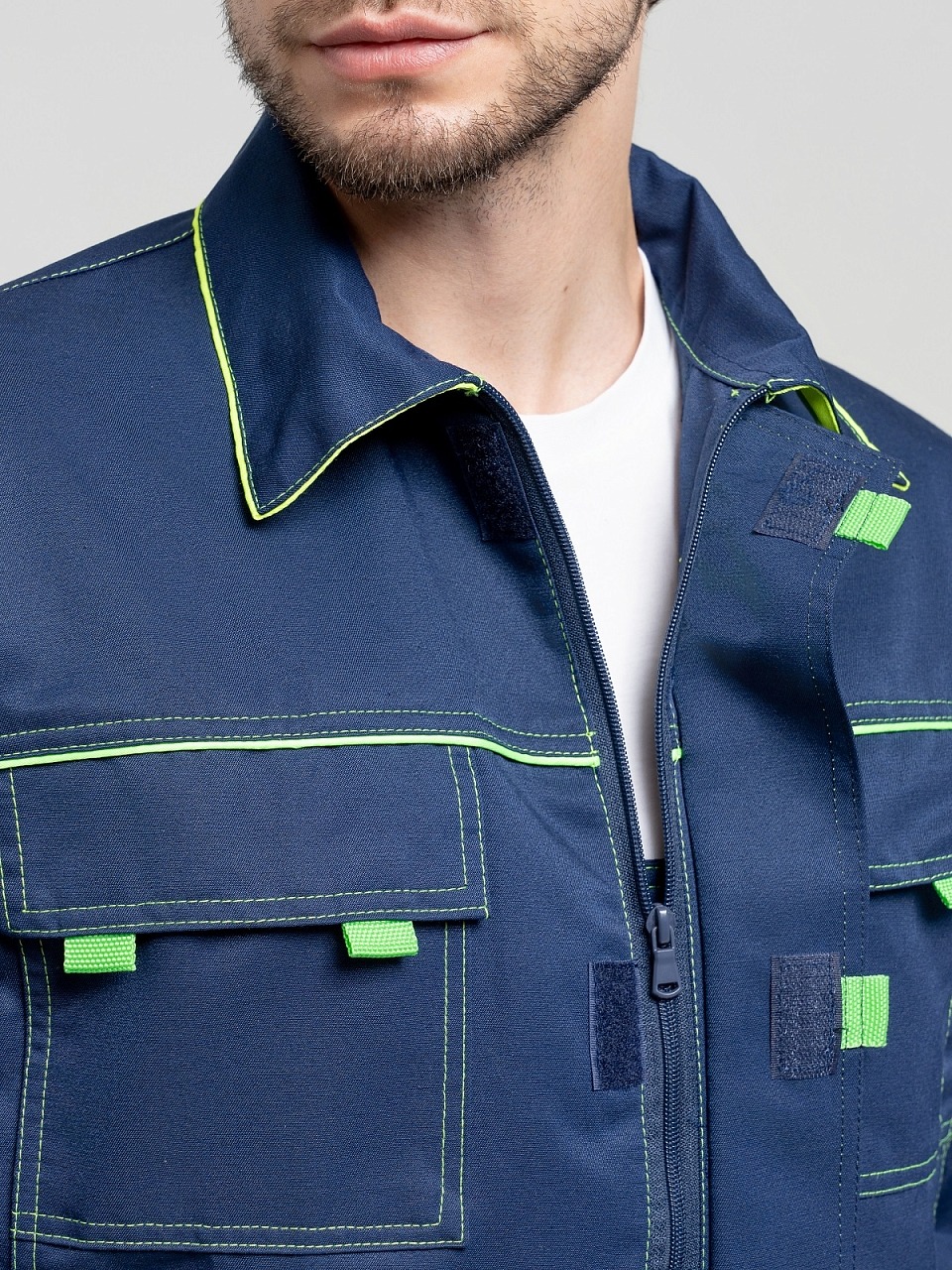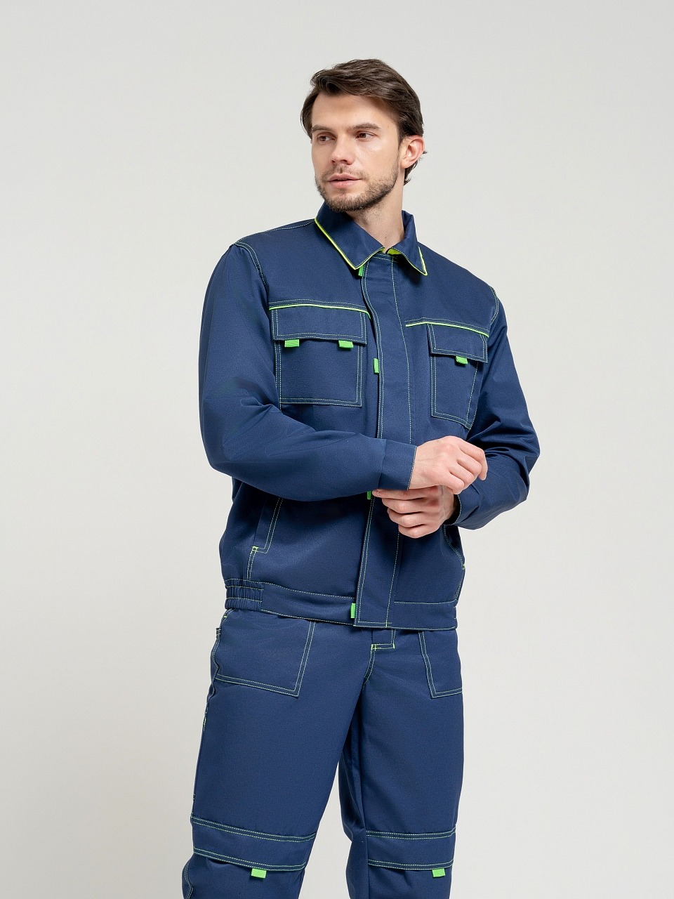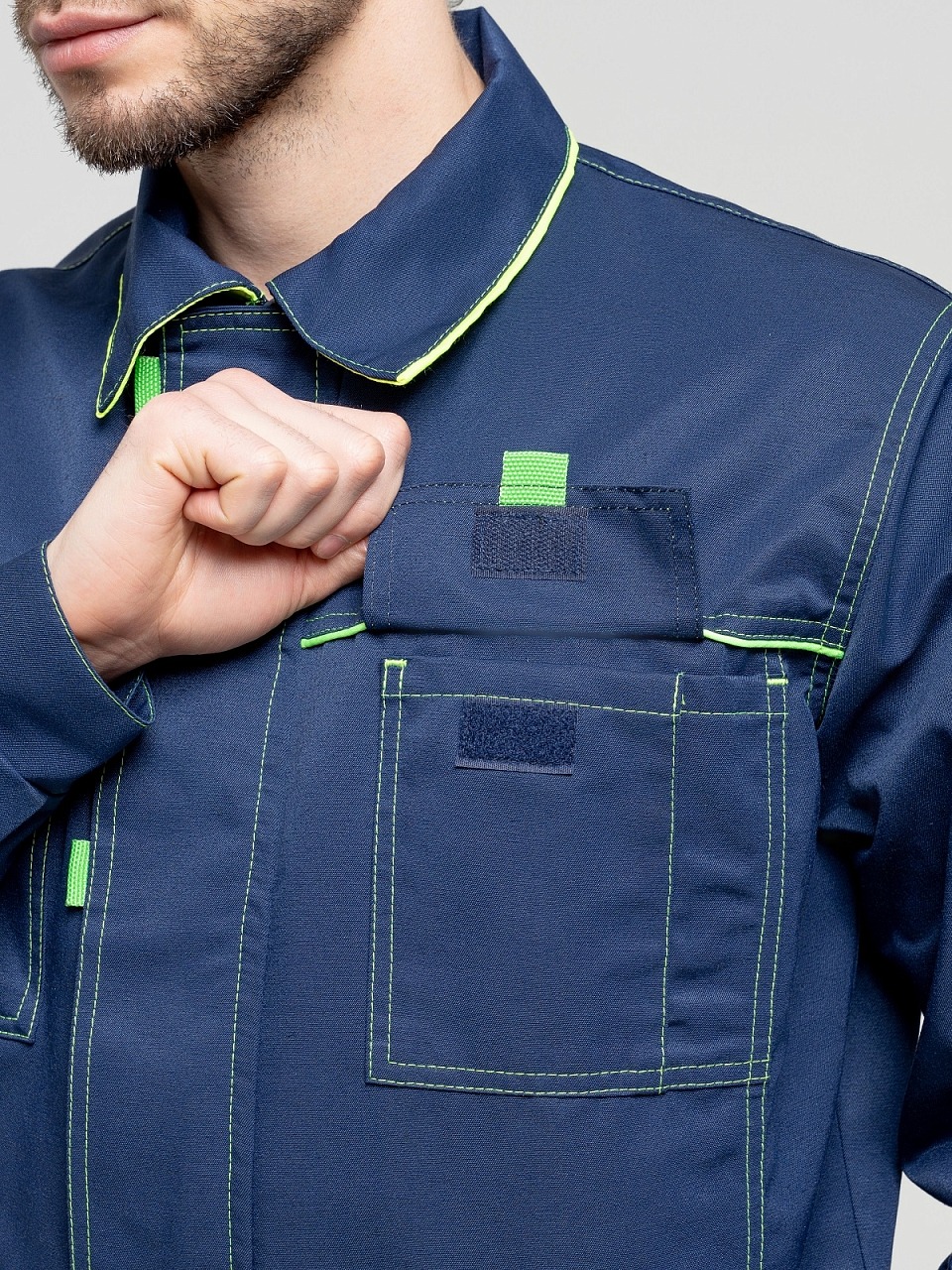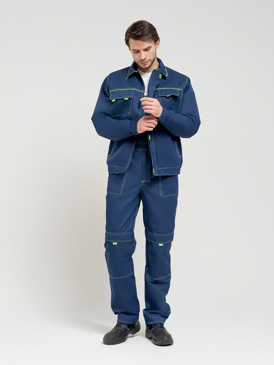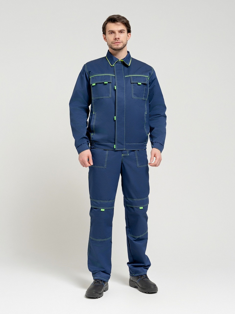 Полукомбинезон с застежкой гульф тесьма молния, застежкой в левом боковом шве на три обметанные петли и пуговицы, с регулирующимися бретелями. Передняя половинка состоит из верхней и нижней частей, соединенных поясом. По поясу проходит пять шлевок. По нижним частям передних половинок расположены боковые накладные карманы с наклонным входом, на правой половинке - 2 накладных кармана под инструменты. На верхней части нагрудный карман с двумя отделами, закрытый клапаном на контактной ленте «Велькро» . Задняя часть стачная. В области талии втачная резинка. На задней половинке два накладных кармана. На передних половинках в области колен усиление-карман, для вставки наколенника. Все элементы и места стачивания обработаны двойной контрастной строчкой.