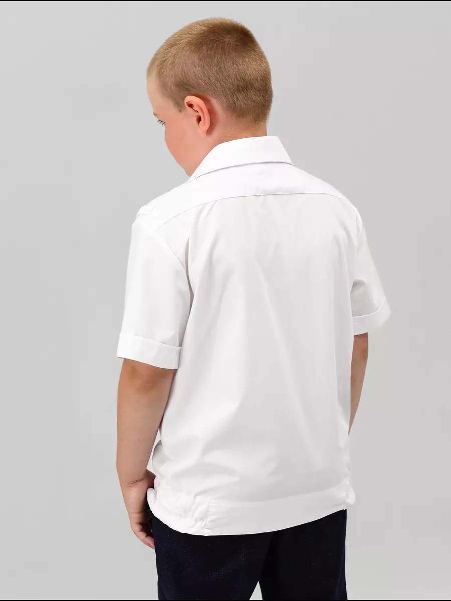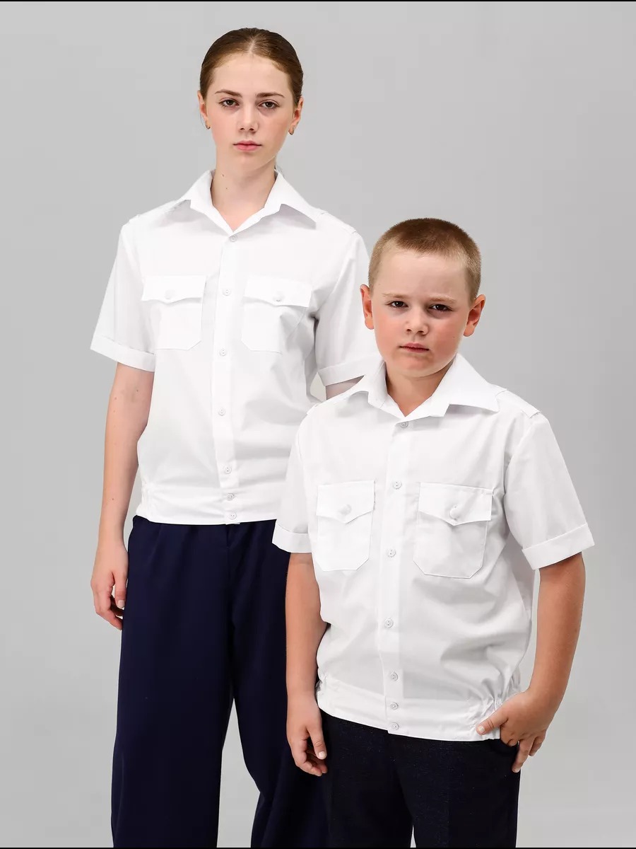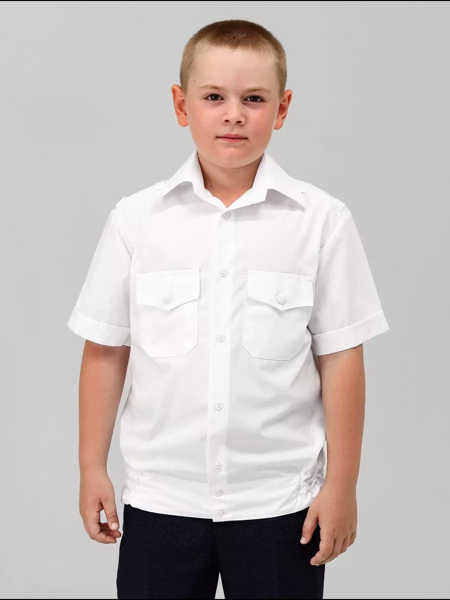 Рубашка форменная учебная с коротким рукавом для мальчиков и девочек Кадетов строгая, МО, Министерства обороны. с застежкой до низа на восемь-девять пуговиц. Полочки рубашек с верхними накладными карманами с защипами, с клапанами, застегивающимися на пуговицы. Спинка с кокеткой. Рубашка казачья с цельнокроеным поясом, стянутым в области боковых швов эластичными лентами. Воротник отложной с отрезной стойкой. Шлевки для погон. Сорочка форменная для кадетов.