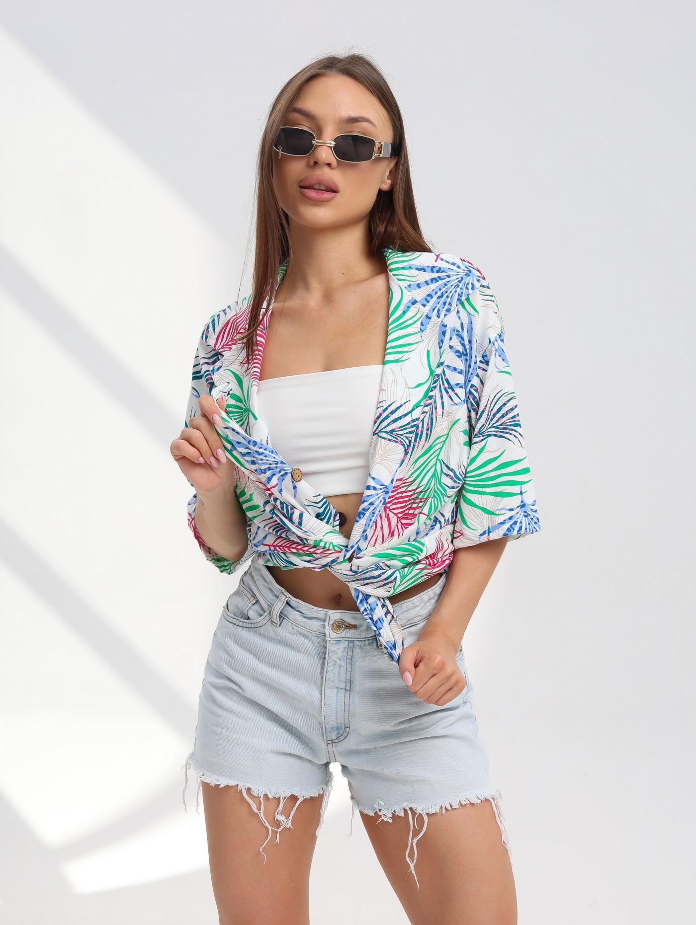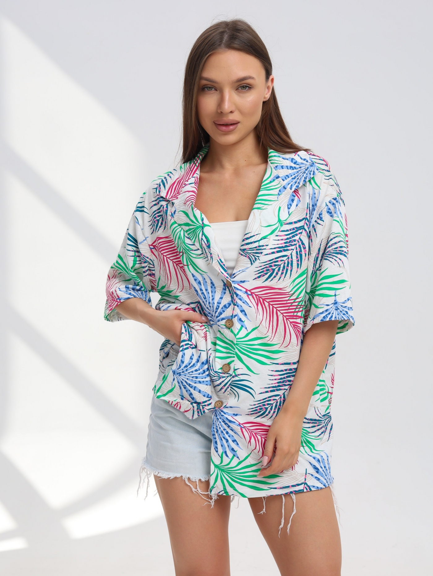 Женская рубашка Р3163.1 отшивается из трикотажного полотна, кулирки. Женская рубашка с застежкой на пуговицы имеет яркие летние расцветки и широкий размерный ряд.