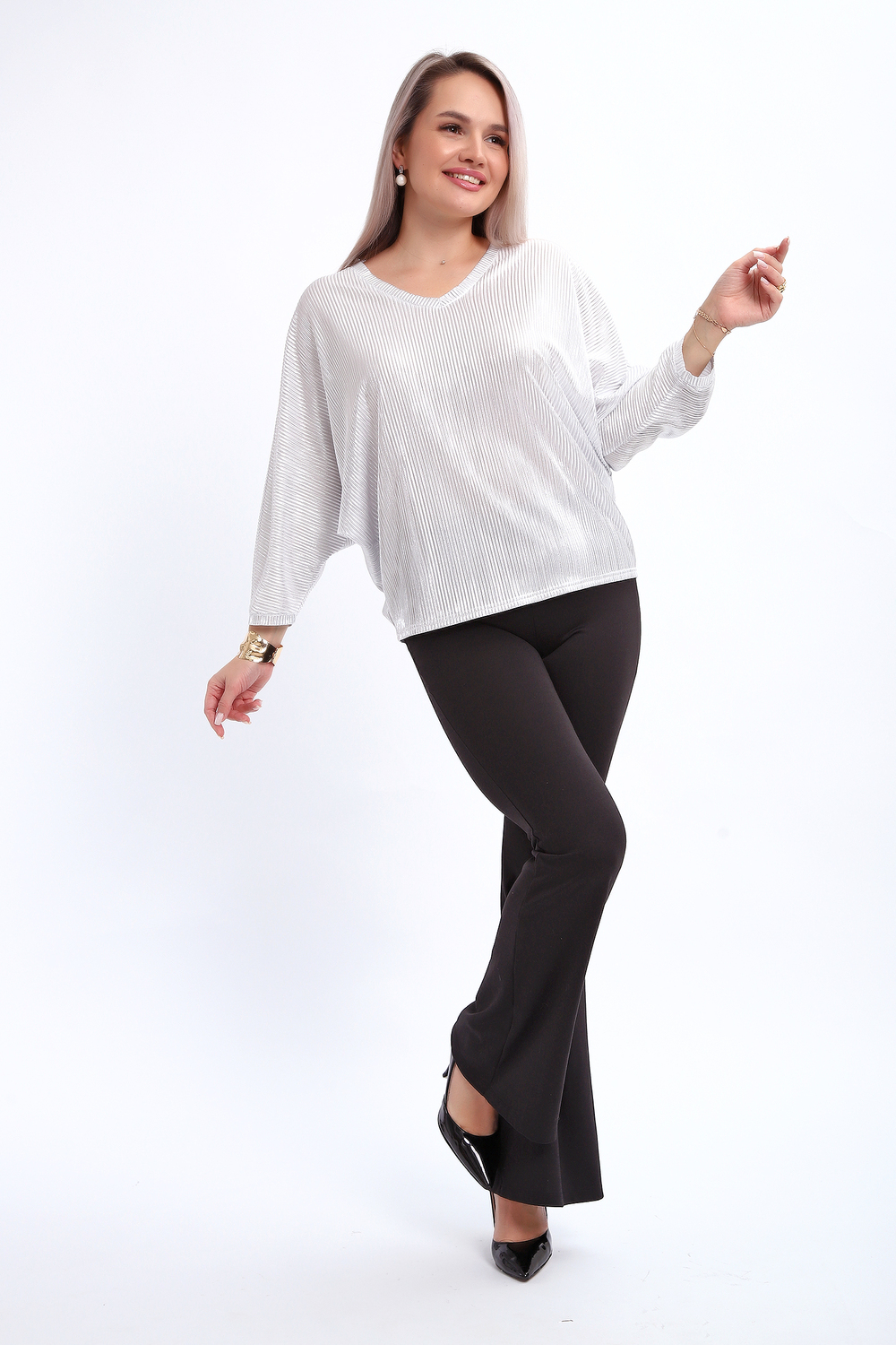 Сделайте акцент на вашем стиле с помощью комфортной и изысканной блузки. Нарядная кофта - это необходимый предмет в любом гардеробе. Благодаря свободному крою, она идеально садится на любую фигуру, скрывая то, что хотелось бы спрятать и подчеркивая достоинства. Блузка выигрышно смотрится за счет ткани атлас гофре со стойким напылением фойл, которое не осыпается в процессе носки и после стирки. Ткань атлас гофре хорошо тянется и драпируется, имеет мягкий благородный блеск и совершенно не мнется. Крой блузки лаконичен, без лишних деталей, рукав летучая мышь не сковывает движений, имеет длину 3/4 и оканчивается небольшим манжетом. V-образный воротник зрительно удлиняет шею, обработан обтачкой, длина блузки до линии бедра. Легкая изящная блузка отлично впишется в вечерний наряд, а также будет блестящим дополнением к деловому и повседневному образу.