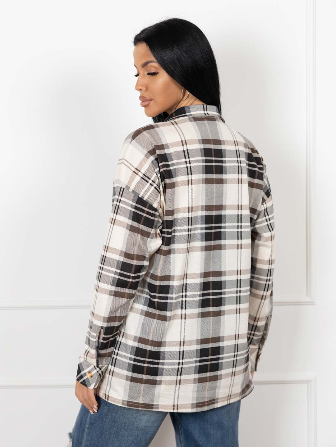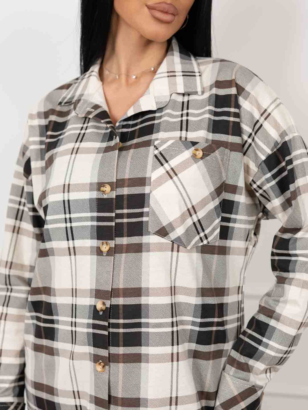 Женская рубашка из хлопка в клетку, с отложным воротником, втачным рукавом со шлицей и манжетой на пуговице, на полочке накладной карман. Манжета и карманы раскроены под 45 градусов. Трендовая рубашка дополнена декоративными костяными пуговицами.