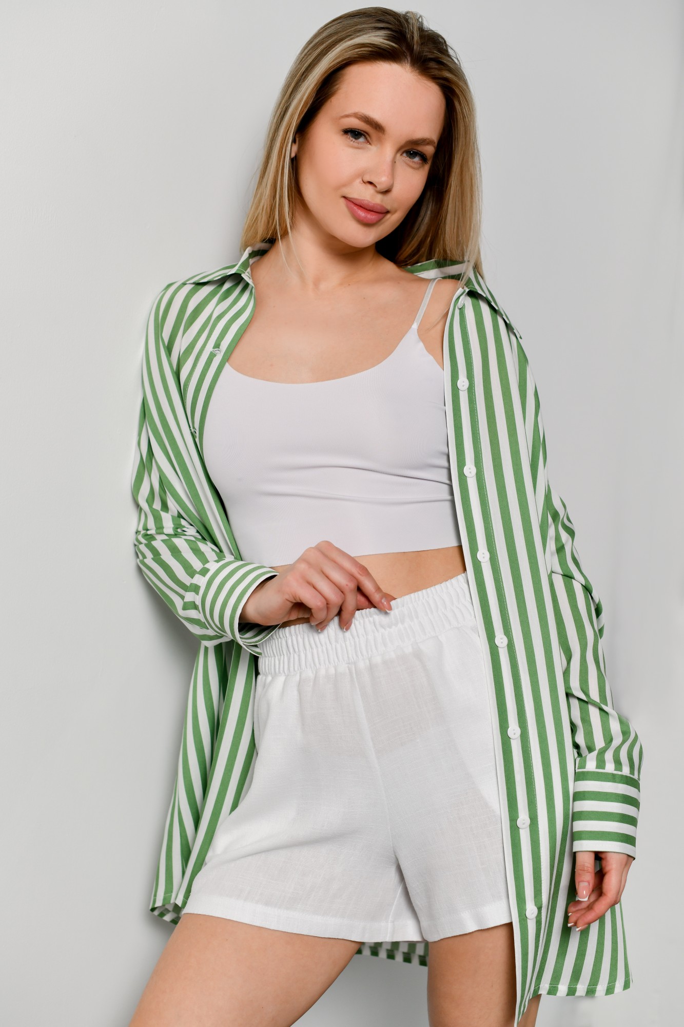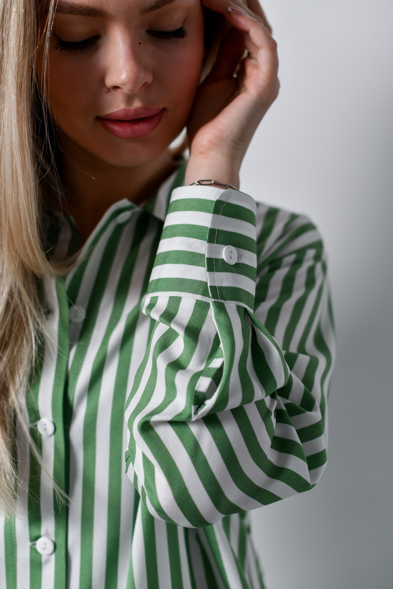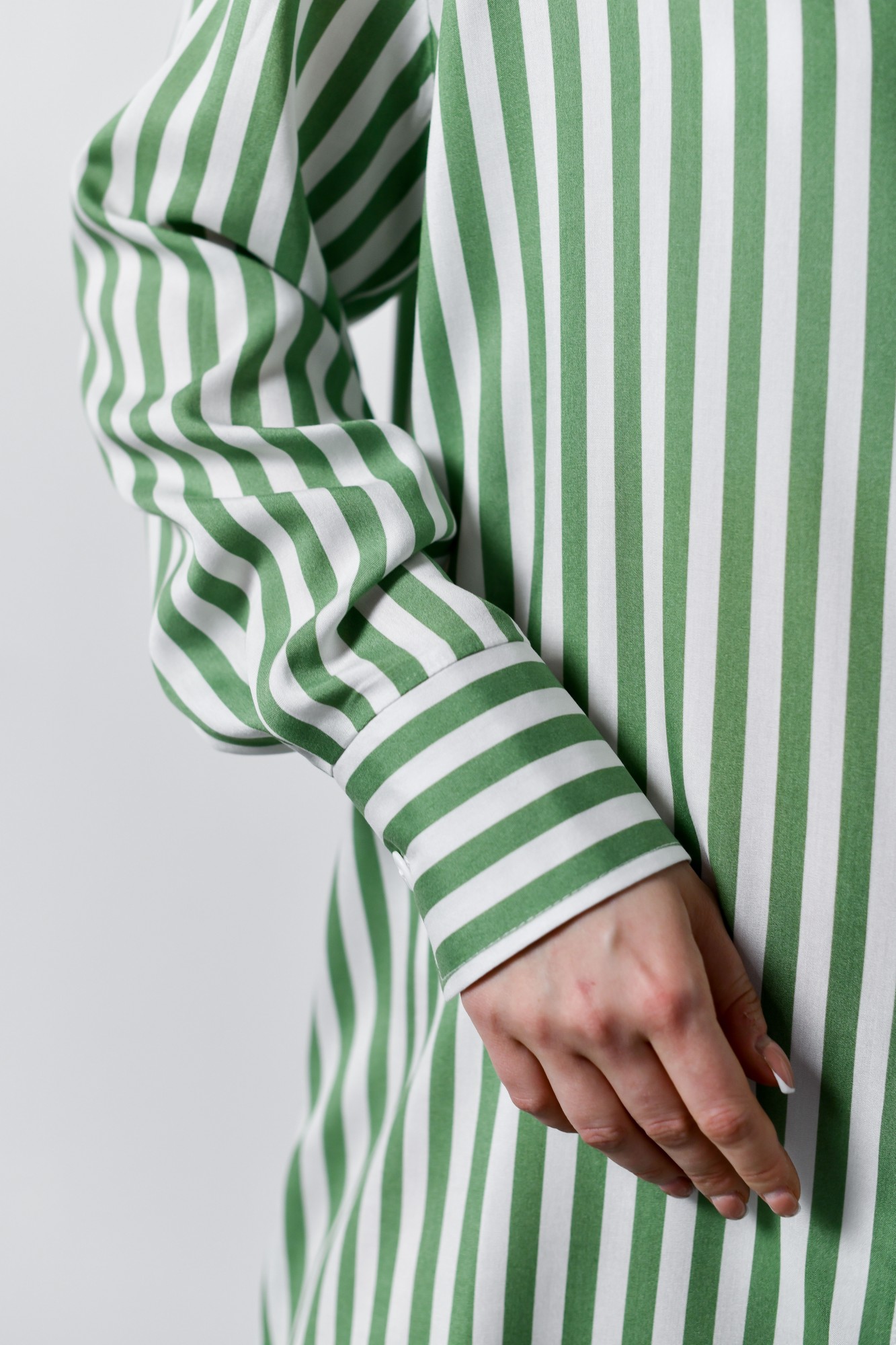 Блузка-рубашка женская из штапельного полотна с набивным рисунком «полоска», свободного кроя, удлиненная, со стояче-отложным воротником, спущенным длинным рукавом. Перед из двух частей с центральной бортовой застежкой на петли и пуговицы, спинка цельнокроеная. Низ рукава с притачной манжетой, застегивающейся на петлю и пуговицу.