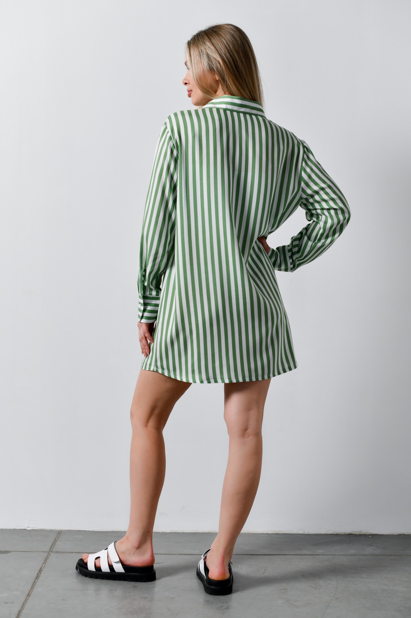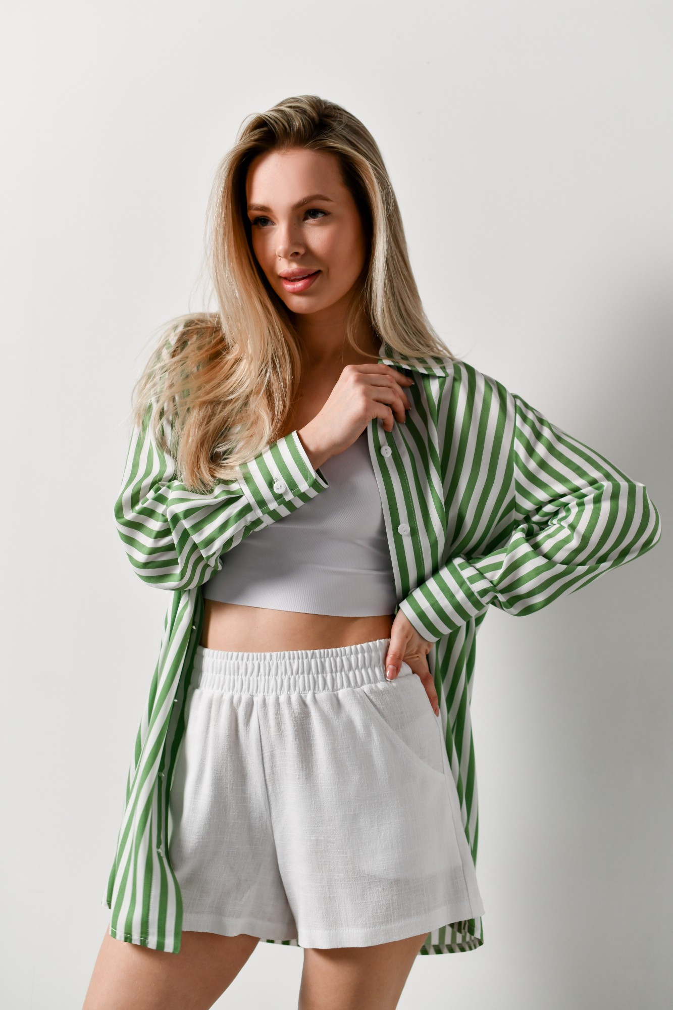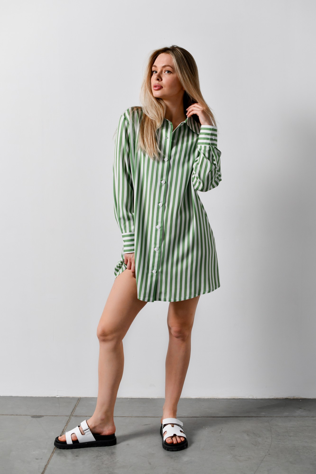 Блузка-рубашка женская из штапельного полотна с набивным рисунком «полоска», свободного кроя, удлиненная, со стояче-отложным воротником, спущенным длинным рукавом. Перед из двух частей с центральной бортовой застежкой на петли и пуговицы, спинка цельнокроеная. Низ рукава с притачной манжетой, застегивающейся на петлю и пуговицу.