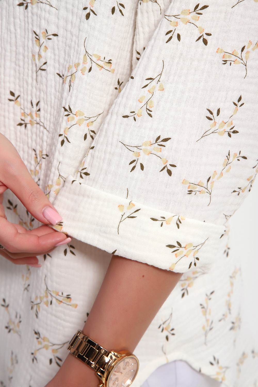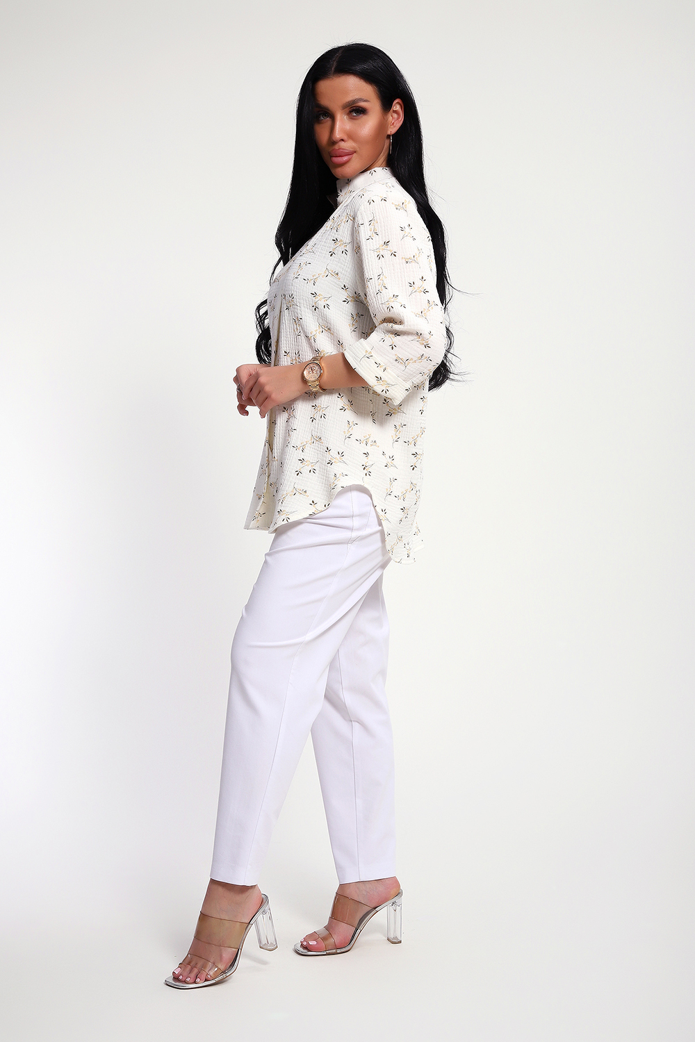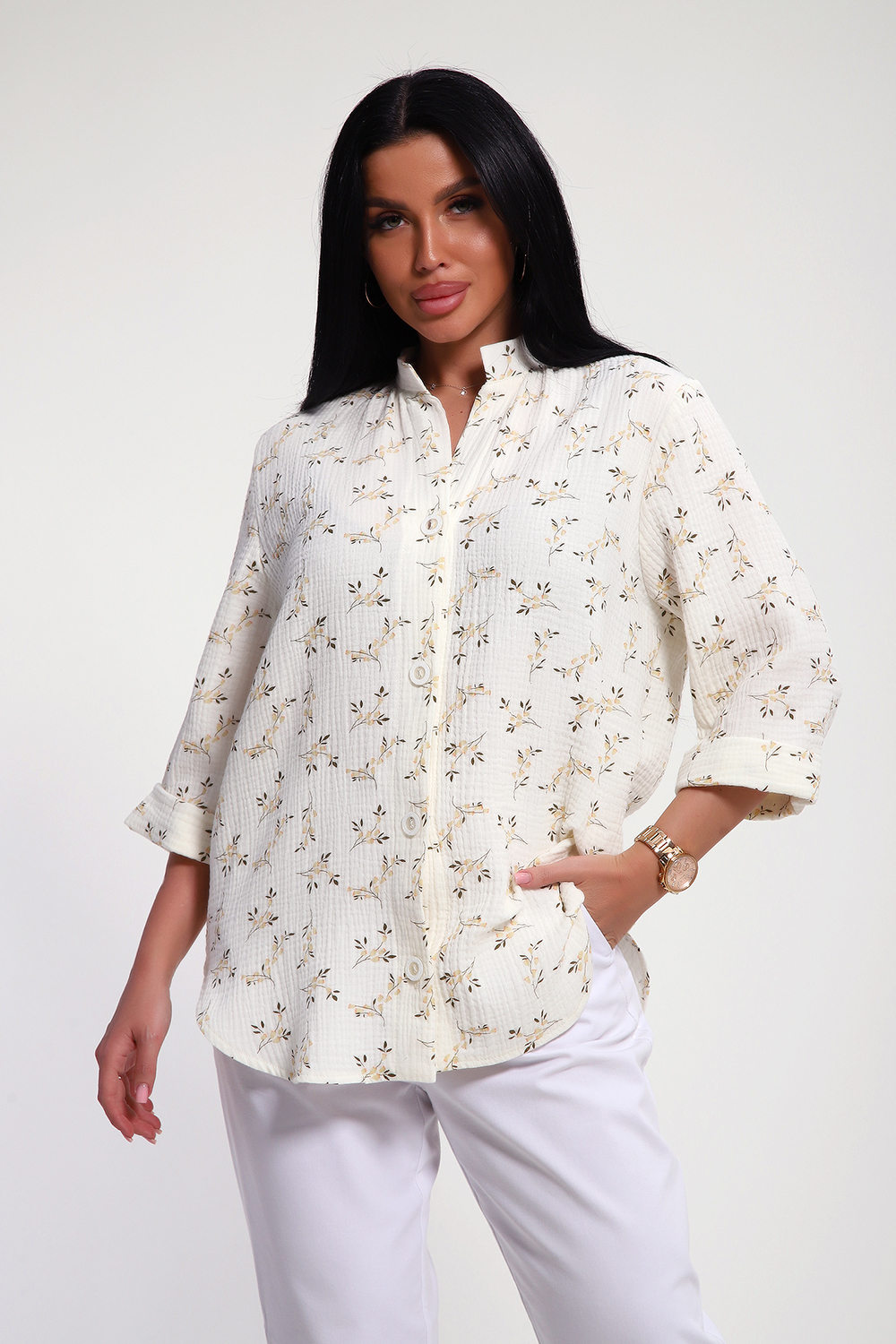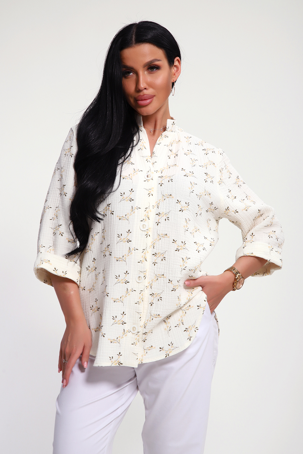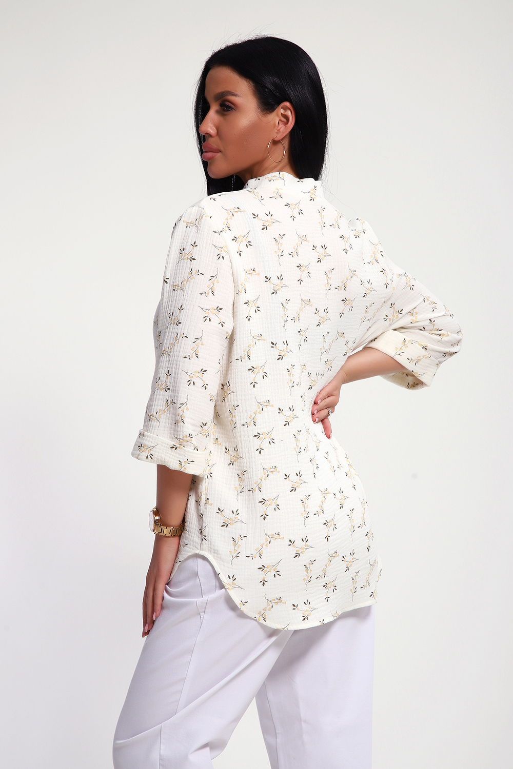 Свободный крой, удлиненный силует, фигурный низ рубашки, рукава 3/4 с манжетом, аккуратная стойка по горловине - эта модель воплощает в себе утонченную непринужденность и безупречный вкус. Застежка на петли и пуговицы образуют V-образный вырез по горловине, что удлиняет шею и подчеркивает женственность образа.
