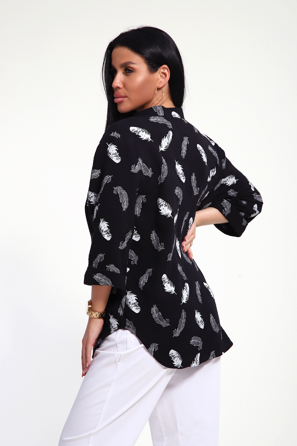 Свободный крой, удлиненный силует, фигурный низ рубашки, рукава 3/4 с манжетом, аккуратная стойка по горловине - эта модель воплощает в себе утонченную непринужденность и безупречный вкус. Застежка на петли и пуговицы образуют V-образный вырез по горловине, что удлиняет шею и подчеркивает женственность образа.