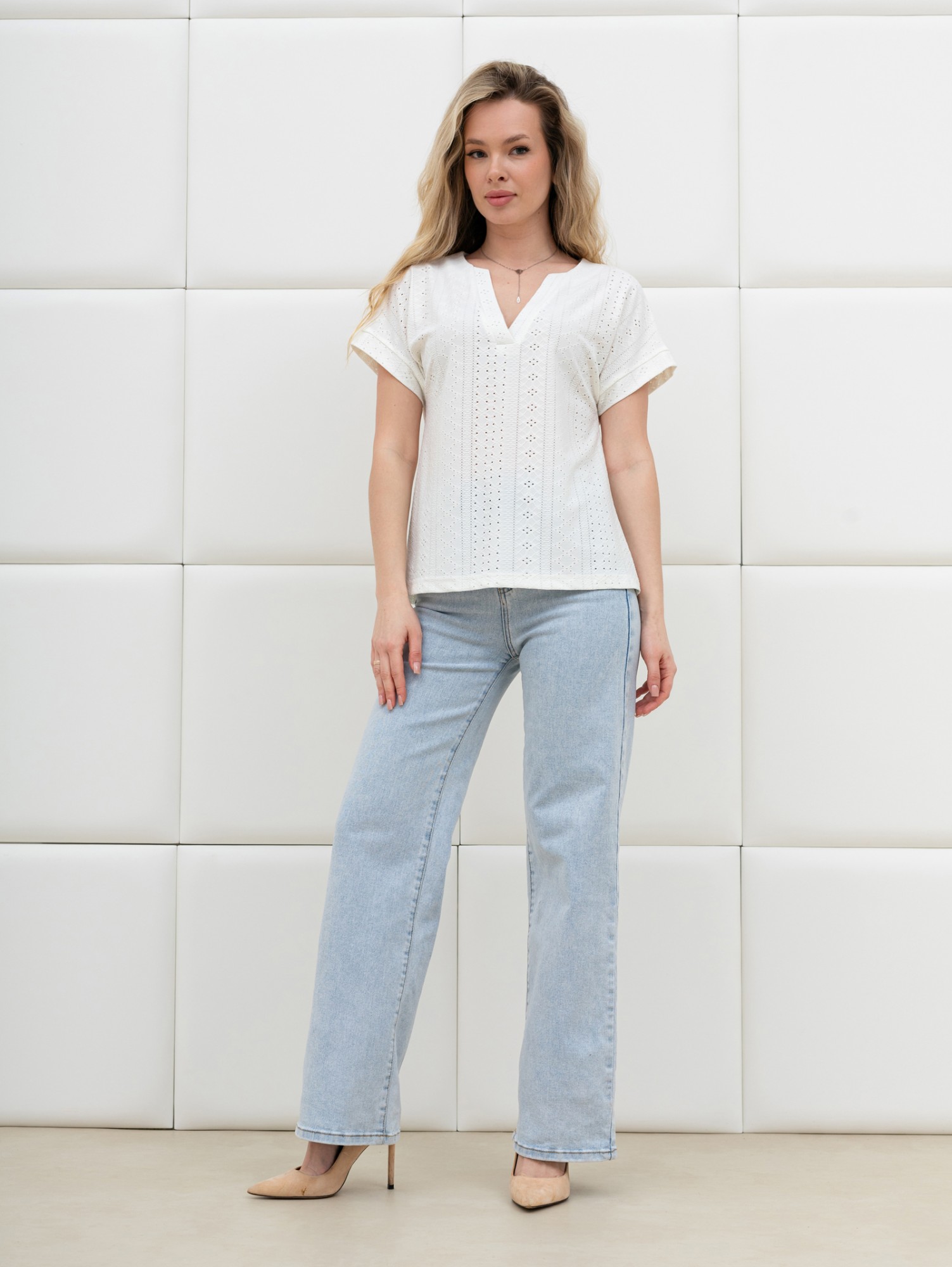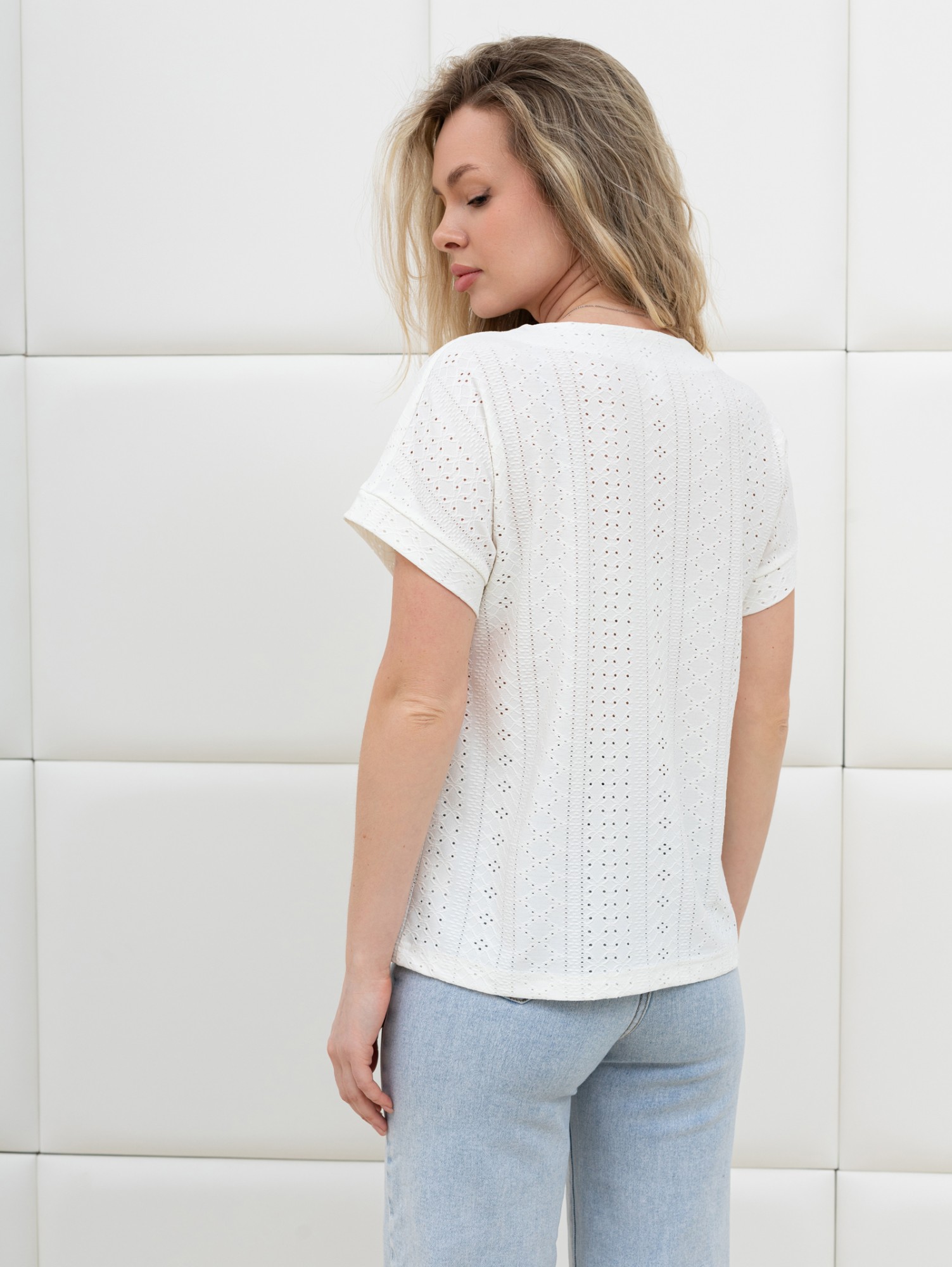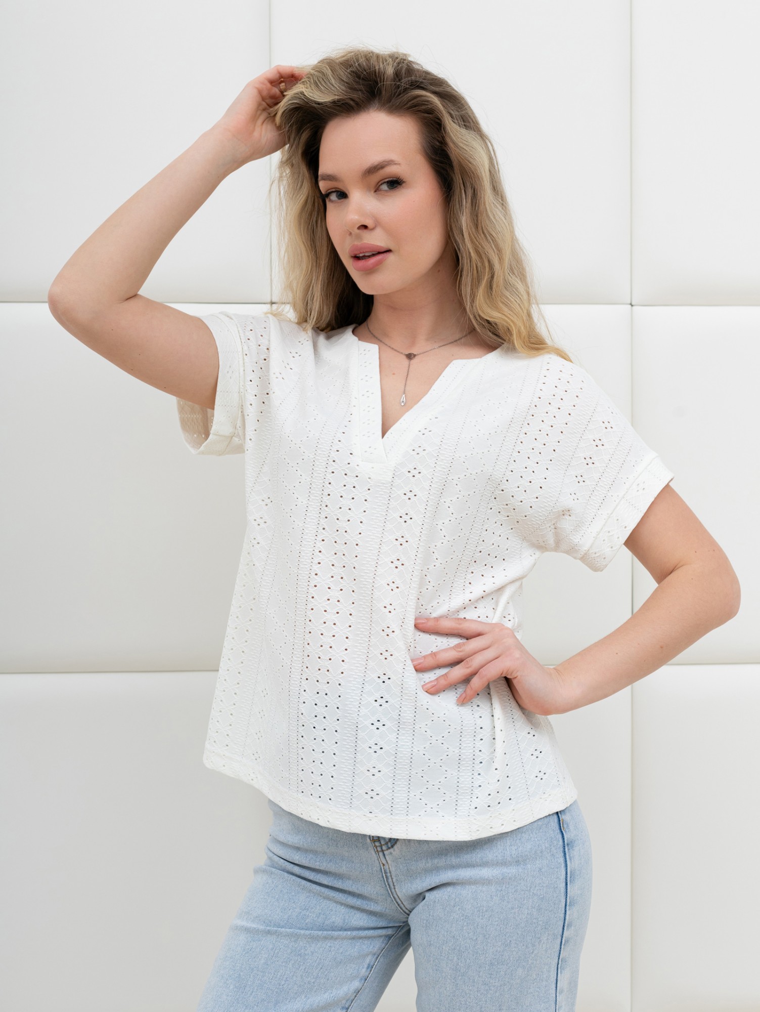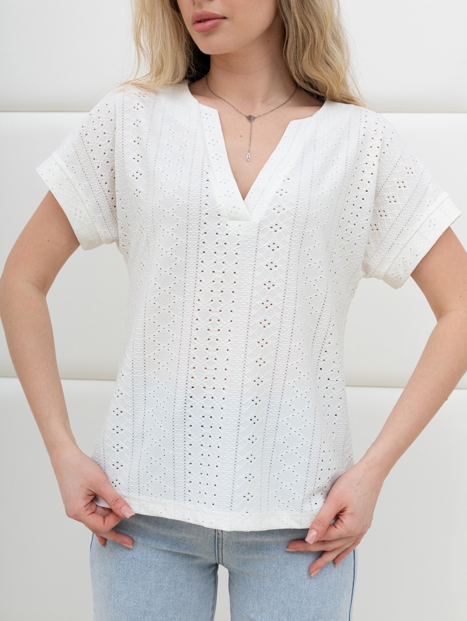 Блуза женская из гладкокрашеного трикотажного полотна «шитье», полуприталенного силуэта, с глубоким V-образным вырезом горловины, обработанным косыми планками, короткими цельнокроеными рукавами. Нижние срезы рукавов с притачными манжетами.